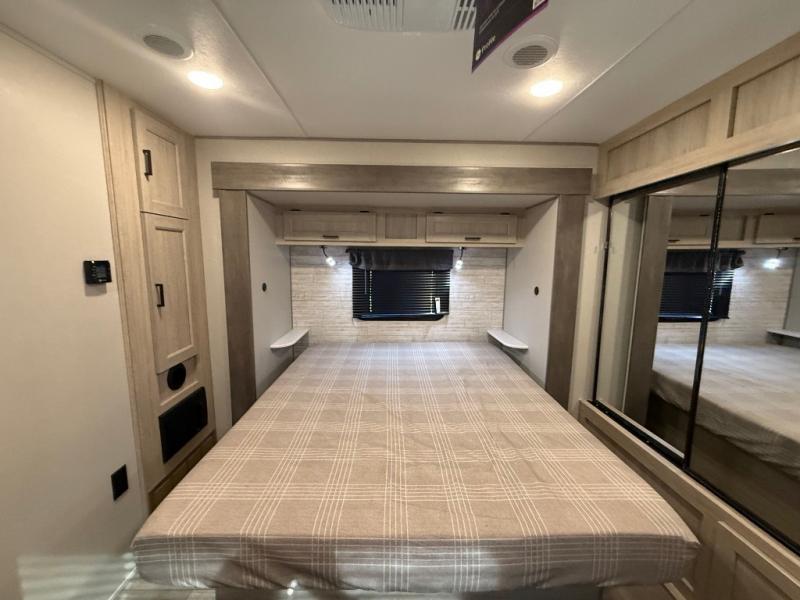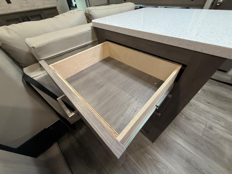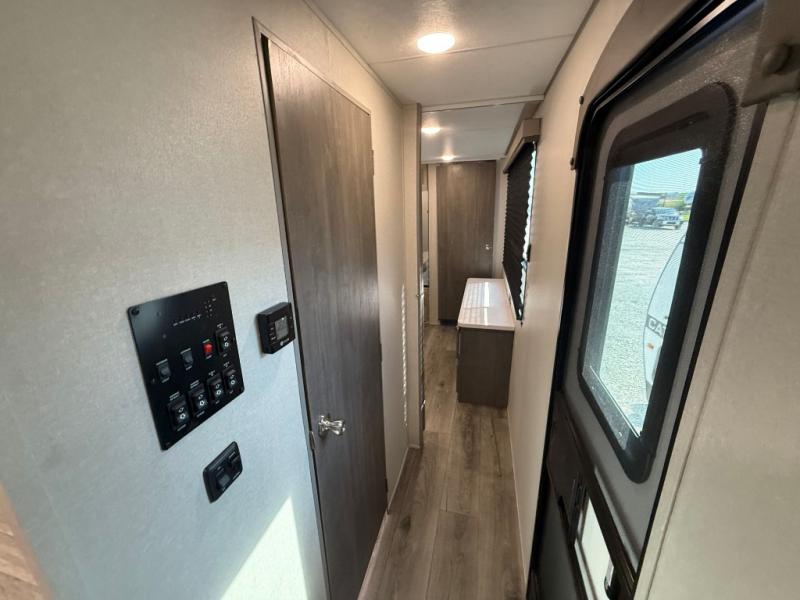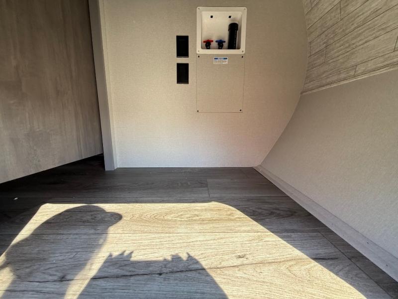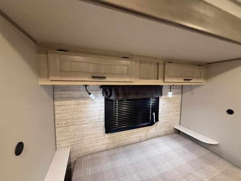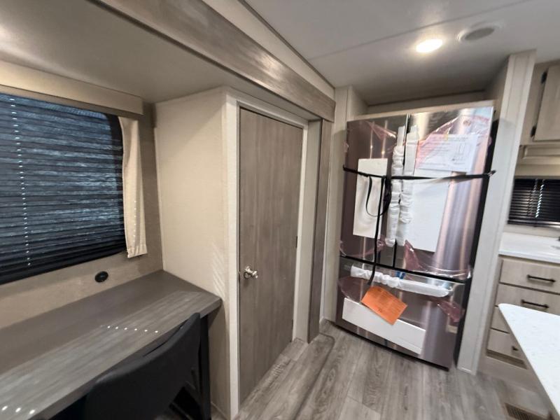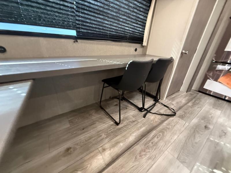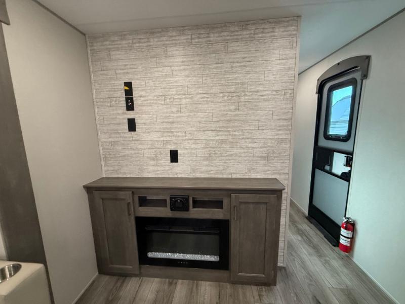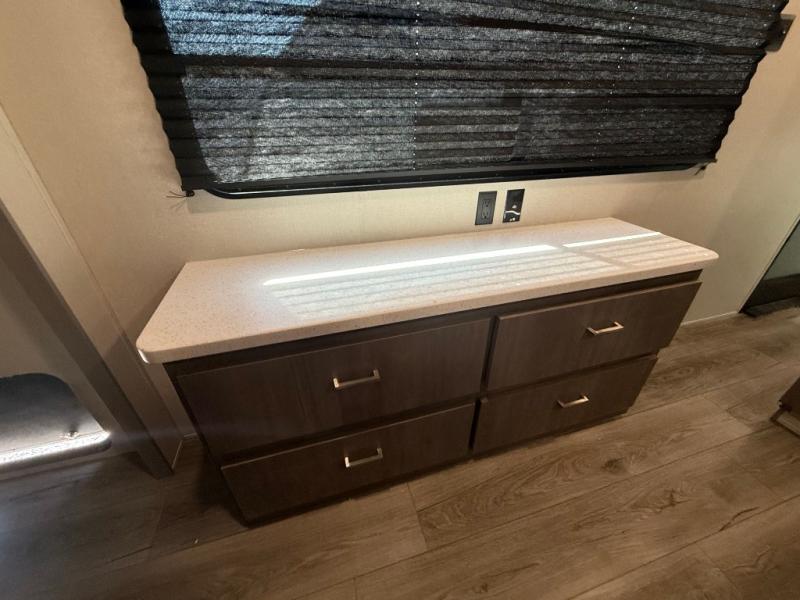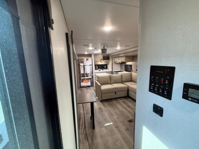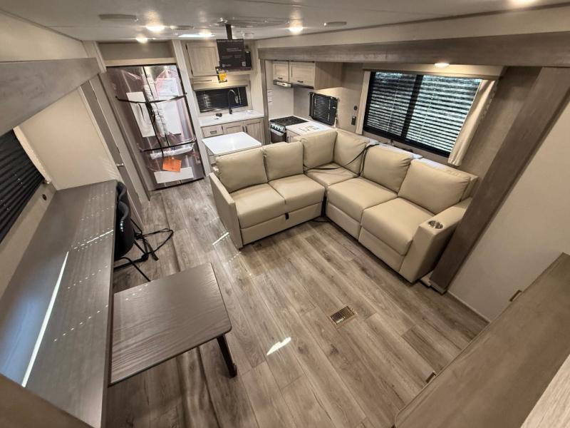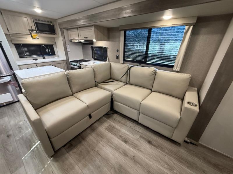 This travel trailer rear kitchen will make you feel like home is on the road, featuring a spacious pantry, residential refrigerator, overhead cabinets, microwave, kitchen island, and sliding desk/table for all your cooking and dining needs. The dining counter and chairs provide the perfect place to enjoy meals with family and friends. The living room boasts a comfortable sectional sofa and TV/entertainment center for relaxing and having fun with your favorite person, whether you're watching your favorite movie, playing games, or simply enjoying quality time with loved ones, this space has everything you need. Moreover, the full bathroom is super complete with a wardrobe, linen closet, and all the amenities you need to freshen up and feel at home. Plus, you and your partner will love this front bedroom, since it is private, featuring a comfortable RV queen bed and a dresser ideal for keeping your clothes organized. There are also overhead cabinets, a closet, and washer/dryer prep for all your laundry needs, making this space the perfect place to rest and recharge after a long day of adventure. Outside, you'll appreciate the two awnings for shade and protection from the elements, as well as the exterior storage for all your gear and toys.