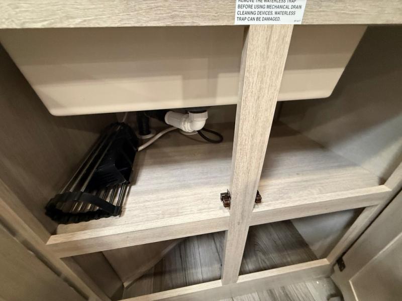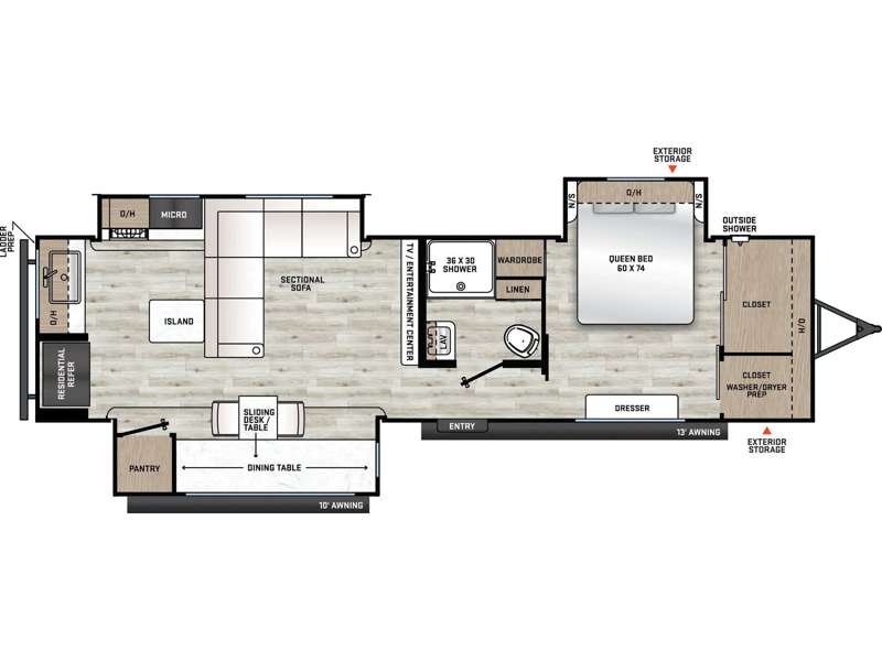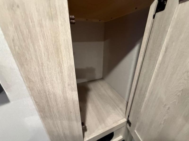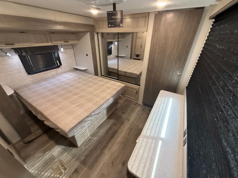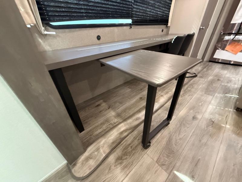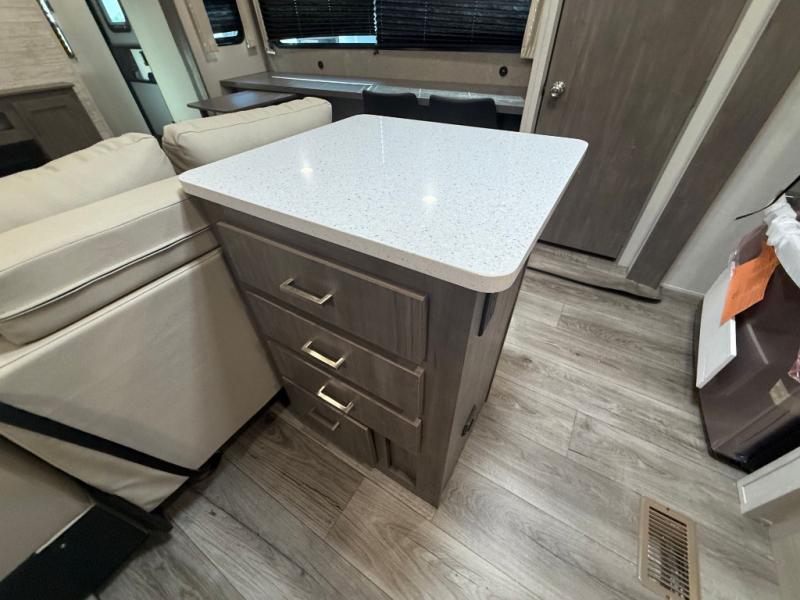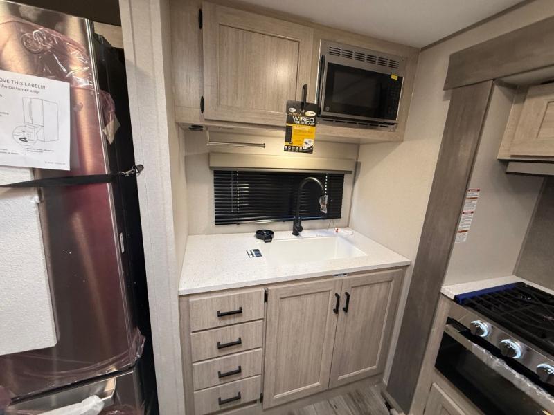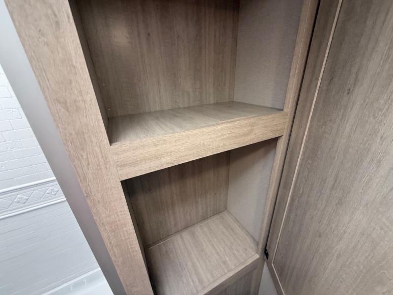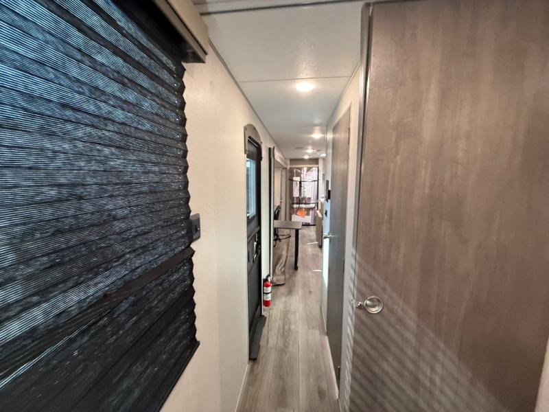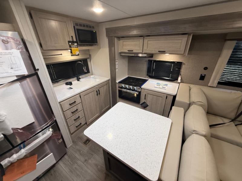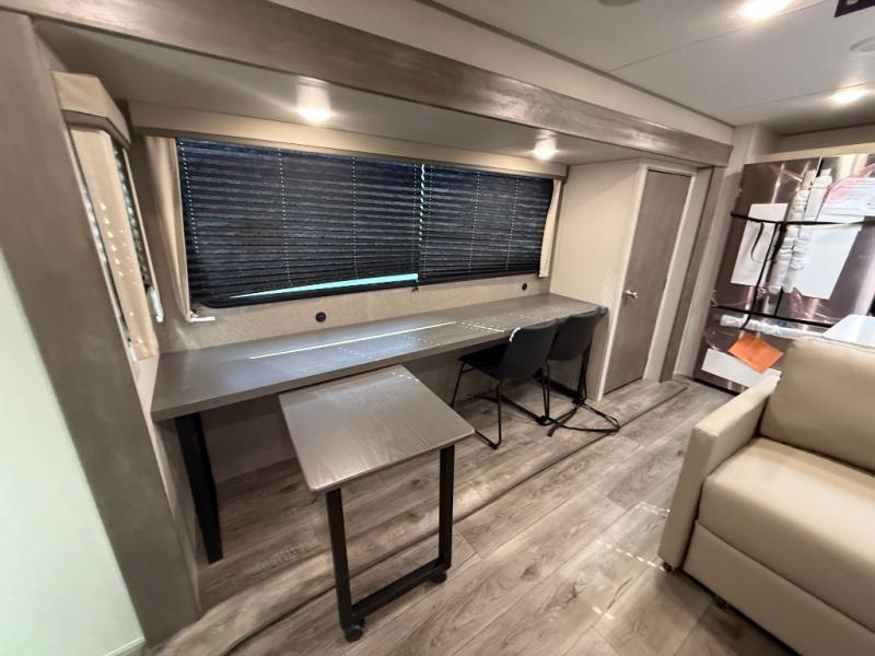 This travel trailer rear kitchen will make you feel like home is on the road, featuring a spacious pantry, residential refrigerator, overhead cabinets, microwave, kitchen island, and sliding desk/table for all your cooking and dining needs. The dining counter and chairs provide the perfect place to enjoy meals with family and friends. The living room boasts a comfortable sectional sofa and TV/entertainment center for relaxing and having fun with your favorite person, whether you're watching your favorite movie, playing games, or simply enjoying quality time with loved ones, this space has everything you need. Moreover, the full bathroom is super complete with a wardrobe, linen closet, and all the amenities you need to freshen up and feel at home. Plus, you and your partner will love this front bedroom, since it is private, featuring a comfortable RV queen bed and a dresser ideal for keeping your clothes organized. There are also overhead cabinets, a closet, and washer/dryer prep for all your laundry needs, making this space the perfect place to rest and recharge after a long day of adventure. Outside, you'll appreciate the two awnings for shade and protection from the elements, as well as the exterior storage for all your gear and toys.