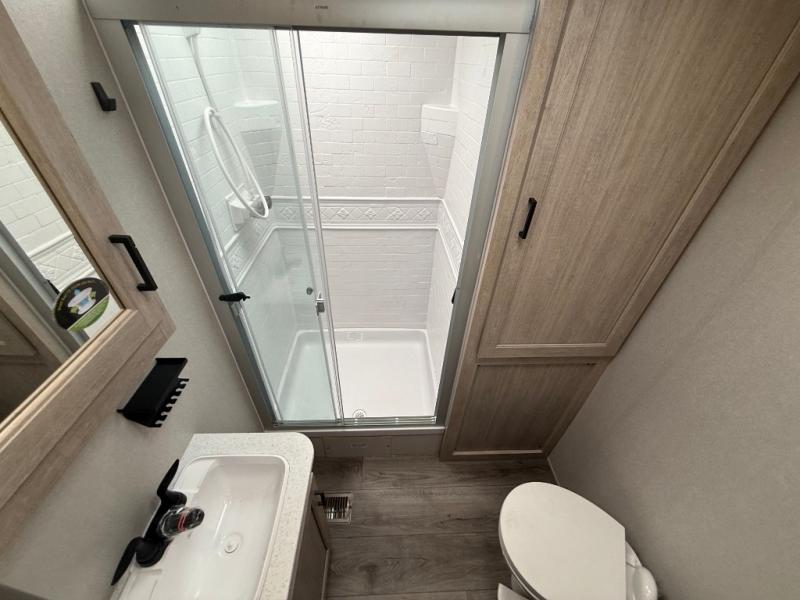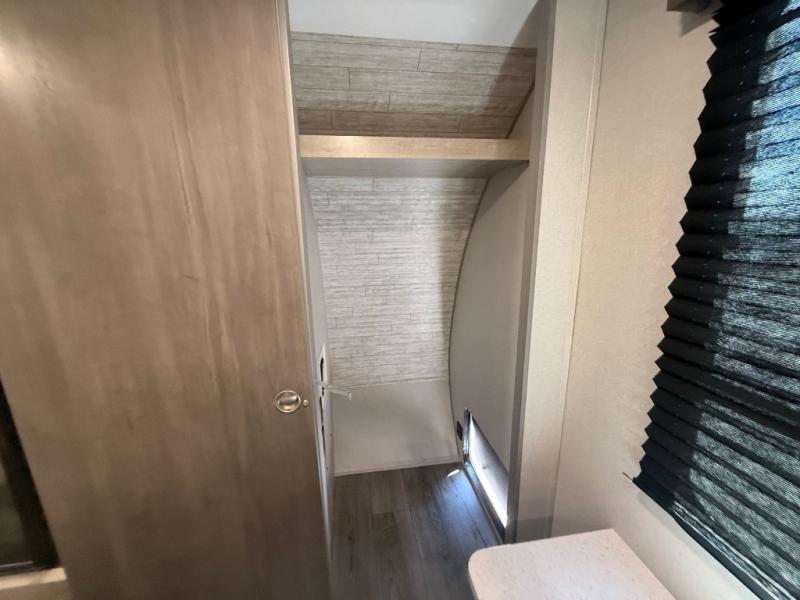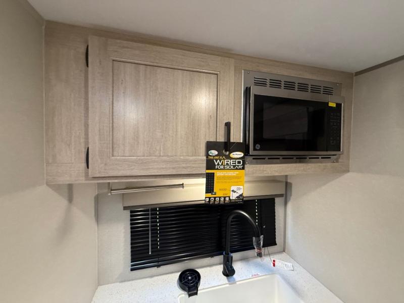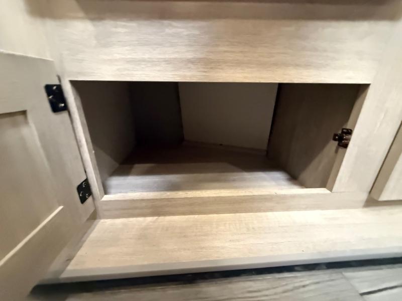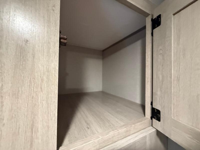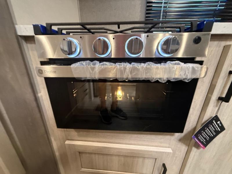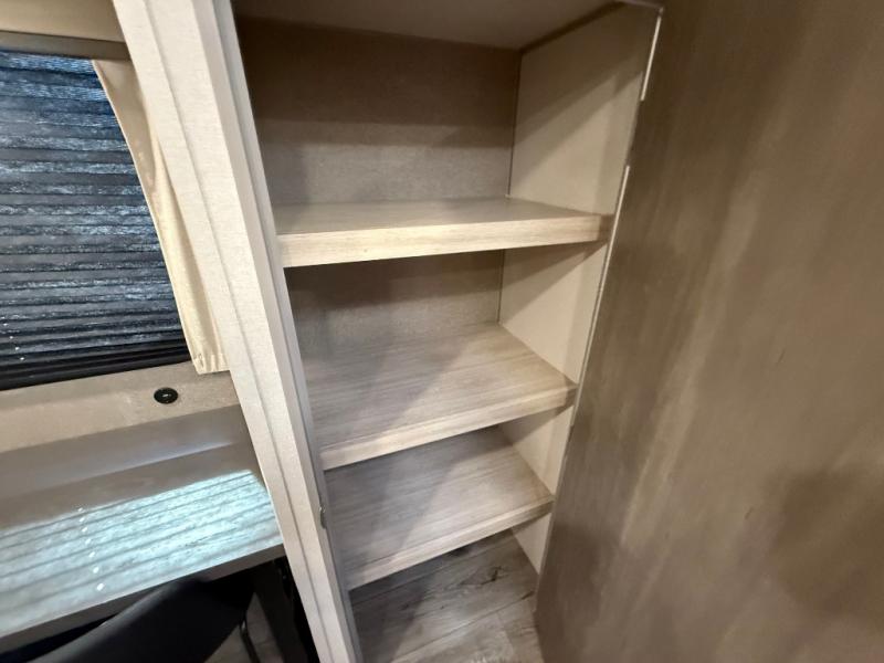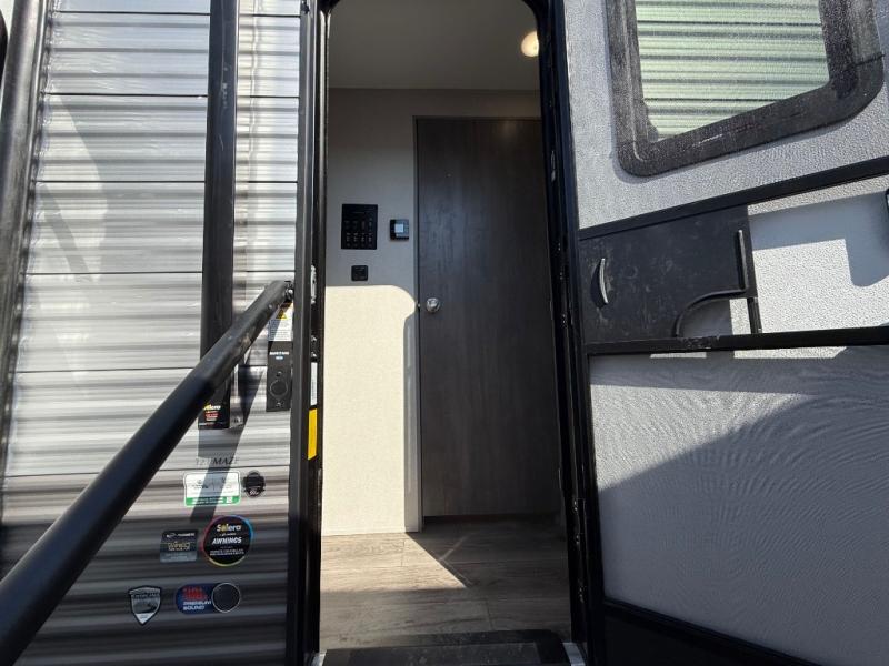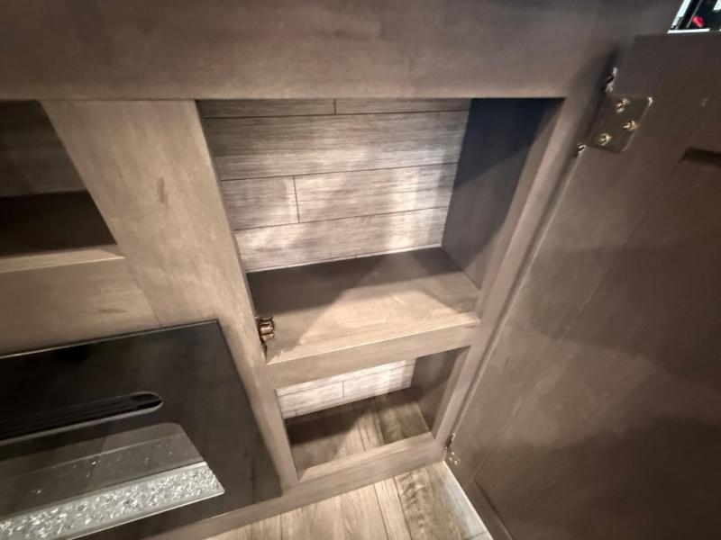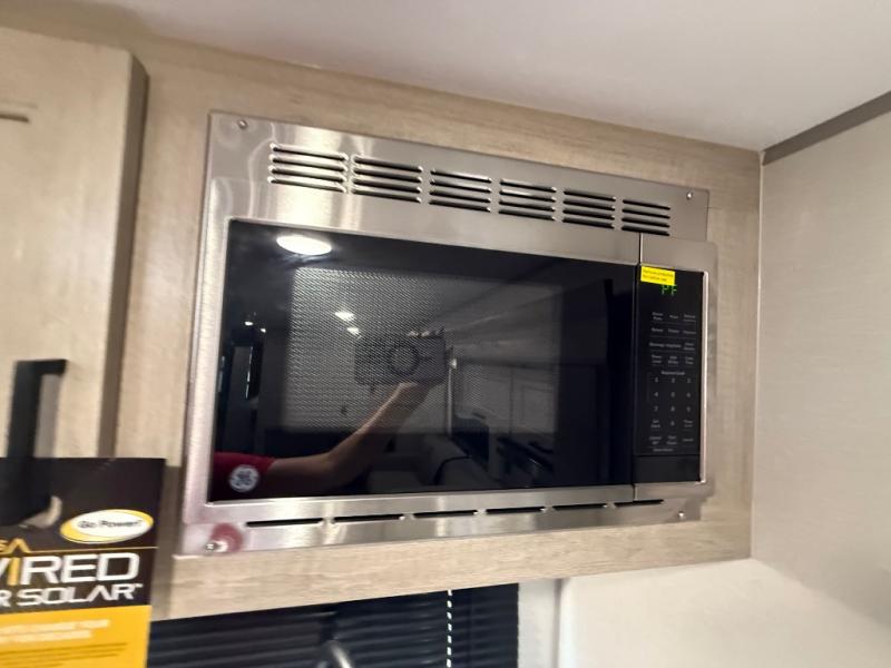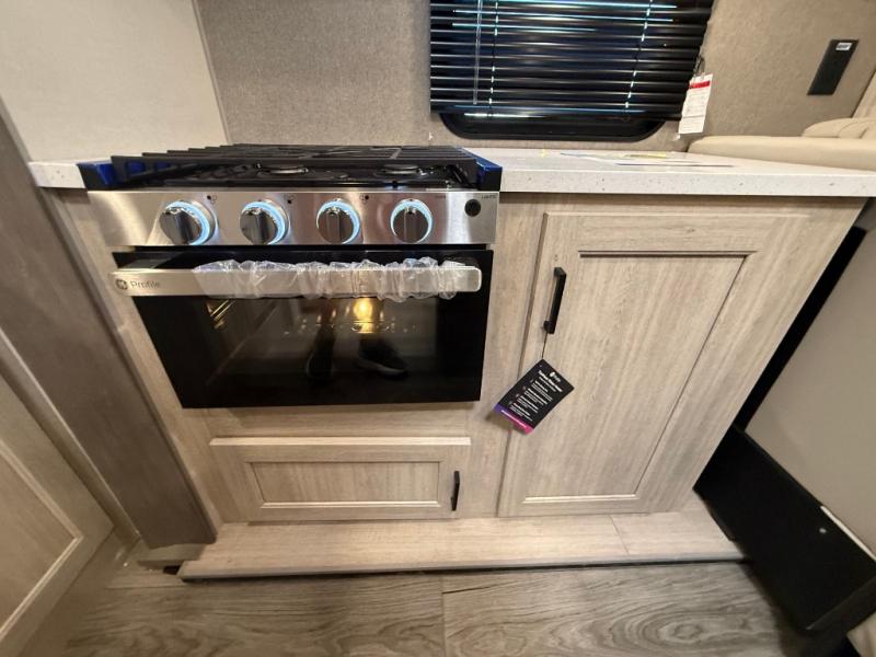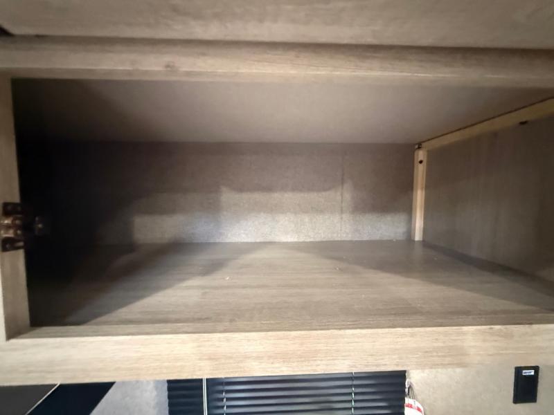 This travel trailer rear kitchen will make you feel like home is on the road, featuring a spacious pantry, residential refrigerator, overhead cabinets, microwave, kitchen island, and sliding desk/table for all your cooking and dining needs. The dining counter and chairs provide the perfect place to enjoy meals with family and friends. The living room boasts a comfortable sectional sofa and TV/entertainment center for relaxing and having fun with your favorite person, whether you're watching your favorite movie, playing games, or simply enjoying quality time with loved ones, this space has everything you need. Moreover, the full bathroom is super complete with a wardrobe, linen closet, and all the amenities you need to freshen up and feel at home. Plus, you and your partner will love this front bedroom, since it is private, featuring a comfortable RV queen bed and a dresser ideal for keeping your clothes organized. There are also overhead cabinets, a closet, and washer/dryer prep for all your laundry needs, making this space the perfect place to rest and recharge after a long day of adventure. Outside, you'll appreciate the two awnings for shade and protection from the elements, as well as the exterior storage for all your gear and toys.
