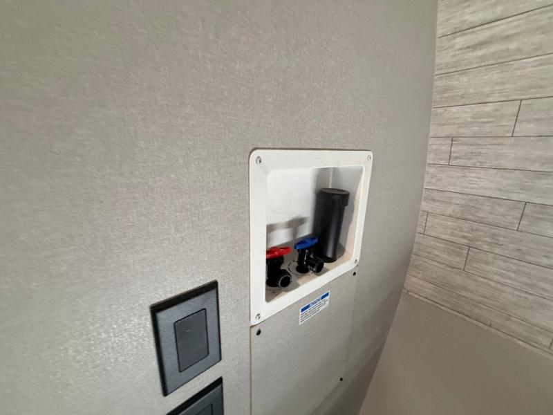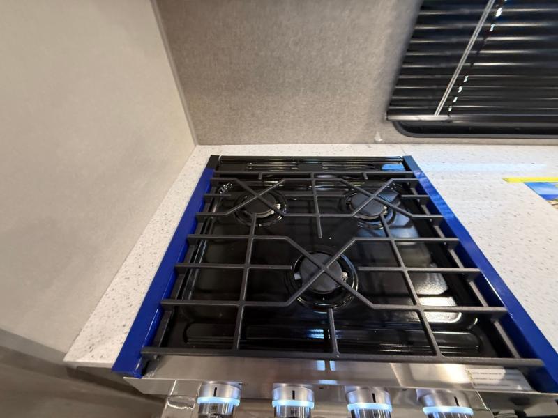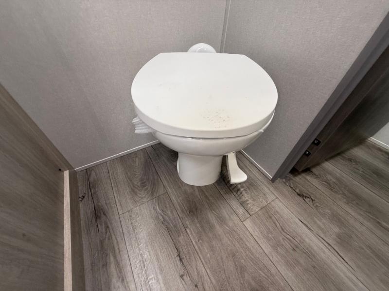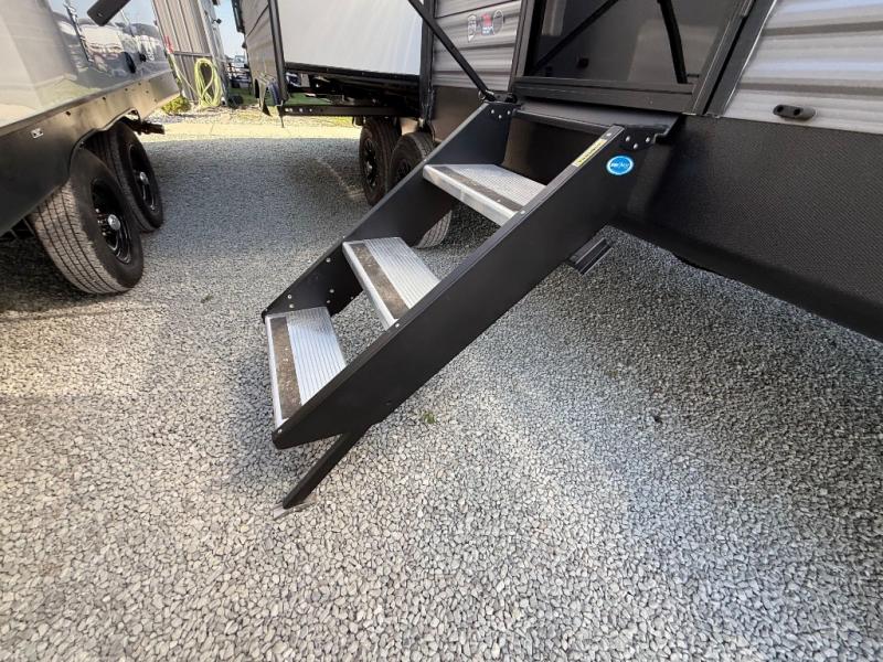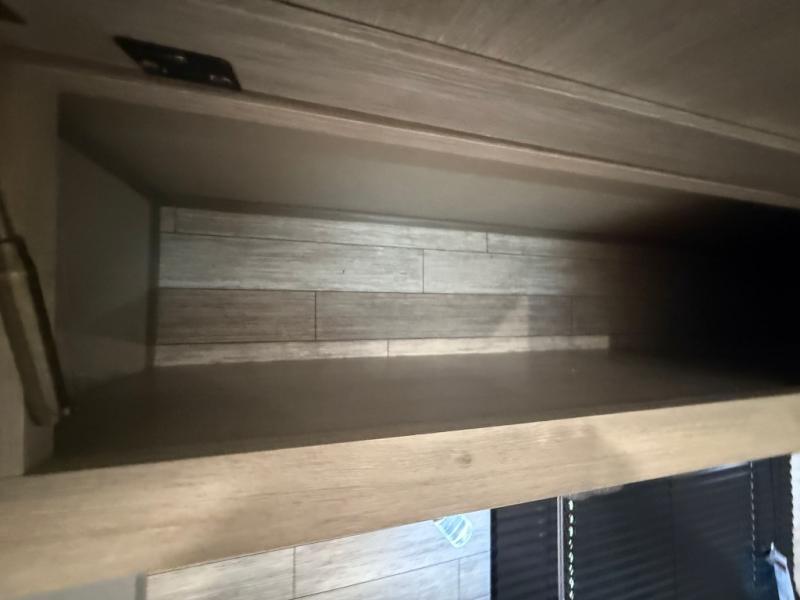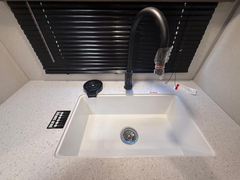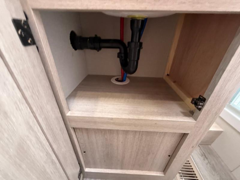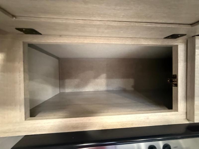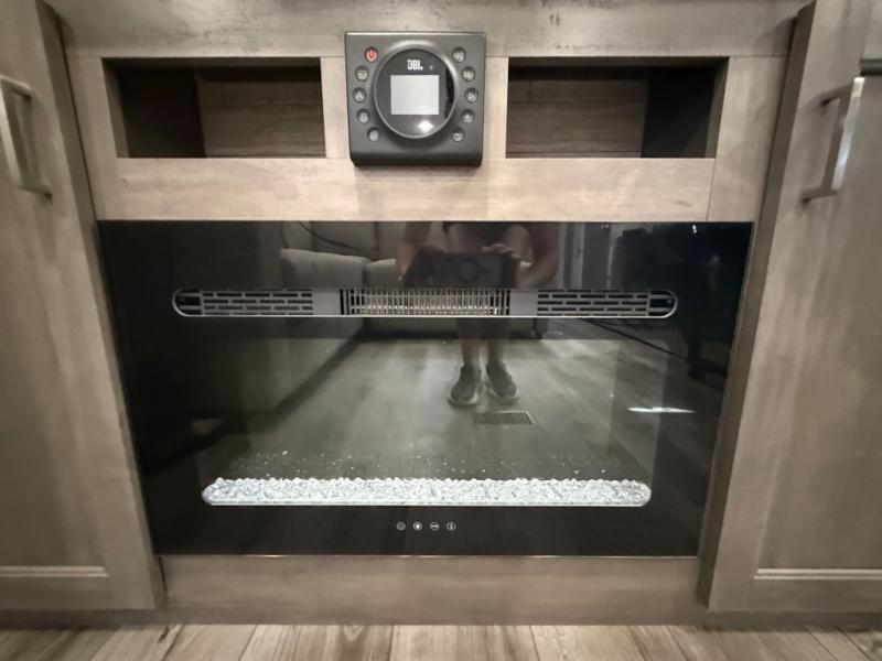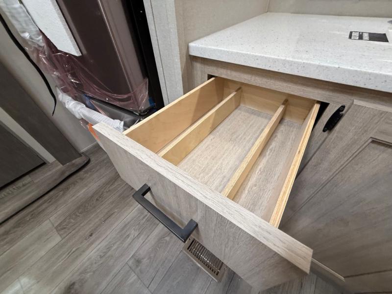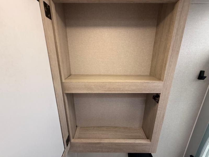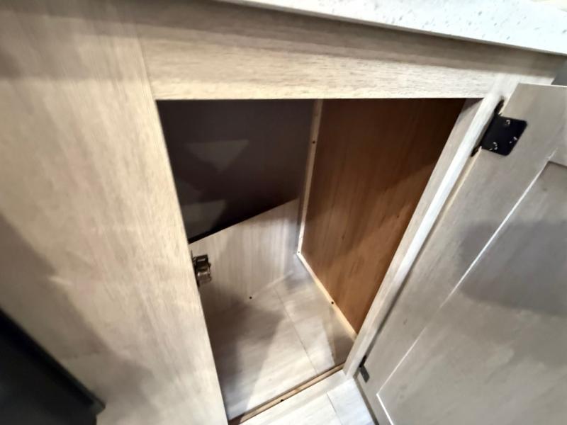 This travel trailer rear kitchen will make you feel like home is on the road, featuring a spacious pantry, residential refrigerator, overhead cabinets, microwave, kitchen island, and sliding desk/table for all your cooking and dining needs. The dining counter and chairs provide the perfect place to enjoy meals with family and friends. The living room boasts a comfortable sectional sofa and TV/entertainment center for relaxing and having fun with your favorite person, whether you're watching your favorite movie, playing games, or simply enjoying quality time with loved ones, this space has everything you need. Moreover, the full bathroom is super complete with a wardrobe, linen closet, and all the amenities you need to freshen up and feel at home. Plus, you and your partner will love this front bedroom, since it is private, featuring a comfortable RV queen bed and a dresser ideal for keeping your clothes organized. There are also overhead cabinets, a closet, and washer/dryer prep for all your laundry needs, making this space the perfect place to rest and recharge after a long day of adventure. Outside, you'll appreciate the two awnings for shade and protection from the elements, as well as the exterior storage for all your gear and toys.