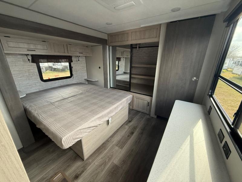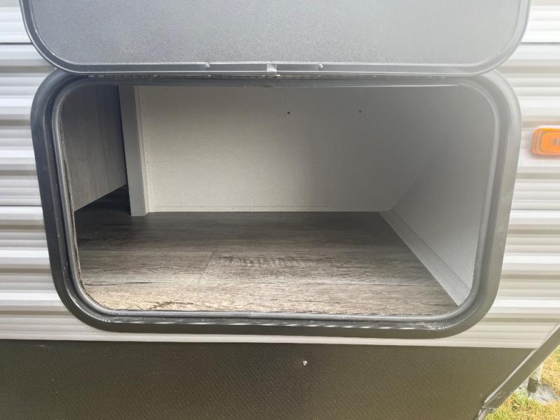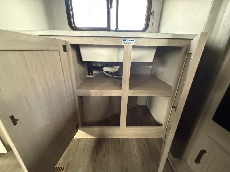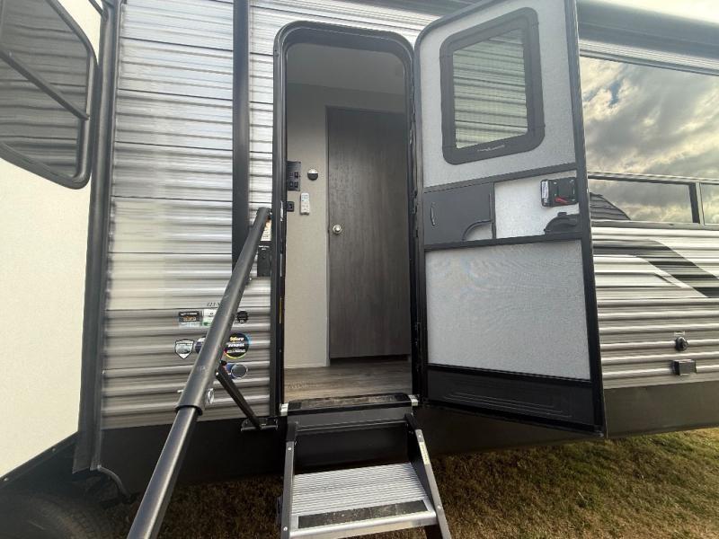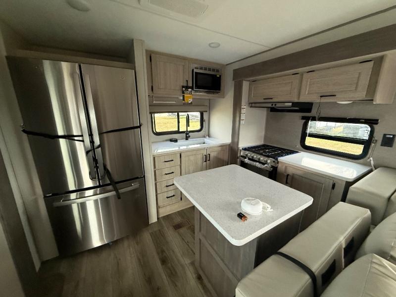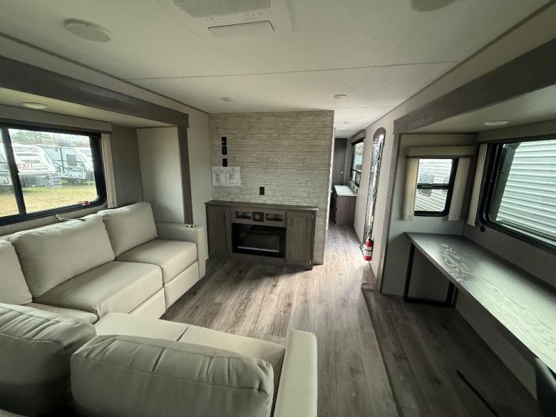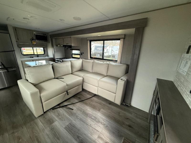 This travel trailer rear kitchen will make you feel like home is on the road, featuring a spacious pantry, residential refrigerator, overhead cabinets, microwave, kitchen island, and sliding desk/table for all your cooking and dining needs. The dining counter and chairs provide the perfect place to enjoy meals with family and friends. The living room boasts a comfortable sectional sofa and TV/entertainment center for relaxing and having fun with your favorite person, whether you're watching your favorite movie, playing games, or simply enjoying quality time with loved ones, this space has everything you need. Moreover, the full bathroom is super complete with a wardrobe, linen closet, and all the amenities you need to freshen up and feel at home. Plus, you and your partner will love this front bedroom, since it is private, featuring a comfortable RV queen bed and a dresser ideal for keeping your clothes organized. There are also overhead cabinets, a closet, and washer/dryer prep for all your laundry needs, making this space the perfect place to rest and recharge after a long day of adventure. Outside, you'll appreciate the two awnings for shade and protection from the elements, as well as the exterior storage for all your gear and toys.