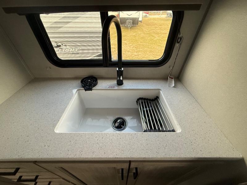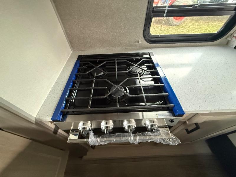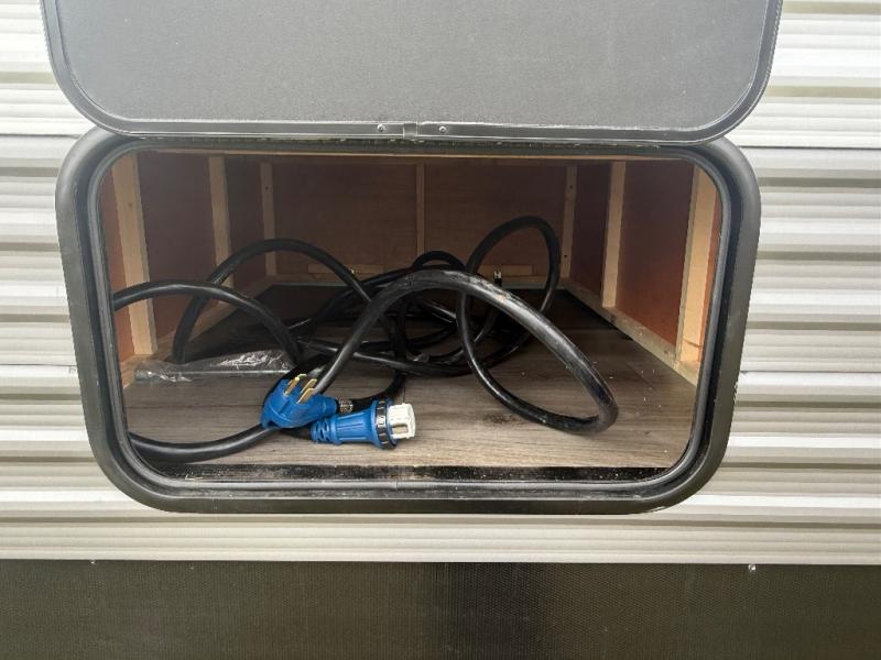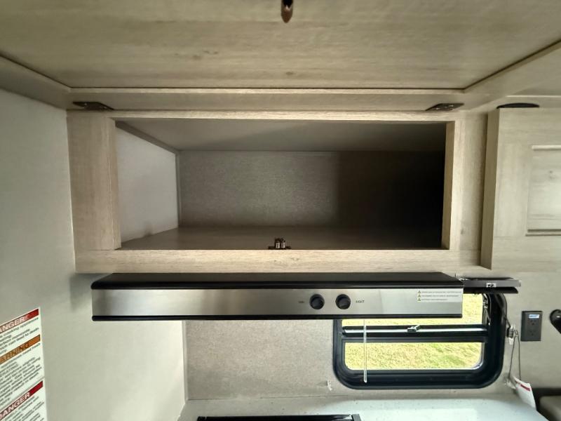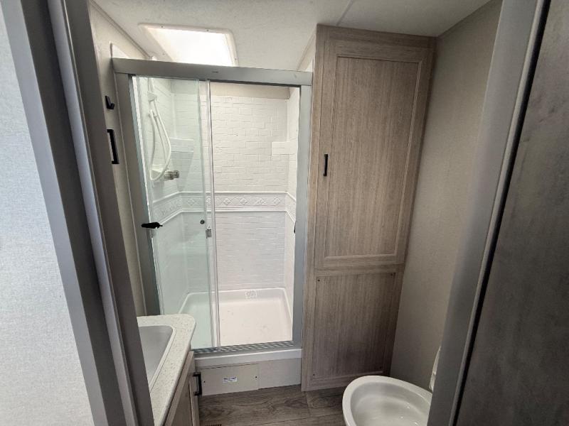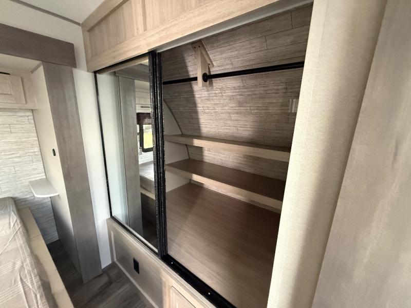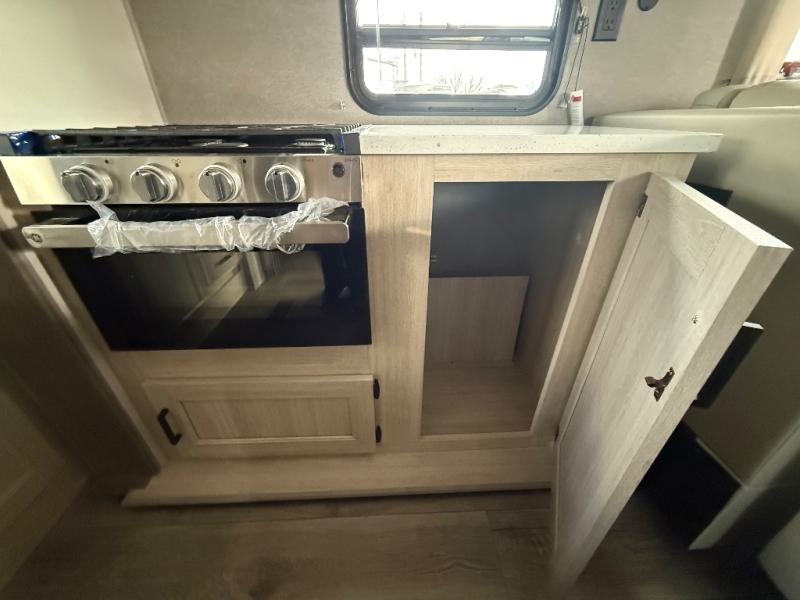 This travel trailer rear kitchen will make you feel like home is on the road, featuring a spacious pantry, residential refrigerator, overhead cabinets, microwave, kitchen island, and sliding desk/table for all your cooking and dining needs. The dining counter and chairs provide the perfect place to enjoy meals with family and friends. The living room boasts a comfortable sectional sofa and TV/entertainment center for relaxing and having fun with your favorite person, whether you're watching your favorite movie, playing games, or simply enjoying quality time with loved ones, this space has everything you need. Moreover, the full bathroom is super complete with a wardrobe, linen closet, and all the amenities you need to freshen up and feel at home. Plus, you and your partner will love this front bedroom, since it is private, featuring a comfortable RV queen bed and a dresser ideal for keeping your clothes organized. There are also overhead cabinets, a closet, and washer/dryer prep for all your laundry needs, making this space the perfect place to rest and recharge after a long day of adventure. Outside, you'll appreciate the two awnings for shade and protection from the elements, as well as the exterior storage for all your gear and toys.