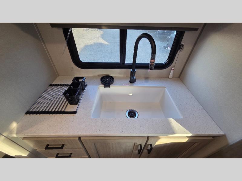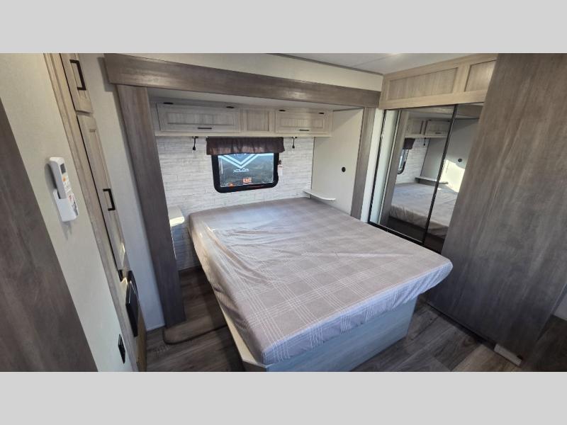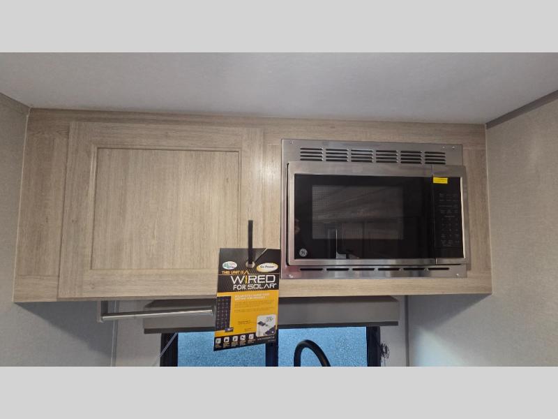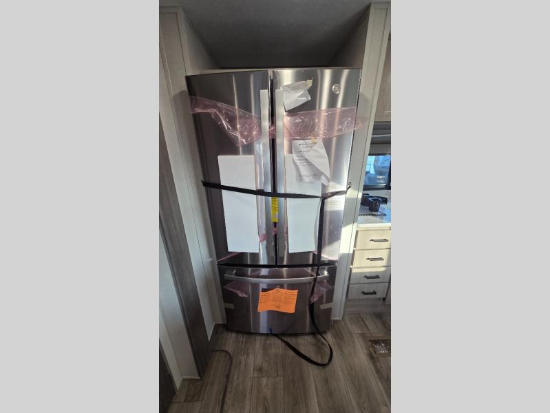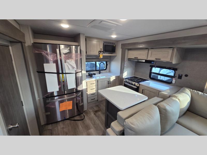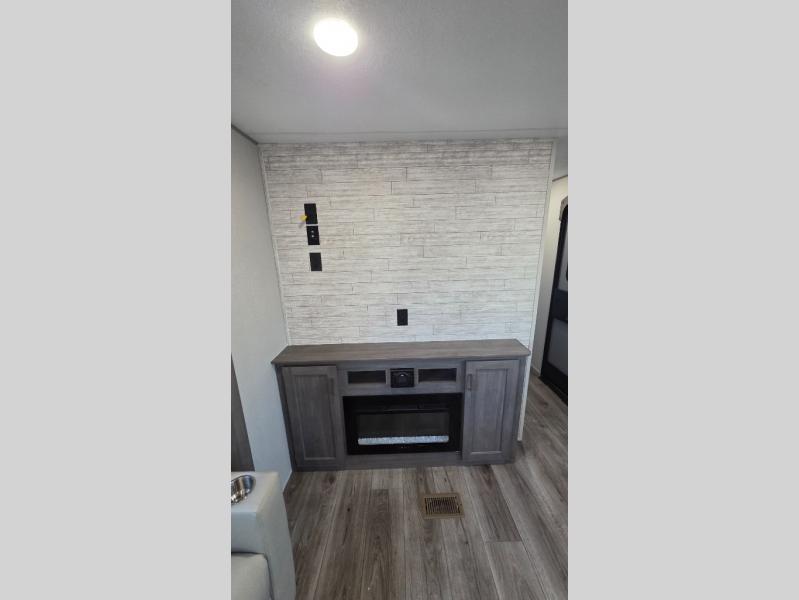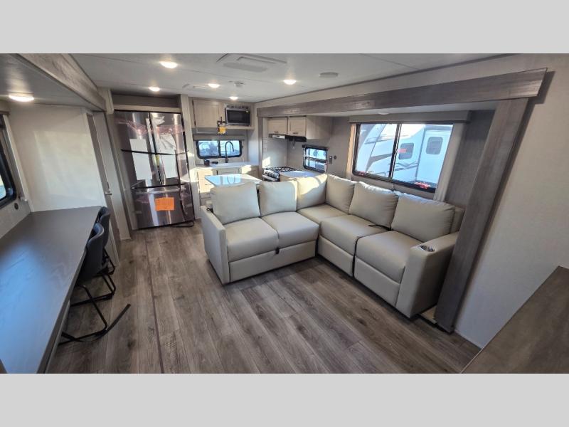 This travel trailer rear kitchen will make you feel like home is on the road, featuring a spacious pantry, residential refrigerator, overhead cabinets, microwave, kitchen island, and sliding desk/table for all your cooking and dining needs. The dining counter and chairs provide the perfect place to enjoy meals with family and friends. The living room boasts a comfortable sectional sofa and TV/entertainment center for relaxing and having fun with your favorite person, whether you're watching your favorite movie, playing games, or simply enjoying quality time with loved ones, this space has everything you need. Moreover, the full bathroom is super complete with a wardrobe, linen closet, and all the amenities you need to freshen up and feel at home. Plus, you and your partner will love this front bedroom, since it is private, featuring a comfortable RV queen bed and a dresser ideal for keeping your clothes organized. There are also overhead cabinets, a closet, and washer/dryer prep for all your laundry needs, making this space the perfect place to rest and recharge after a long day of adventure. Outside, you'll appreciate the two awnings for shade and protection from the elements, as well as the exterior storage for all your gear and toys.