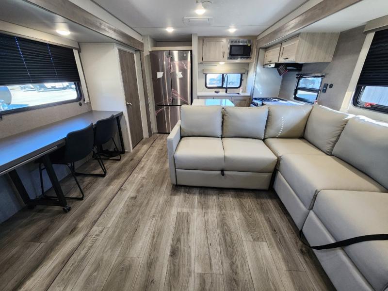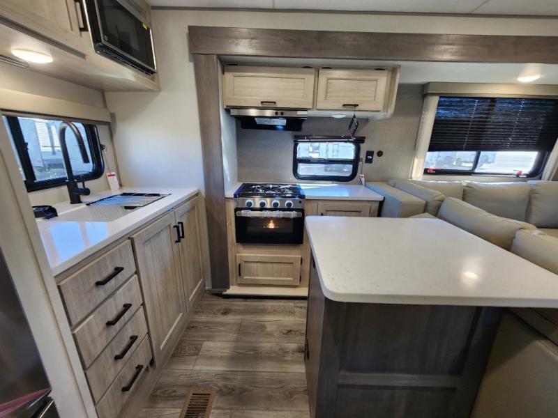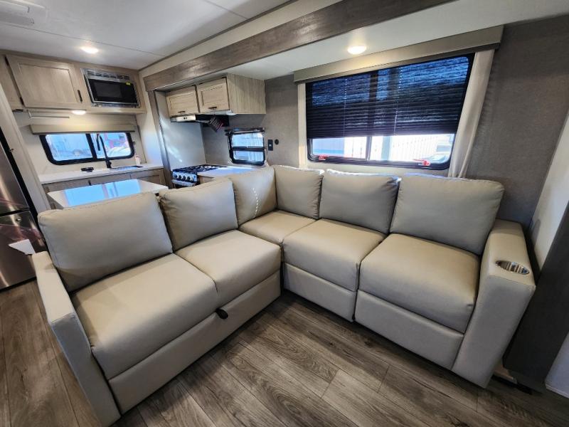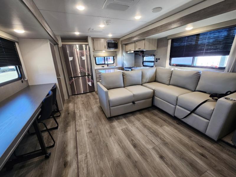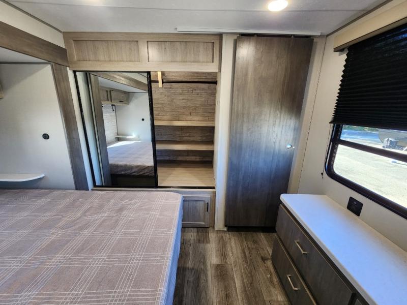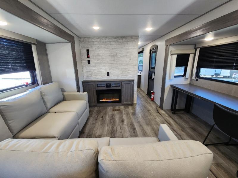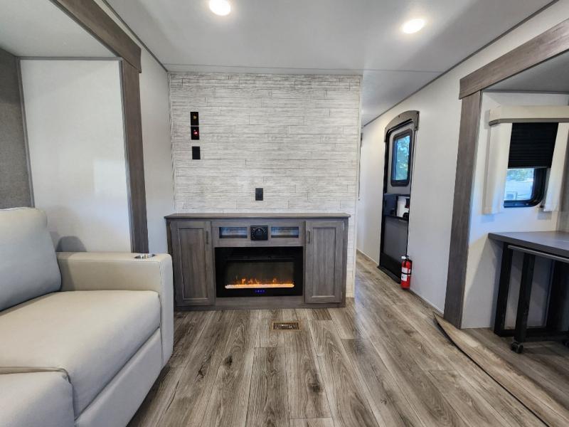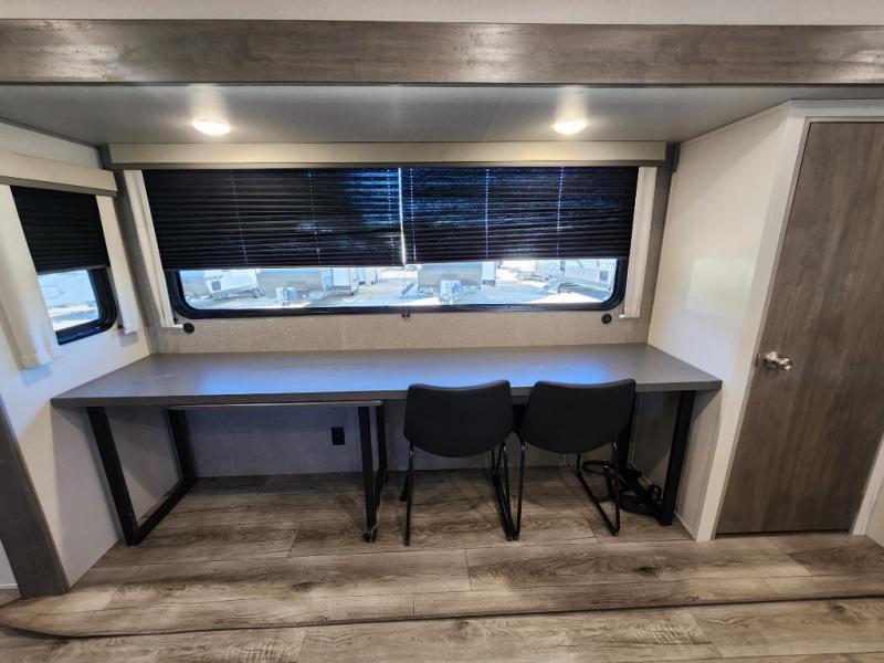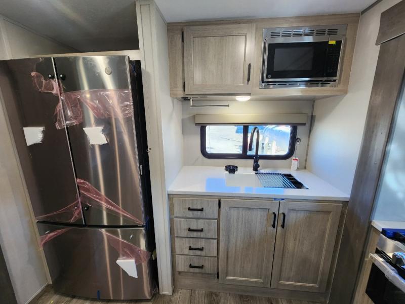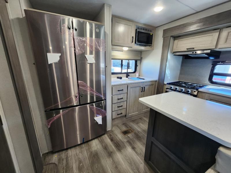 This travel trailer rear kitchen will make you feel like home is on the road, featuring a spacious pantry, residential refrigerator, overhead cabinets, microwave, kitchen island, and sliding desk/table for all your cooking and dining needs. The dining counter and chairs provide the perfect place to enjoy meals with family and friends. The living room boasts a comfortable sectional sofa and TV/entertainment center for relaxing and having fun with your favorite person, whether you're watching your favorite movie, playing games, or simply enjoying quality time with loved ones, this space has everything you need. Moreover, the full bathroom is super complete with a wardrobe, linen closet, and all the amenities you need to freshen up and feel at home. Plus, you and your partner will love this front bedroom, since it is private, featuring a comfortable RV queen bed and a dresser ideal for keeping your clothes organized. There are also overhead cabinets, a closet, and washer/dryer prep for all your laundry needs, making this space the perfect place to rest and recharge after a long day of adventure. Outside, you'll appreciate the two awnings for shade and protection from the elements, as well as the exterior storage for all your gear and toys.