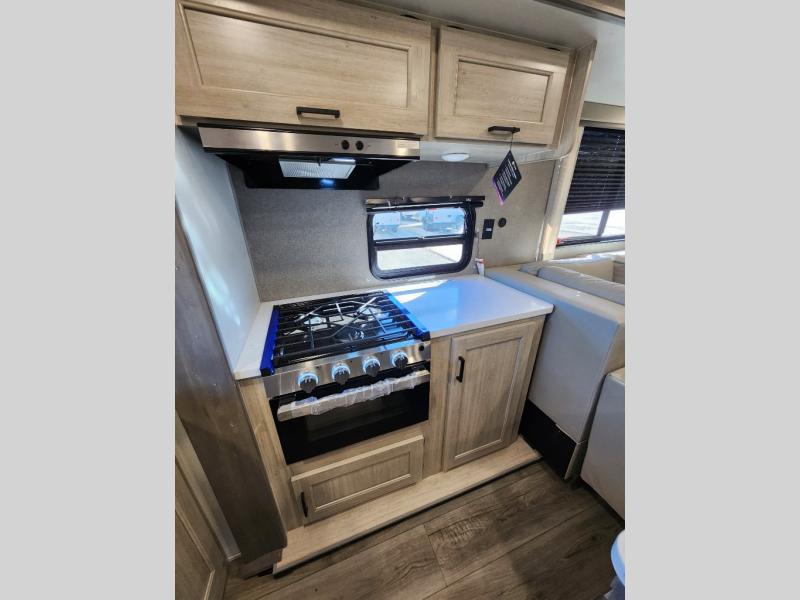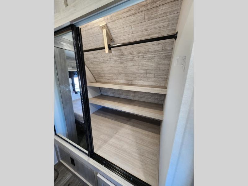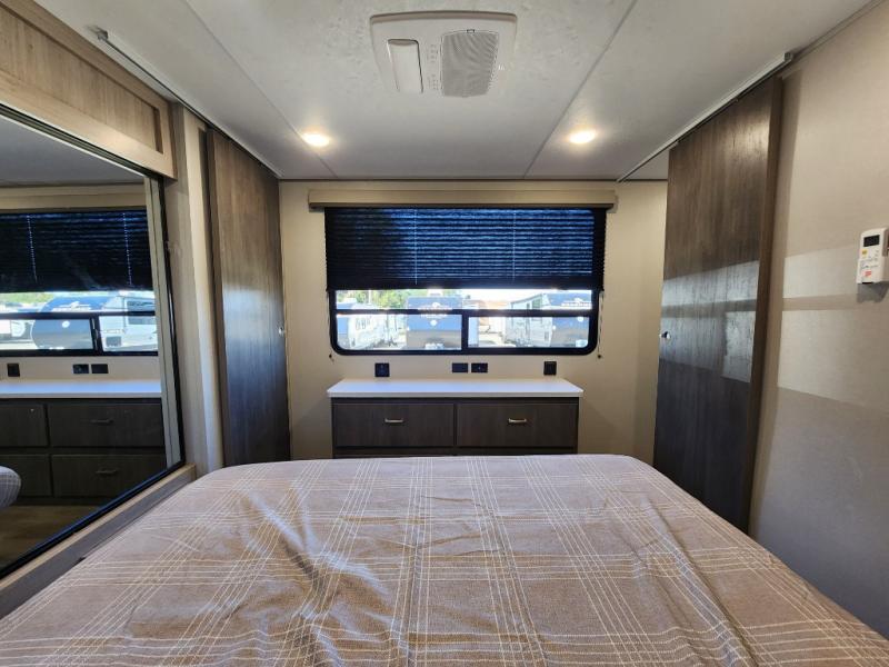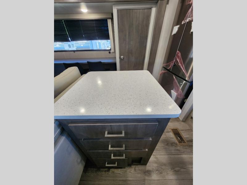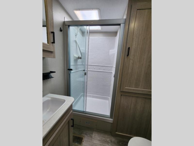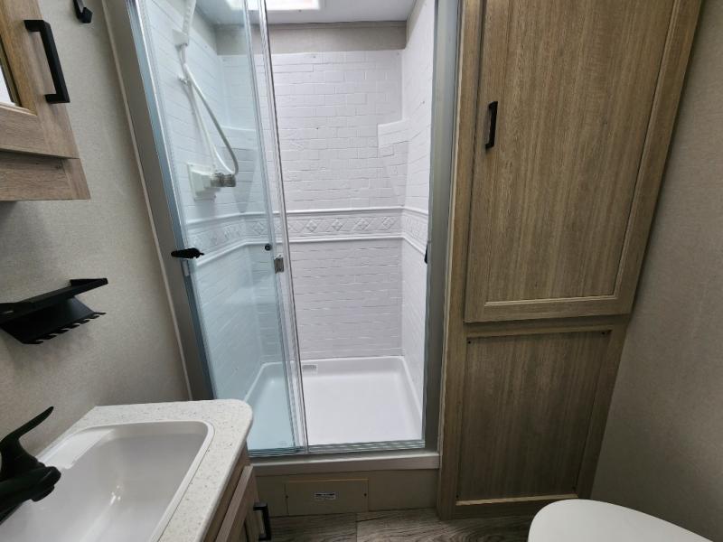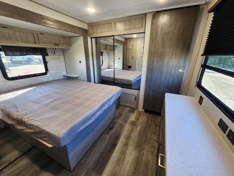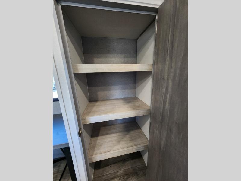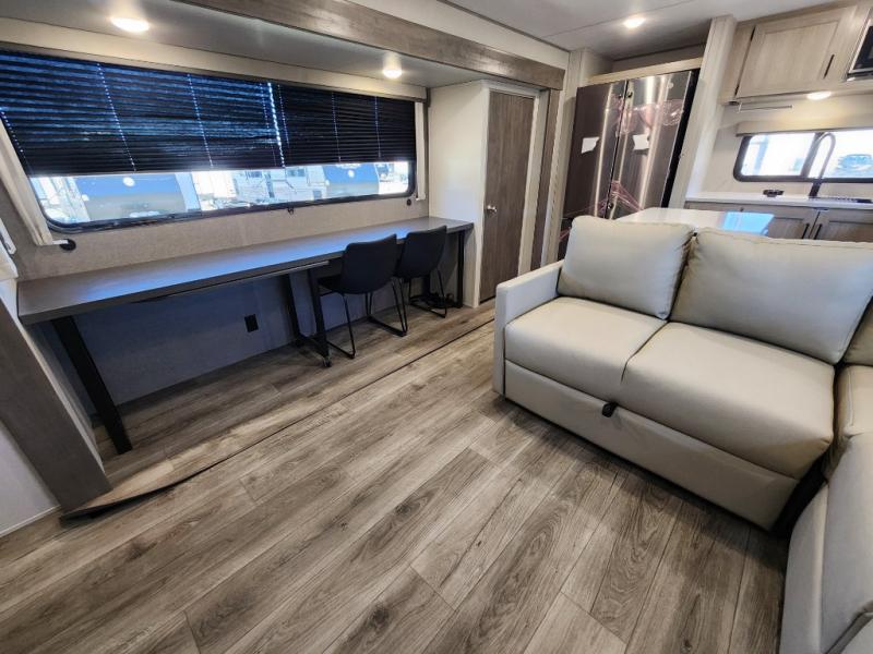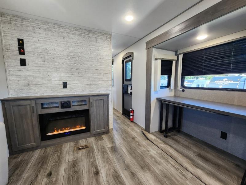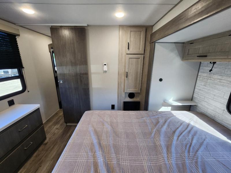This travel trailer rear kitchen will make you feel like home is on the road, featuring a spacious pantry, residential refrigerator, overhead cabinets, microwave, kitchen island, and sliding desk/table for all your cooking and dining needs. The dining counter and chairs provide the perfect place to enjoy meals with family and friends. The living room boasts a comfortable sectional sofa and TV/entertainment center for relaxing and having fun with your favorite person, whether you're watching your favorite movie, playing games, or simply enjoying quality time with loved ones, this space has everything you need. Moreover, the full bathroom is super complete with a wardrobe, linen closet, and all the amenities you need to freshen up and feel at home. Plus, you and your partner will love this front bedroom, since it is private, featuring a comfortable RV queen bed and a dresser ideal for keeping your clothes organized. There are also overhead cabinets, a closet, and washer/dryer prep for all your laundry needs, making this space the perfect place to rest and recharge after a long day of adventure. Outside, you'll appreciate the two awnings for shade and protection from the elements, as well as the exterior storage for all your gear and toys.