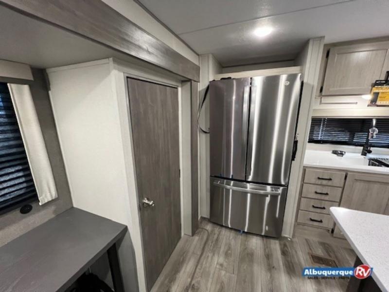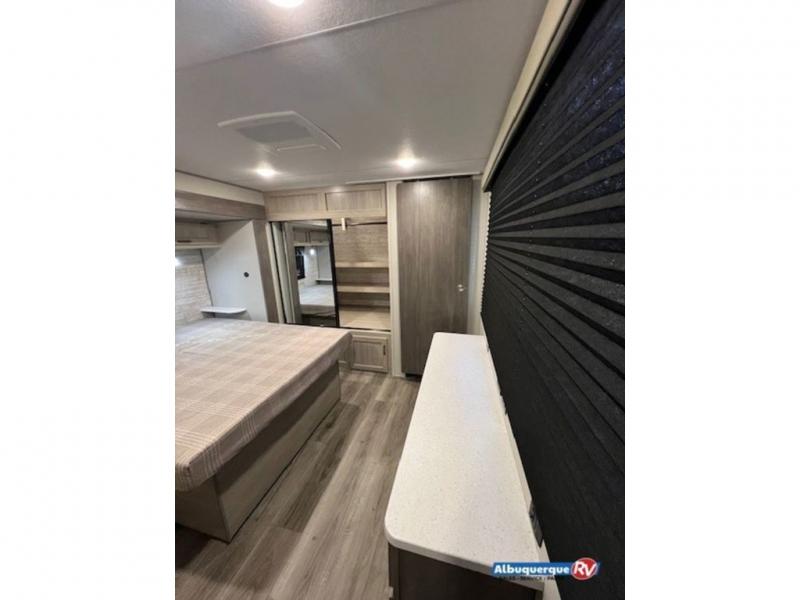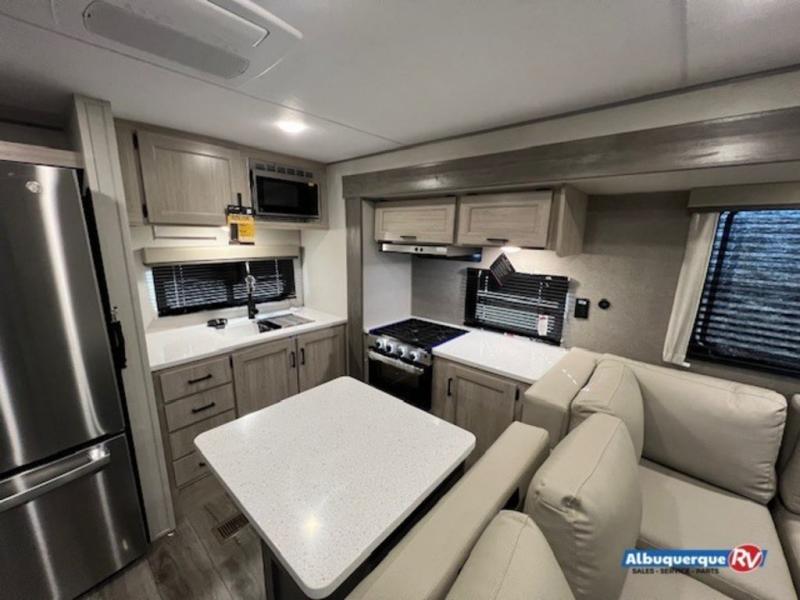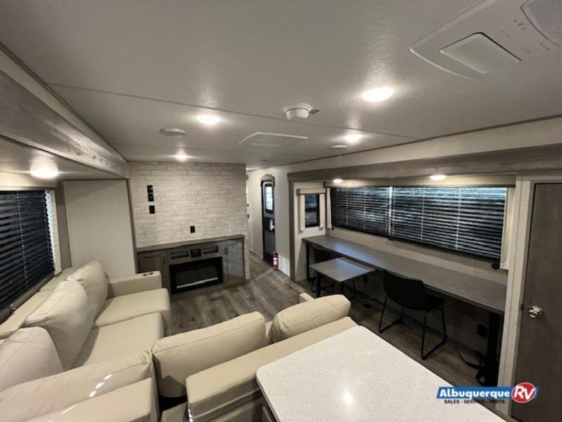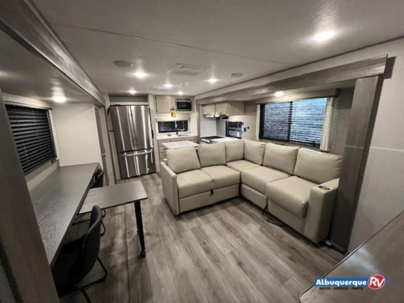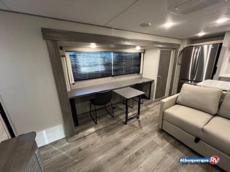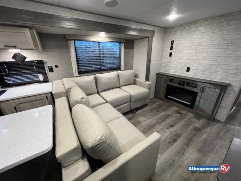 This travel trailer rear kitchen will make you feel like home is on the road, featuring a spacious pantry, residential refrigerator, overhead cabinets, microwave, kitchen island, and sliding desk/table for all your cooking and dining needs. The dining counter and chairs provide the perfect place to enjoy meals with family and friends. The living room boasts a comfortable sectional sofa and TV/entertainment center for relaxing and having fun with your favorite person, whether you're watching your favorite movie, playing games, or simply enjoying quality time with loved ones, this space has everything you need. Moreover, the full bathroom is super complete with a wardrobe, linen closet, and all the amenities you need to freshen up and feel at home. Plus, you and your partner will love this front bedroom, since it is private, featuring a comfortable RV queen bed and a dresser ideal for keeping your clothes organized. There are also overhead cabinets, a closet, and washer/dryer prep for all your laundry needs, making this space the perfect place to rest and recharge after a long day of adventure. Outside, you'll appreciate the two awnings for shade and protection from the elements, as well as the exterior storage for all your gear and toys.