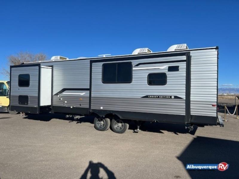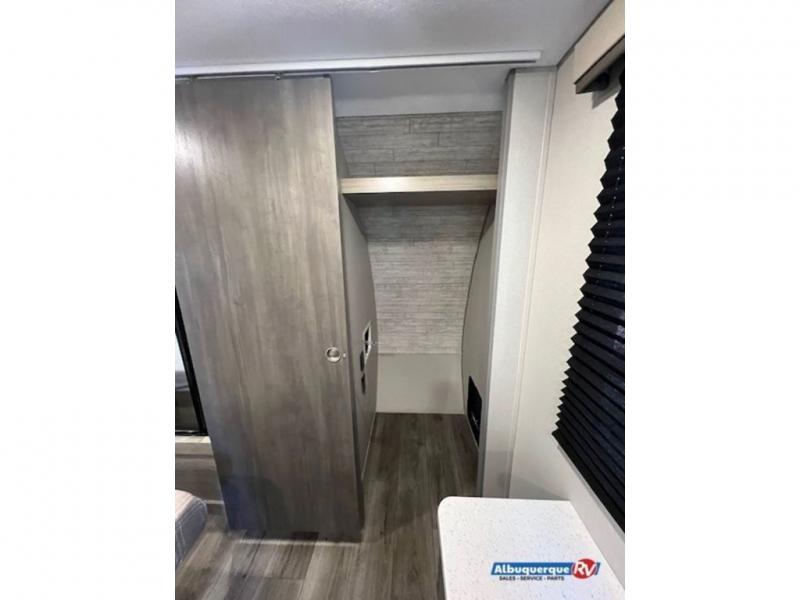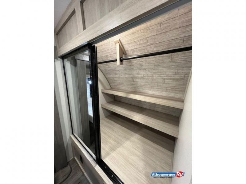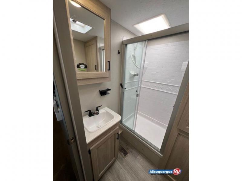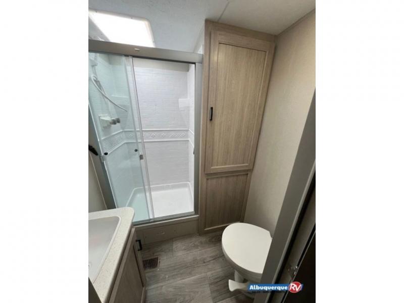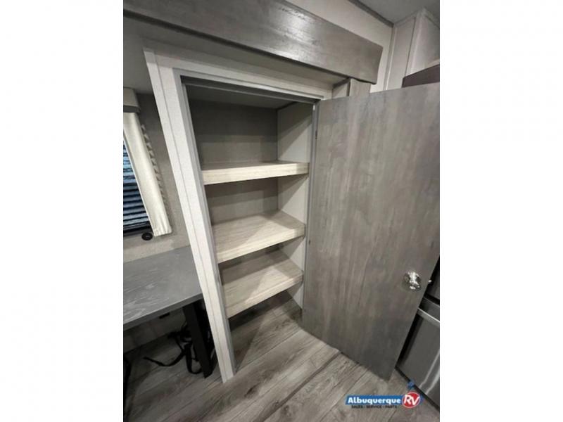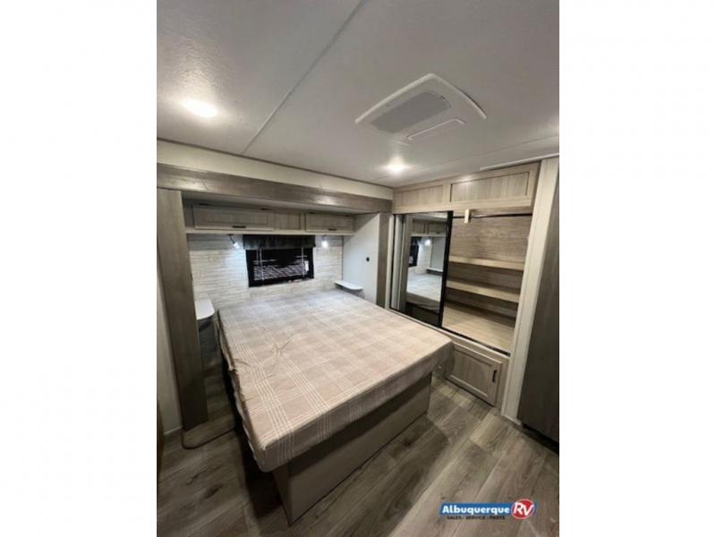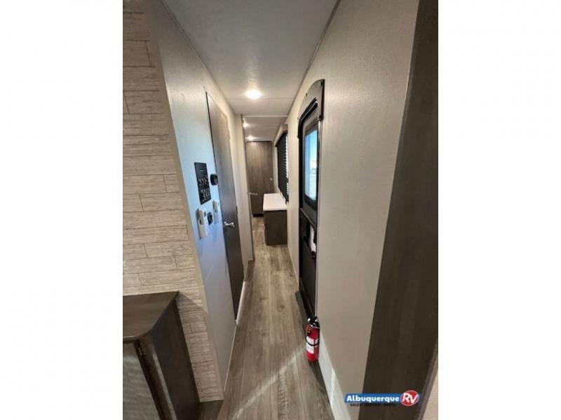 This travel trailer rear kitchen will make you feel like home is on the road, featuring a spacious pantry, residential refrigerator, overhead cabinets, microwave, kitchen island, and sliding desk/table for all your cooking and dining needs. The dining counter and chairs provide the perfect place to enjoy meals with family and friends. The living room boasts a comfortable sectional sofa and TV/entertainment center for relaxing and having fun with your favorite person, whether you're watching your favorite movie, playing games, or simply enjoying quality time with loved ones, this space has everything you need. Moreover, the full bathroom is super complete with a wardrobe, linen closet, and all the amenities you need to freshen up and feel at home. Plus, you and your partner will love this front bedroom, since it is private, featuring a comfortable RV queen bed and a dresser ideal for keeping your clothes organized. There are also overhead cabinets, a closet, and washer/dryer prep for all your laundry needs, making this space the perfect place to rest and recharge after a long day of adventure. Outside, you'll appreciate the two awnings for shade and protection from the elements, as well as the exterior storage for all your gear and toys.
