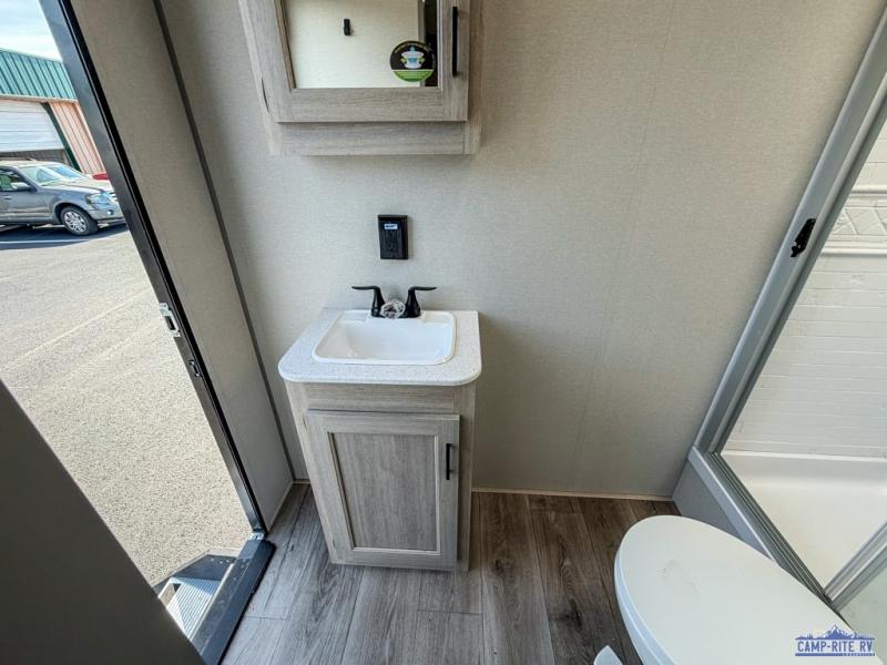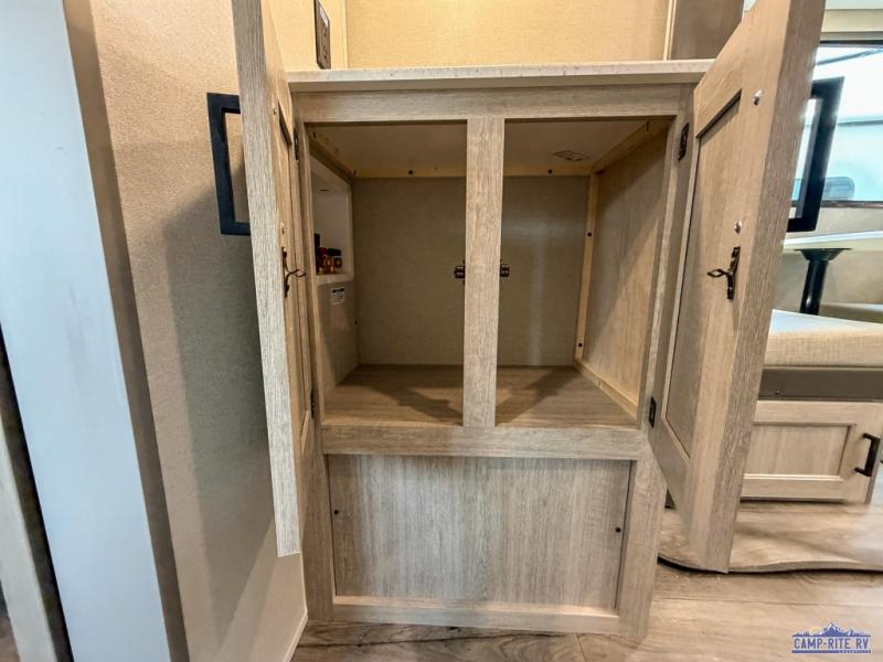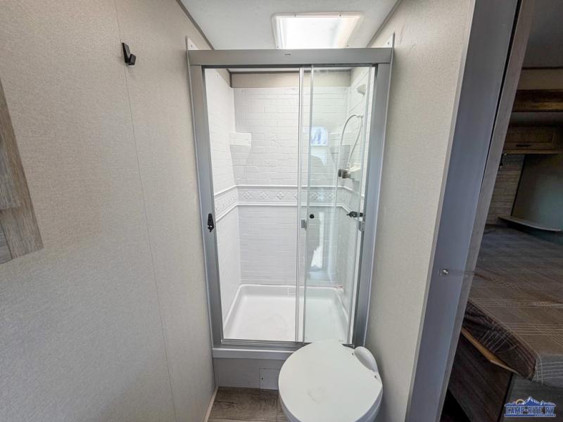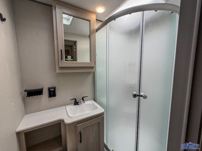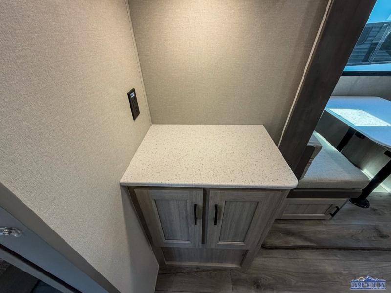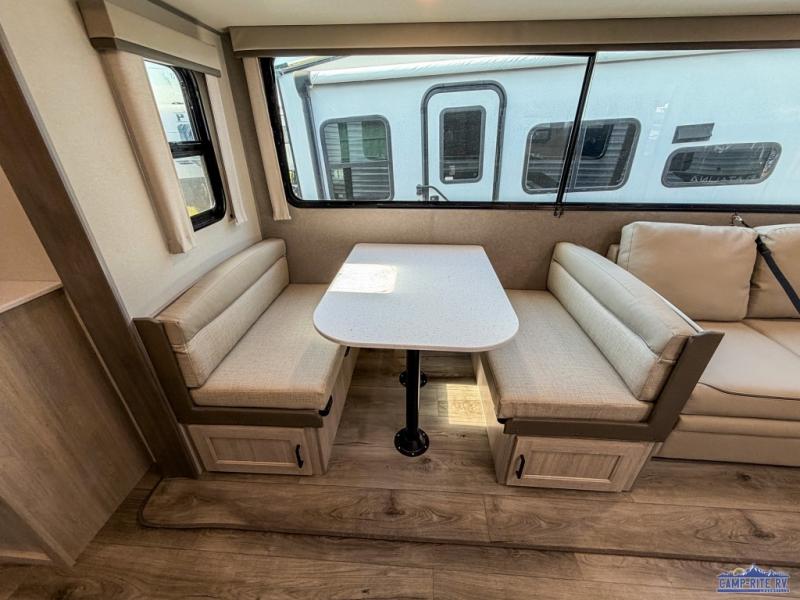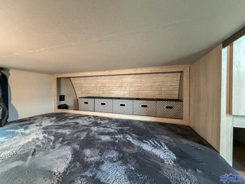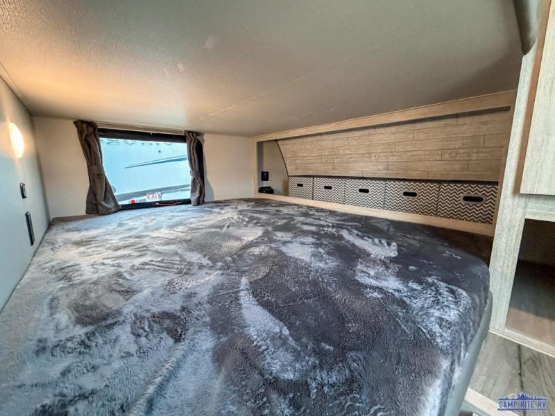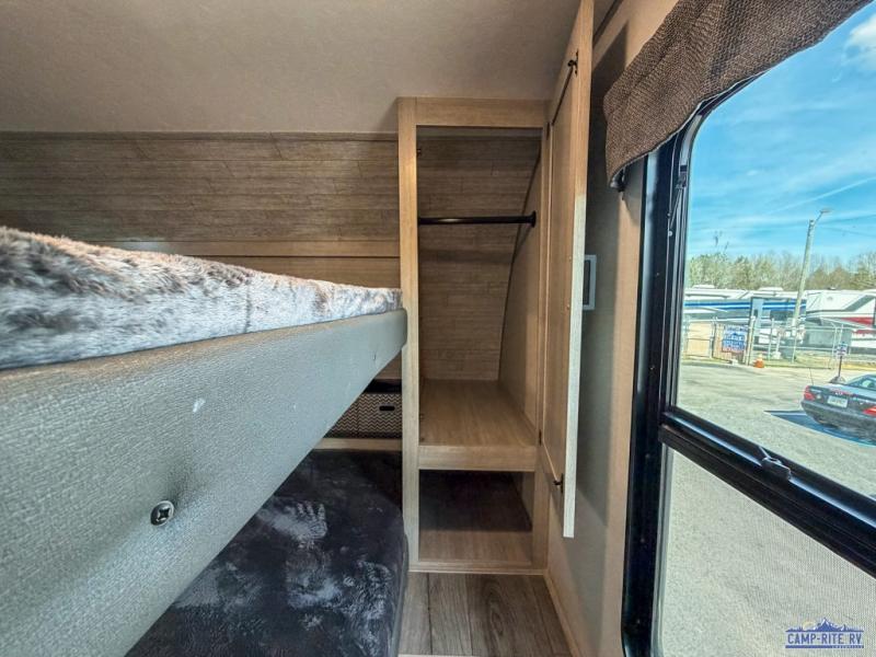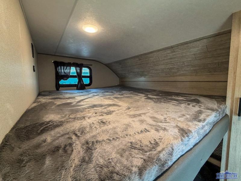 The rear bathroom is extremely convenient, allowing you to refresh and get ready without fuss. The queen bed is perfect for cozy nights, with a vanity for getting ready and a wardrobe to stash your clothes, plus the entertainment center is great for movie nights. In the living room/kitchen combined area, the booth dinette is ideal for meals or games, the trundle sofa is a great spot for extra chill time or accommodating guests, and the kitchen is equipped with a refrigerator, microwave, and overhead cabinets, ideal for easy eats and snacks. Additionally, the double-size bunk beds are perfect for the crew, kids, friends, or family, assuring everyone’s comfort.