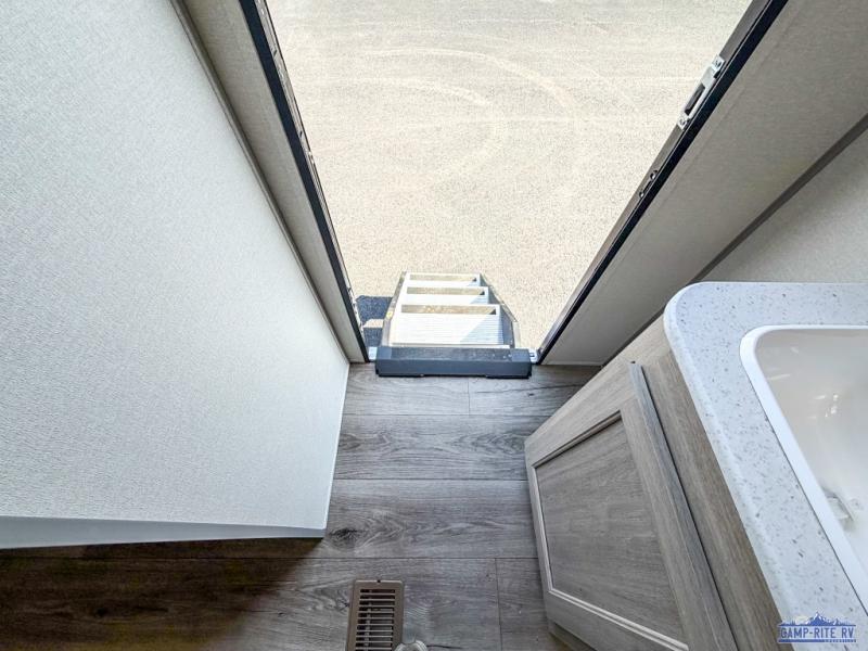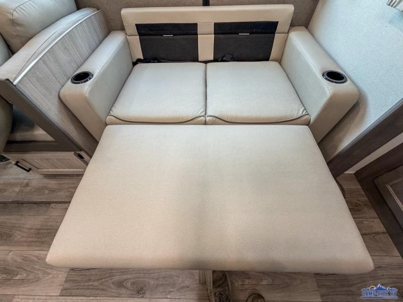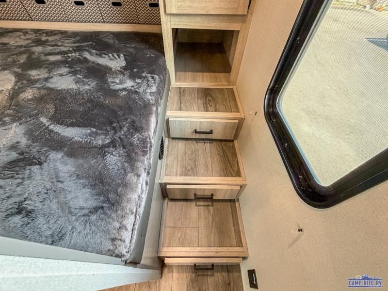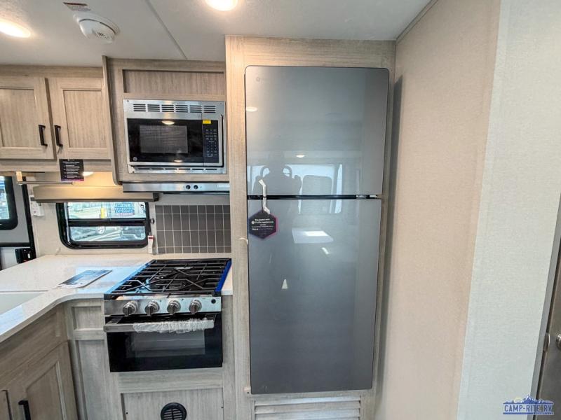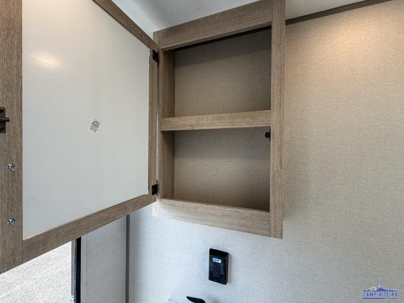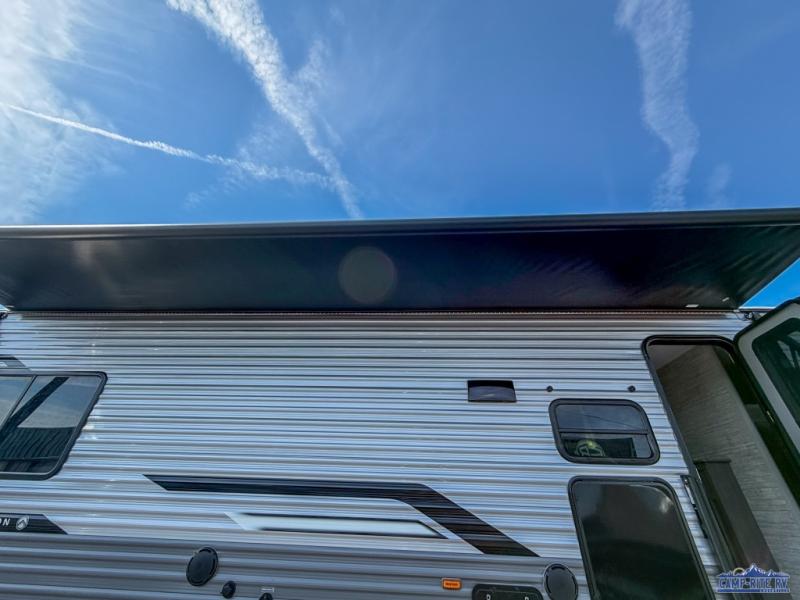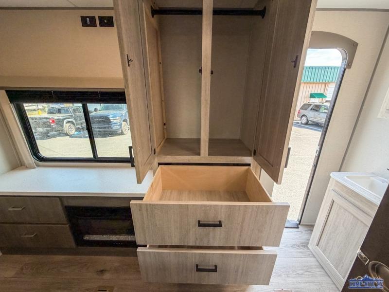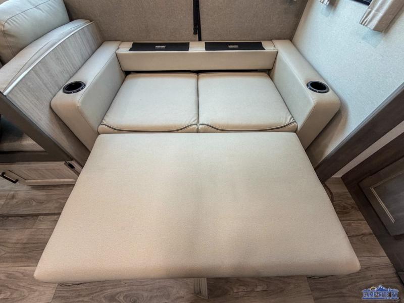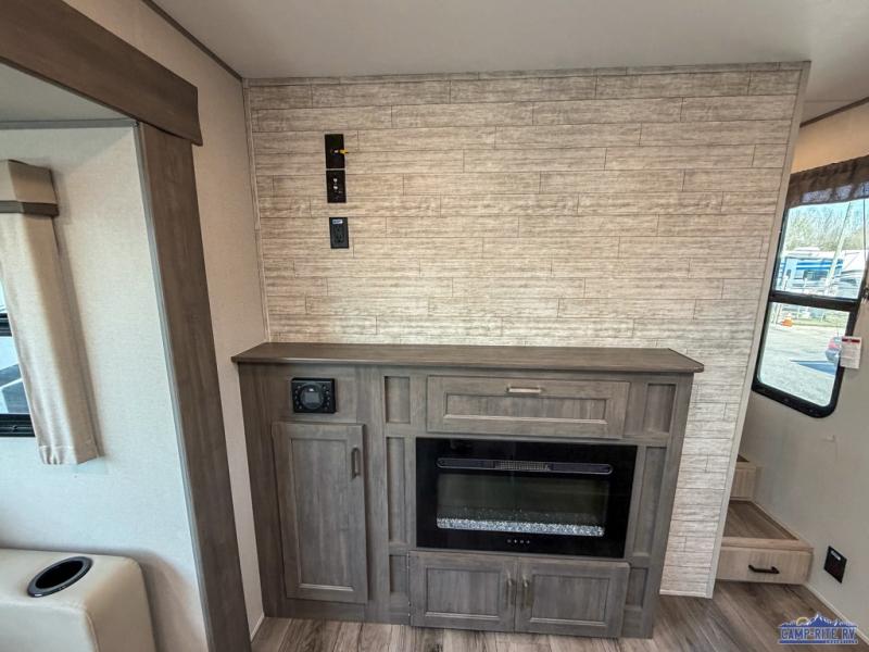 The rear bathroom is extremely convenient, allowing you to refresh and get ready without fuss. The queen bed is perfect for cozy nights, with a vanity for getting ready and a wardrobe to stash your clothes, plus the entertainment center is great for movie nights. In the living room/kitchen combined area, the booth dinette is ideal for meals or games, the trundle sofa is a great spot for extra chill time or accommodating guests, and the kitchen is equipped with a refrigerator, microwave, and overhead cabinets, ideal for easy eats and snacks. Additionally, the double-size bunk beds are perfect for the crew, kids, friends, or family, assuring everyone’s comfort.