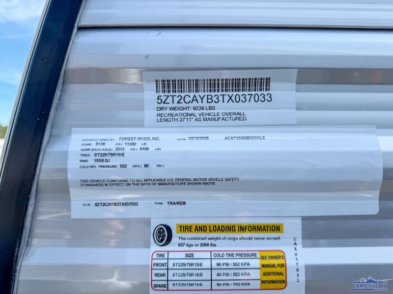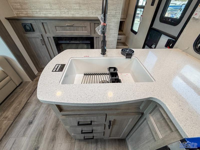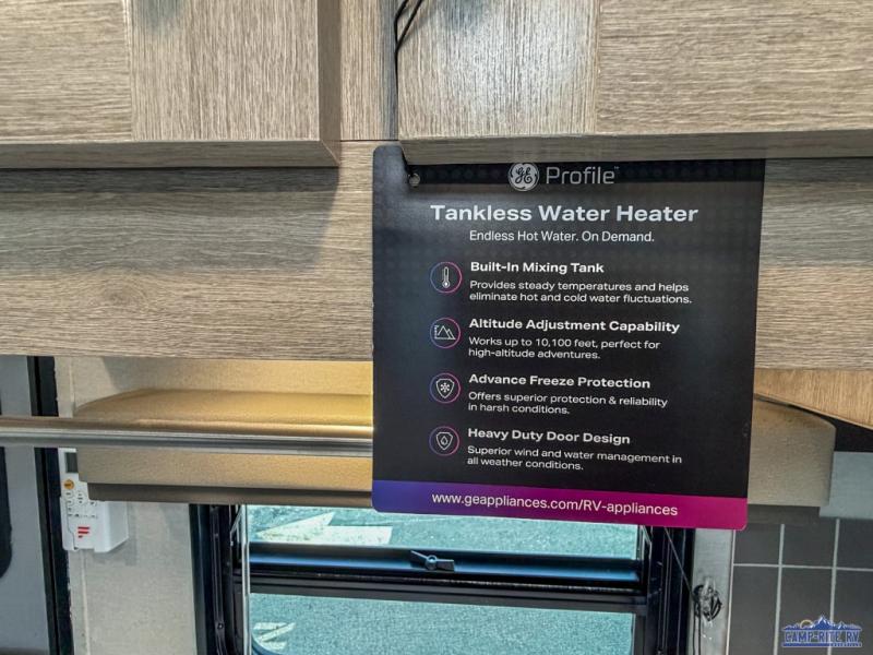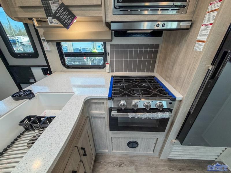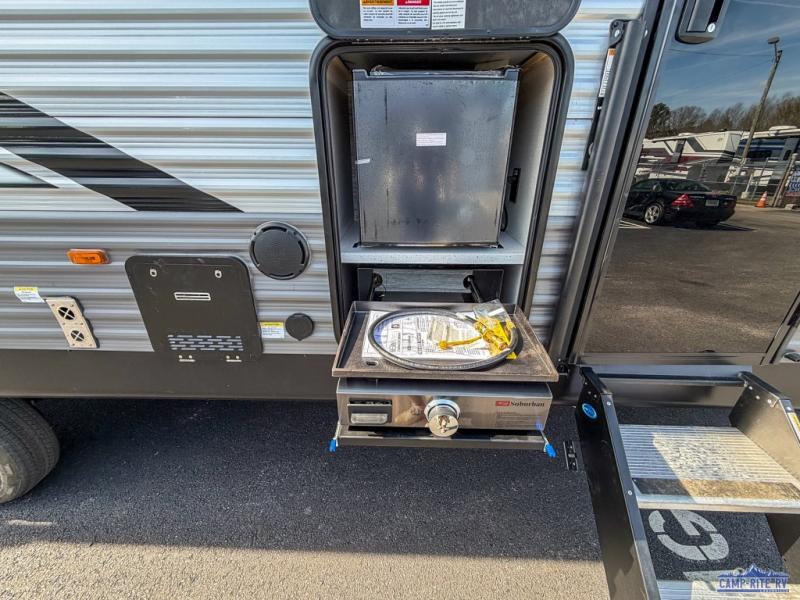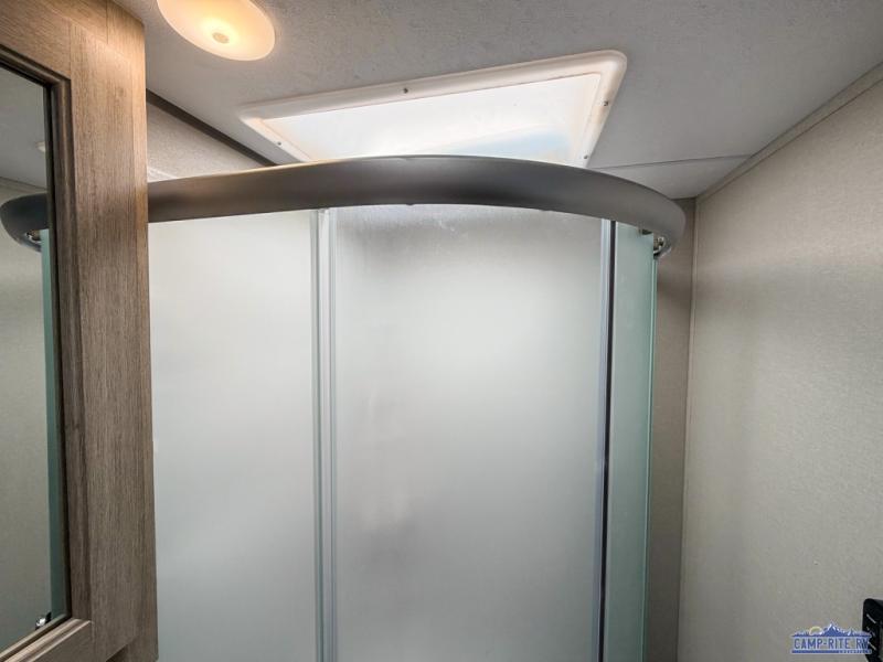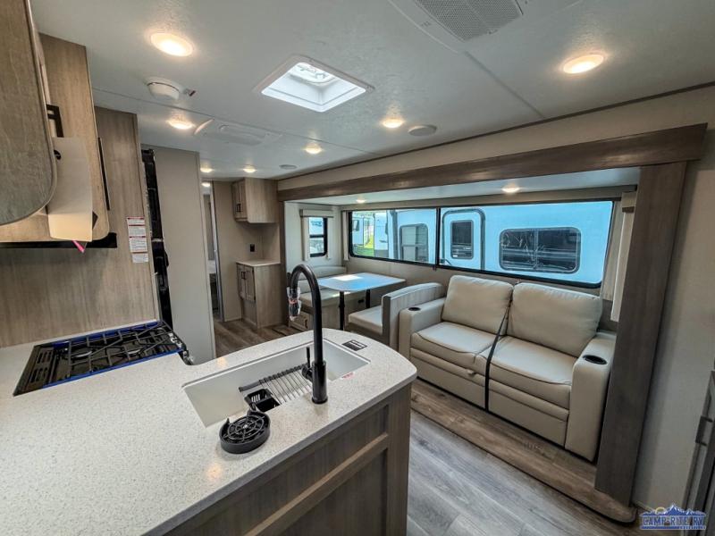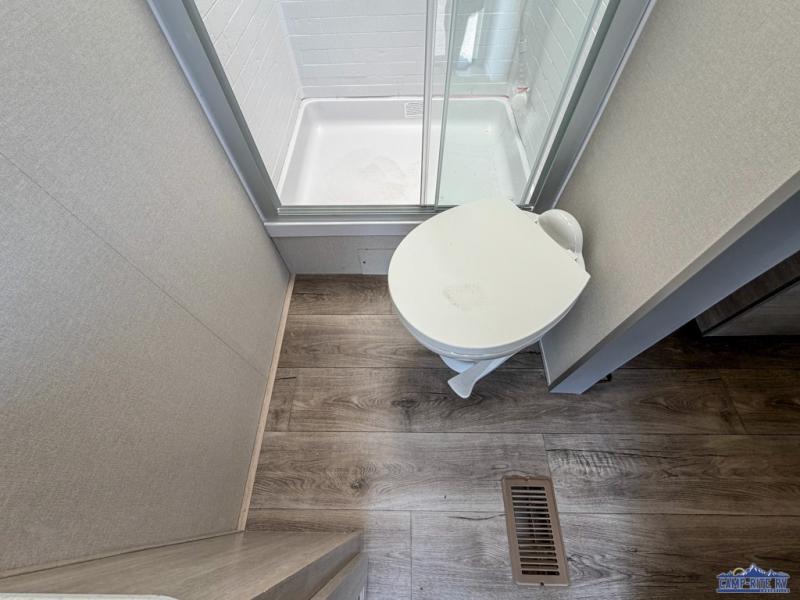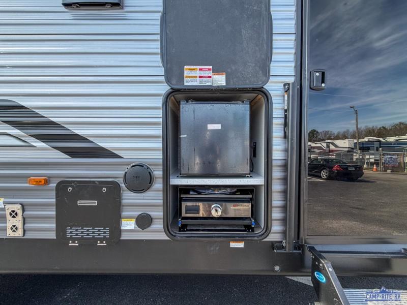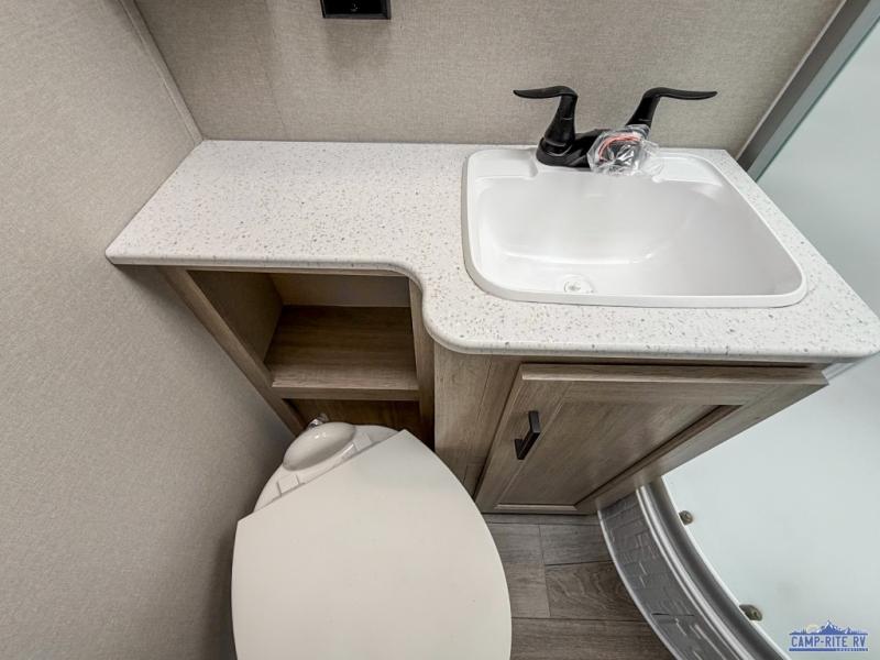 The rear bathroom is extremely convenient, allowing you to refresh and get ready without fuss. The queen bed is perfect for cozy nights, with a vanity for getting ready and a wardrobe to stash your clothes, plus the entertainment center is great for movie nights. In the living room/kitchen combined area, the booth dinette is ideal for meals or games, the trundle sofa is a great spot for extra chill time or accommodating guests, and the kitchen is equipped with a refrigerator, microwave, and overhead cabinets, ideal for easy eats and snacks. Additionally, the double-size bunk beds are perfect for the crew, kids, friends, or family, assuring everyone’s comfort.