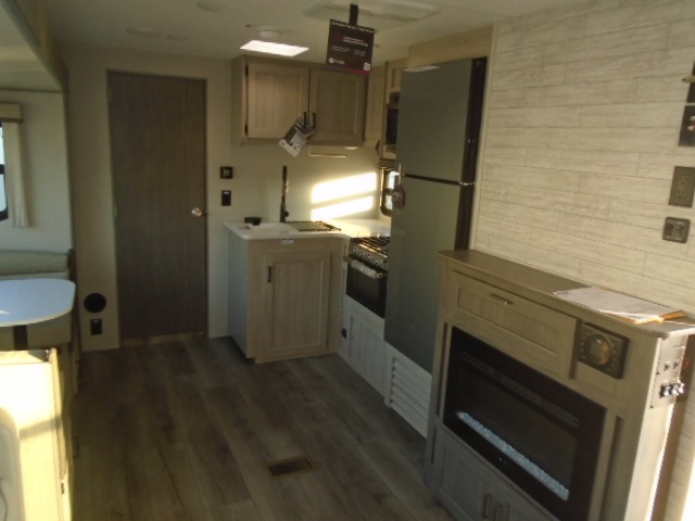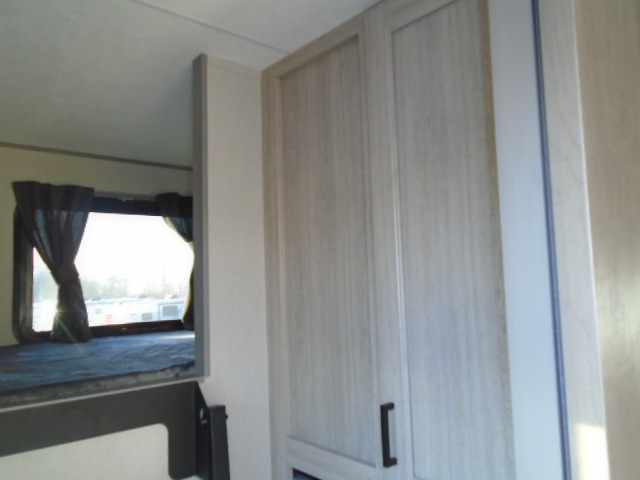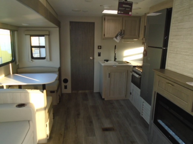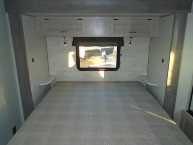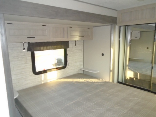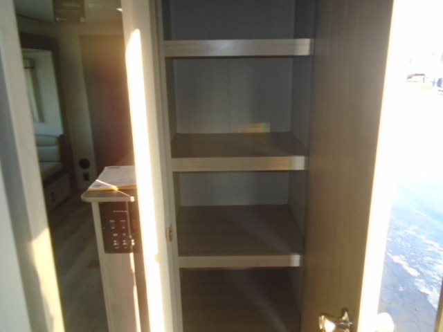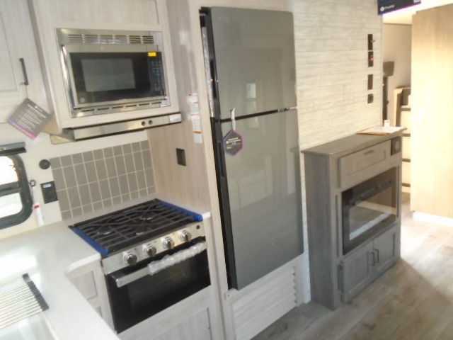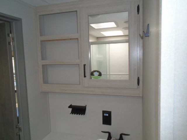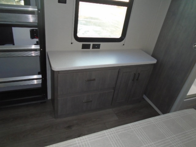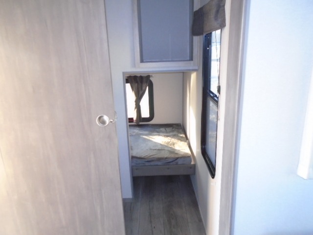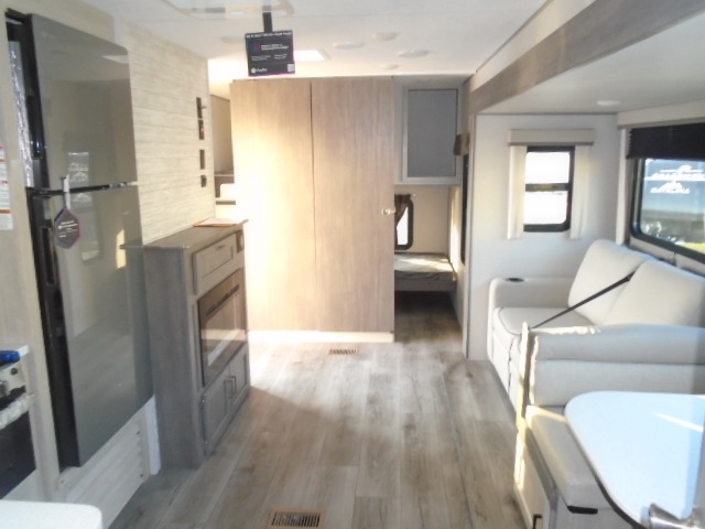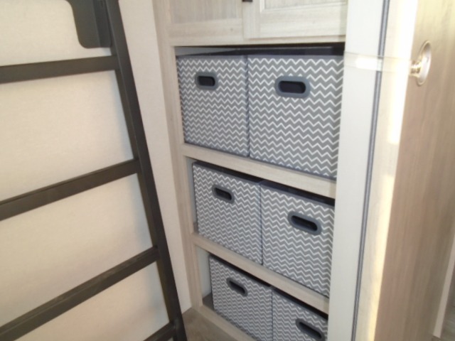 The bunk beds are perfect for the crew: kids, friends, or family, everyone’s comfy. The trundle sofa is a great spot for extra chill time or accommodating guests. The dinette is ideal for meals, homework, or game nights. And with the entertainment center, movie nights are a breeze. The walk-in closet/pantry gives you plenty of space to stash snacks, drinks, and more. The kitchen’s equipped with a refrigerator, microwave, and sink, perfect for easy meals and quick bites. Further, the walk-through bathroom is super handy, so you can refresh and get ready without fuss. In addition, the queen bed is perfect for having comfy nights ahead, and the overhead cabinets, dresser, and closet are ideal for keeping things tidy and organized.