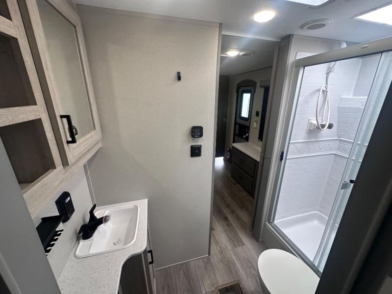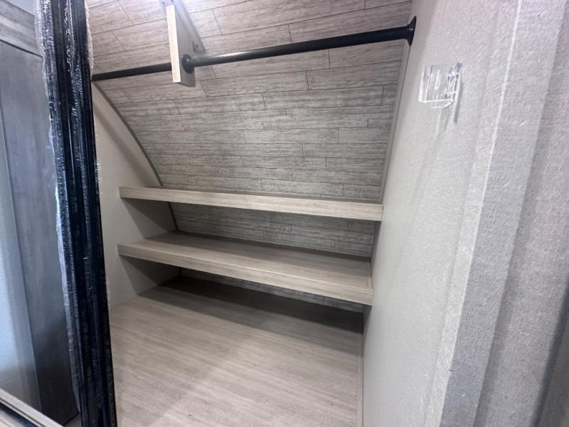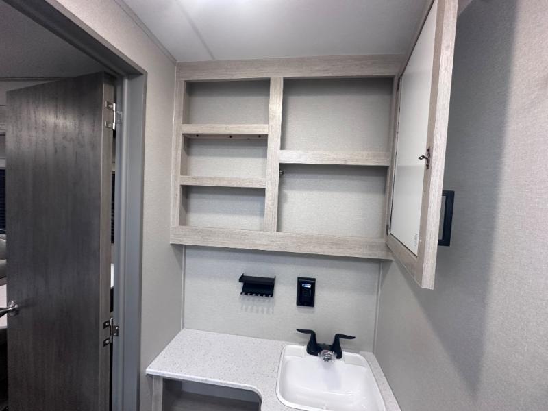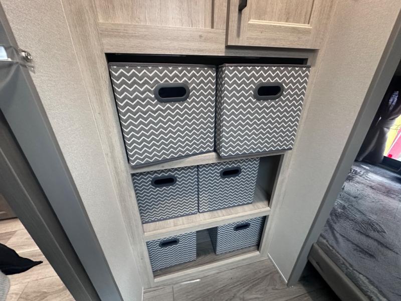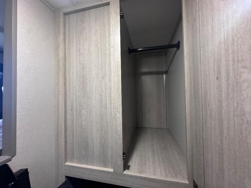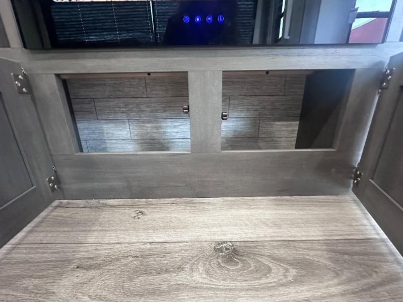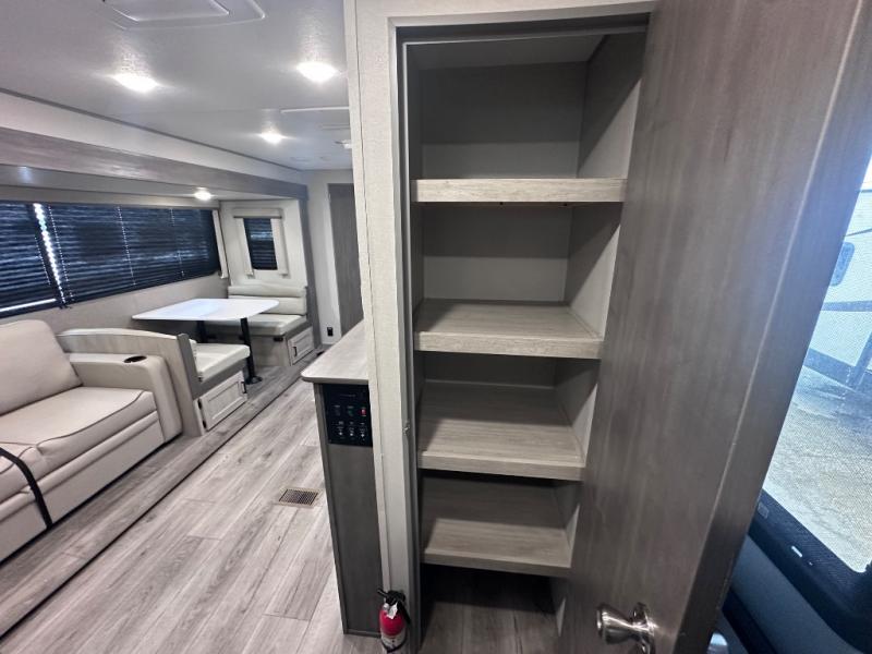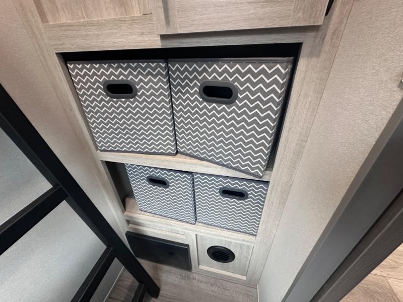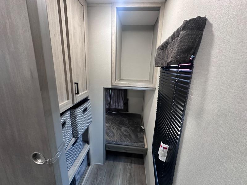 The bunk beds are perfect for the crew: kids, friends, or family, everyone’s comfy. The trundle sofa is a great spot for extra chill time or accommodating guests. The dinette is ideal for meals, homework, or game nights. And with the entertainment center, movie nights are a breeze. The walk-in closet/pantry gives you plenty of space to stash snacks, drinks, and more. The kitchen’s equipped with a refrigerator, microwave, and sink, perfect for easy meals and quick bites. Further, the walk-through bathroom is super handy, so you can refresh and get ready without fuss. In addition, the queen bed is perfect for having comfy nights ahead, and the overhead cabinets, dresser, and closet are ideal for keeping things tidy and organized.