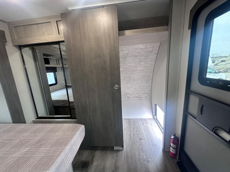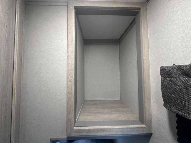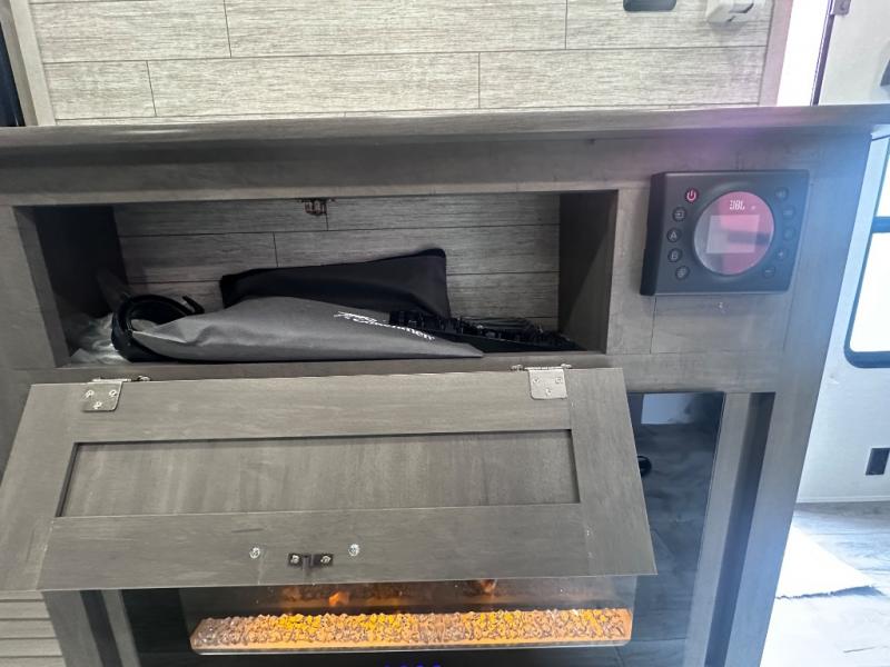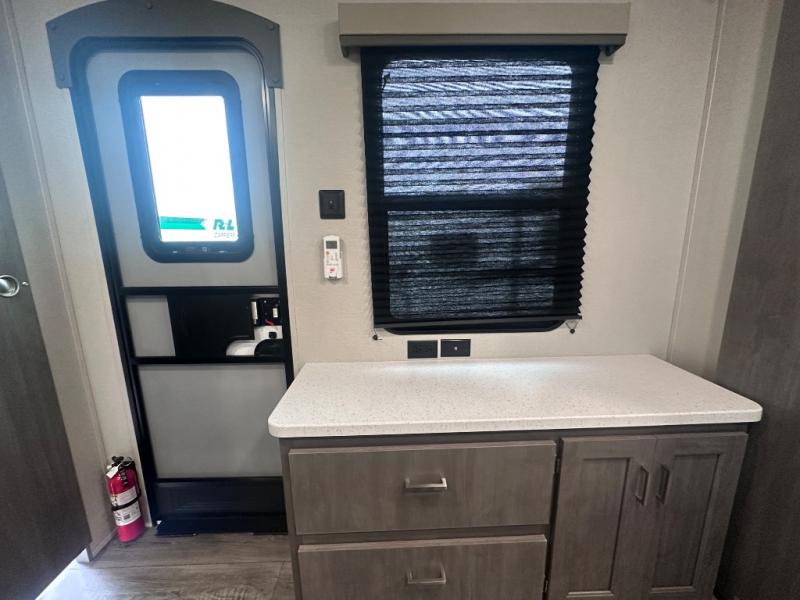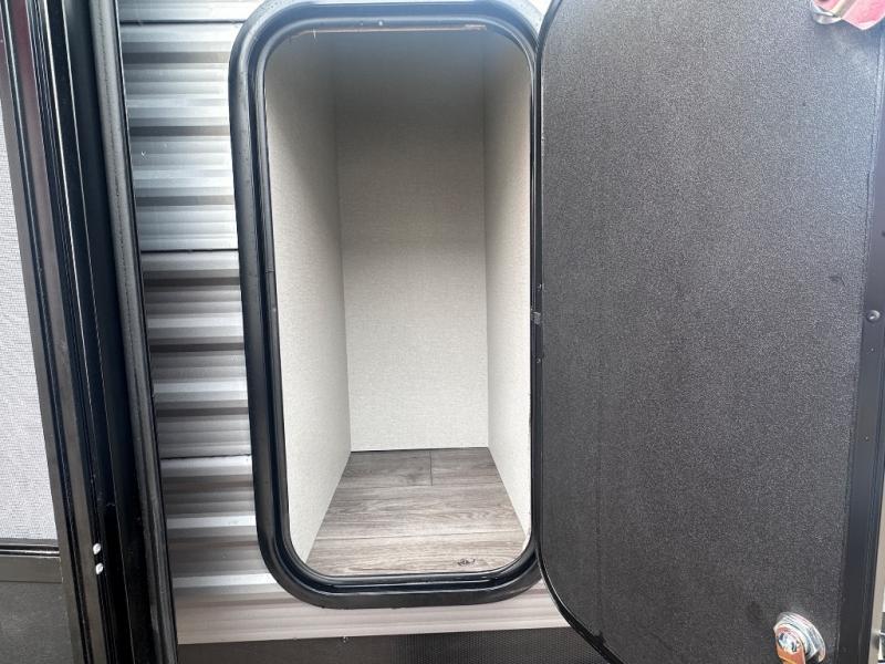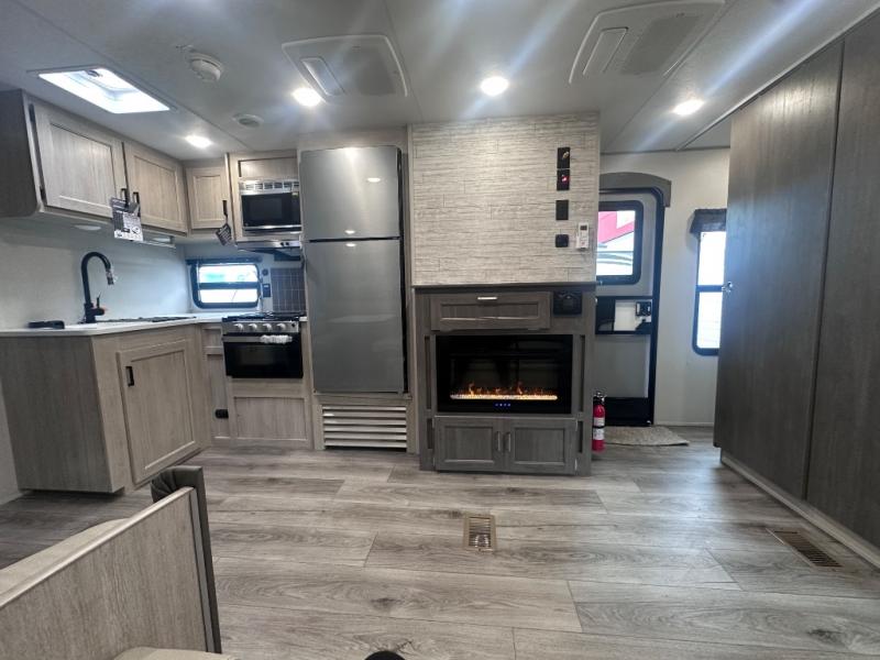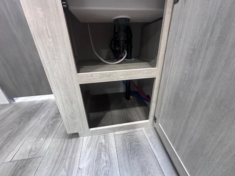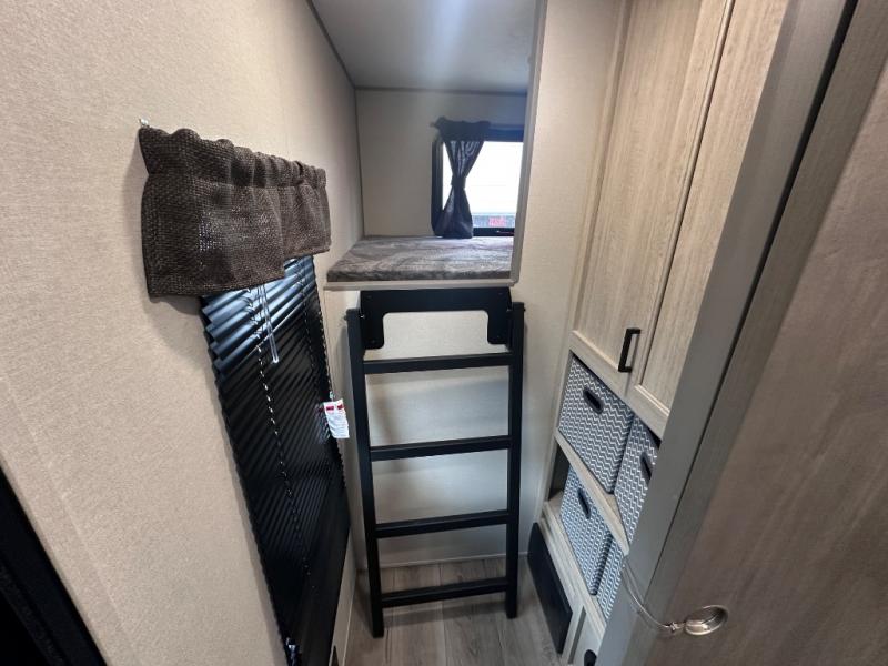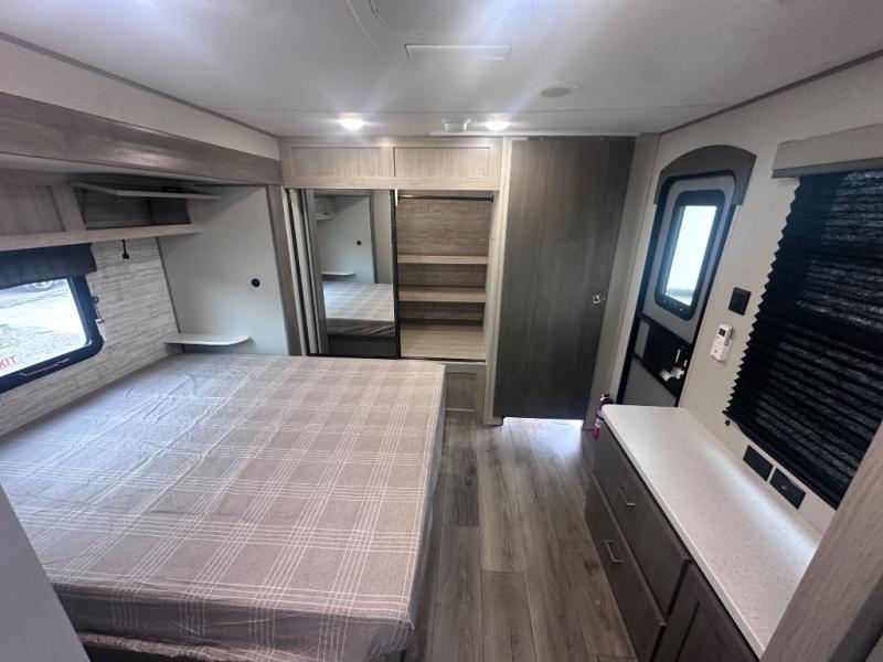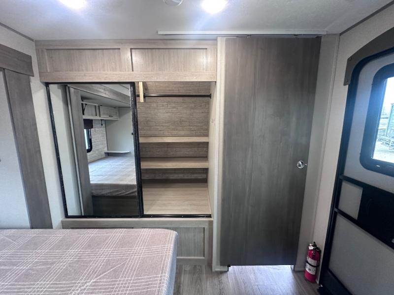 The bunk beds are perfect for the crew: kids, friends, or family, everyone’s comfy. The trundle sofa is a great spot for extra chill time or accommodating guests. The dinette is ideal for meals, homework, or game nights. And with the entertainment center, movie nights are a breeze. The walk-in closet/pantry gives you plenty of space to stash snacks, drinks, and more. The kitchen’s equipped with a refrigerator, microwave, and sink, perfect for easy meals and quick bites. Further, the walk-through bathroom is super handy, so you can refresh and get ready without fuss. In addition, the queen bed is perfect for having comfy nights ahead, and the overhead cabinets, dresser, and closet are ideal for keeping things tidy and organized.