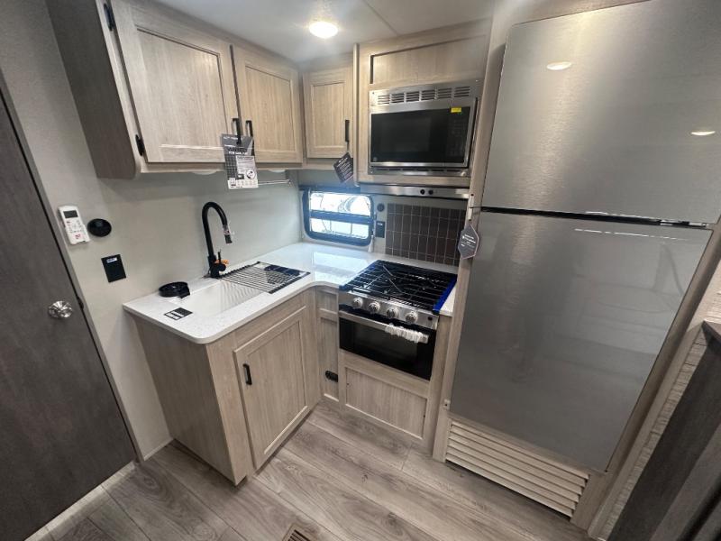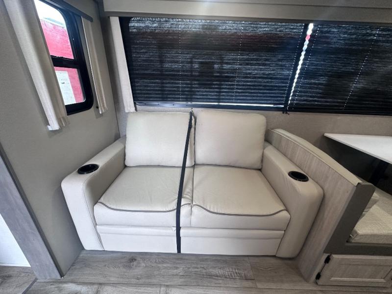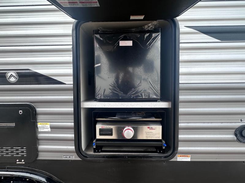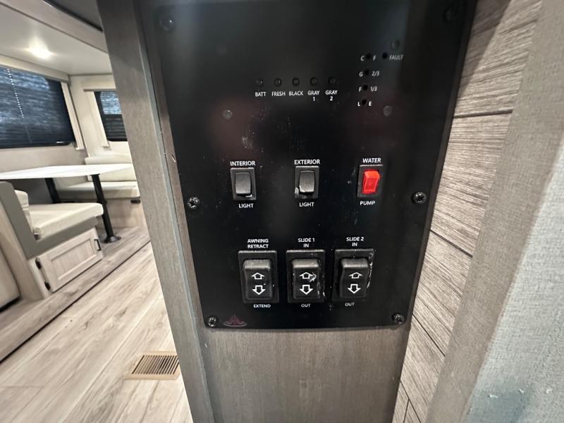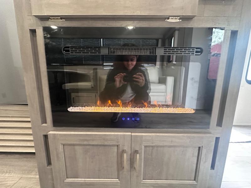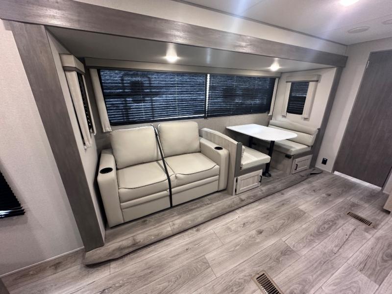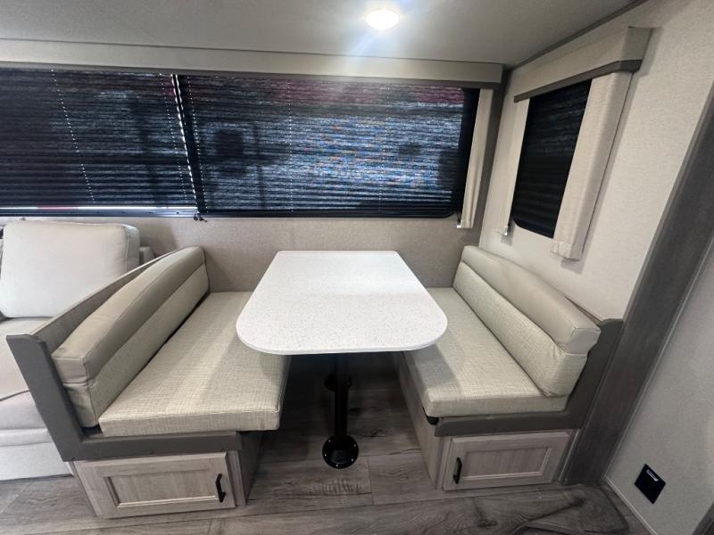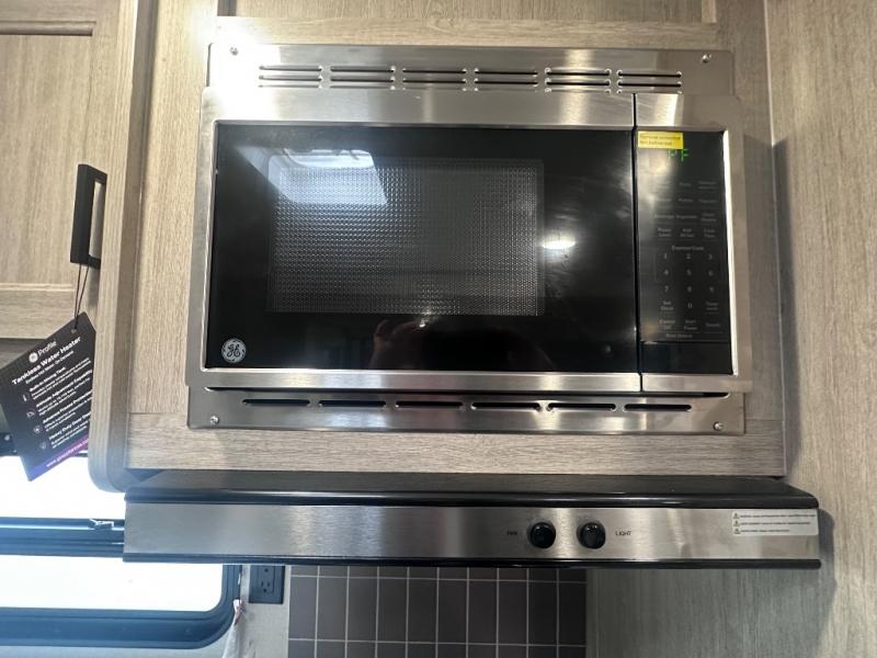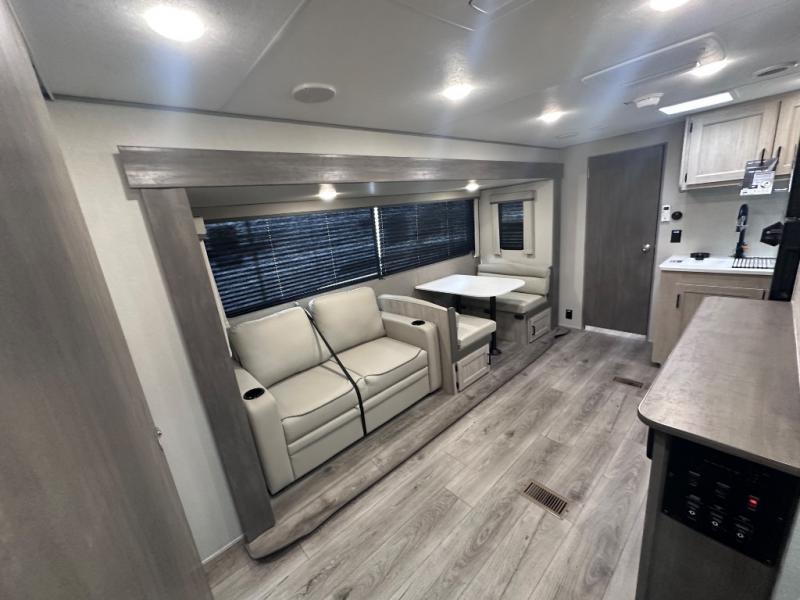 The bunk beds are perfect for the crew: kids, friends, or family, everyone’s comfy. The trundle sofa is a great spot for extra chill time or accommodating guests. The dinette is ideal for meals, homework, or game nights. And with the entertainment center, movie nights are a breeze. The walk-in closet/pantry gives you plenty of space to stash snacks, drinks, and more. The kitchen’s equipped with a refrigerator, microwave, and sink, perfect for easy meals and quick bites. Further, the walk-through bathroom is super handy, so you can refresh and get ready without fuss. In addition, the queen bed is perfect for having comfy nights ahead, and the overhead cabinets, dresser, and closet are ideal for keeping things tidy and organized.