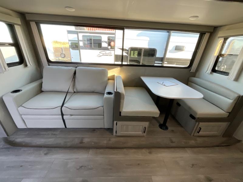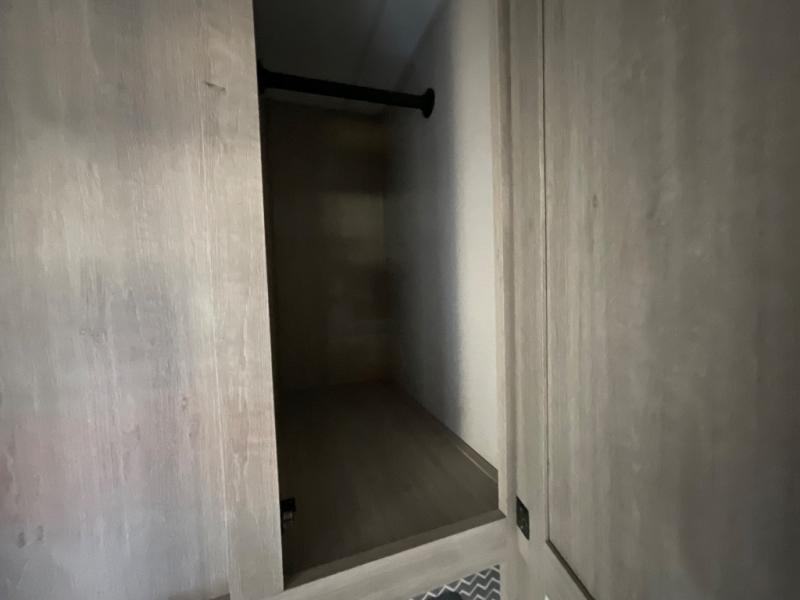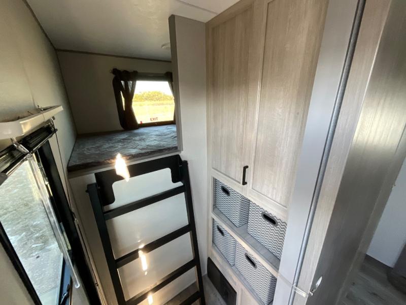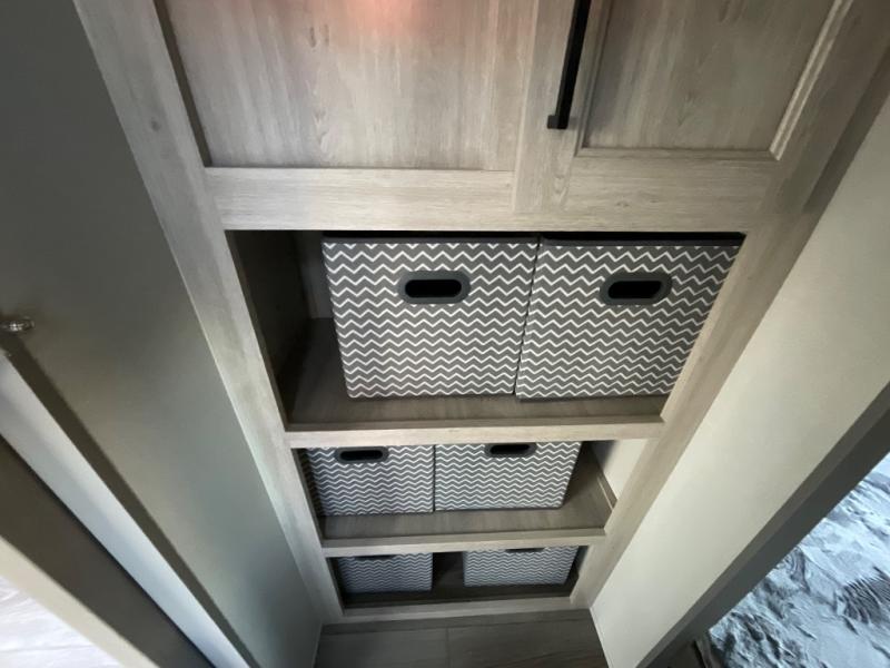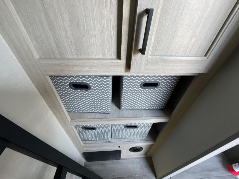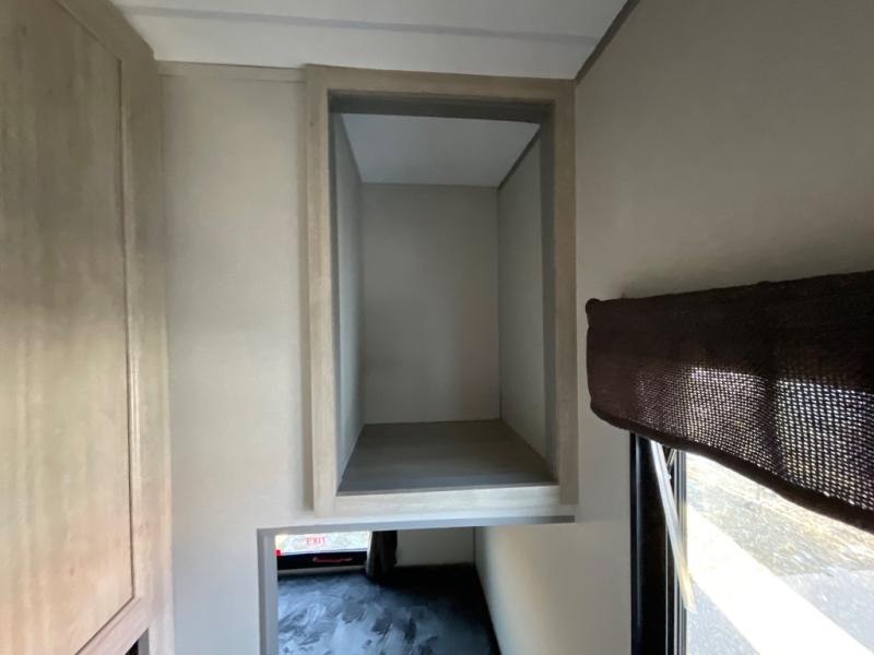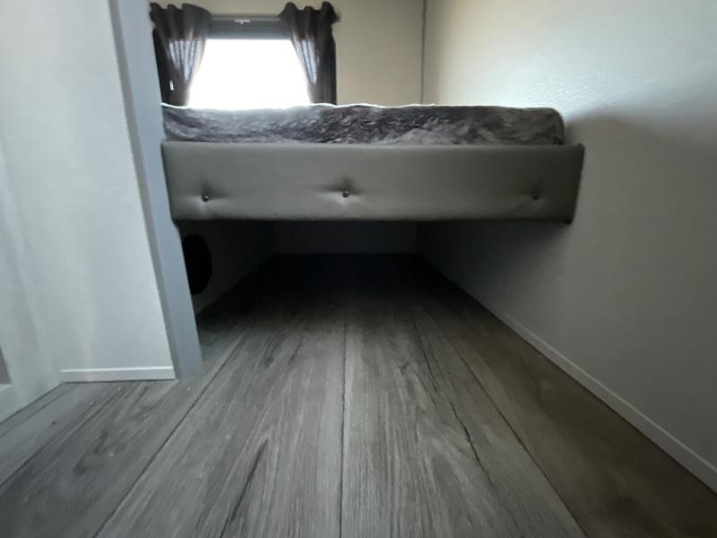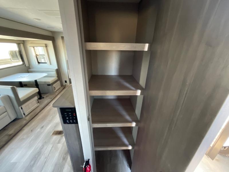The bunk beds are perfect for the crew: kids, friends, or family, everyone’s comfy. The trundle sofa is a great spot for extra chill time or accommodating guests. The dinette is ideal for meals, homework, or game nights. And with the entertainment center, movie nights are a breeze. The walk-in closet/pantry gives you plenty of space to stash snacks, drinks, and more. The kitchen’s equipped with a refrigerator, microwave, and sink, perfect for easy meals and quick bites. Further, the walk-through bathroom is super handy, so you can refresh and get ready without fuss. In addition, the queen bed is perfect for having comfy nights ahead, and the overhead cabinets, dresser, and closet are ideal for keeping things tidy and organized.