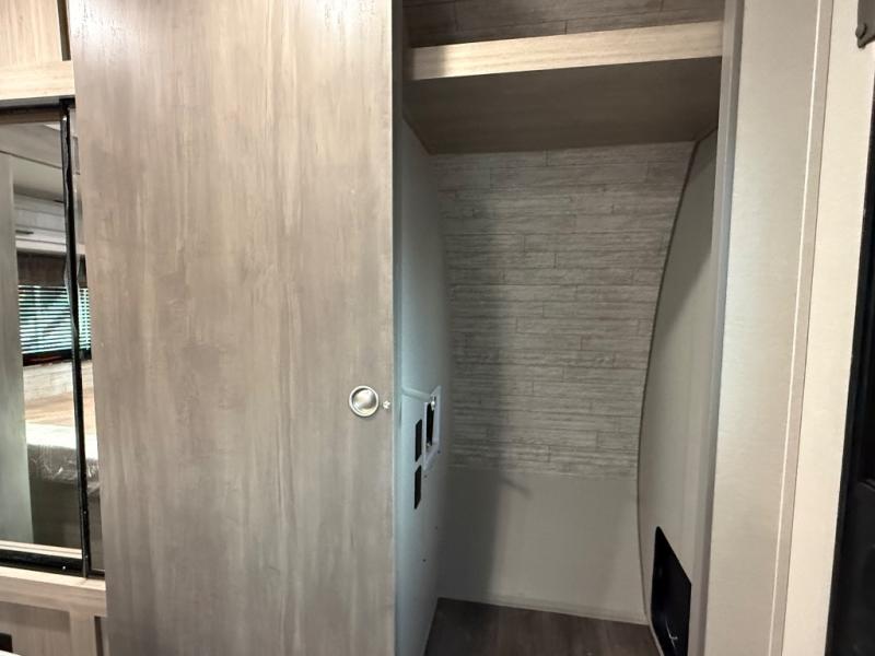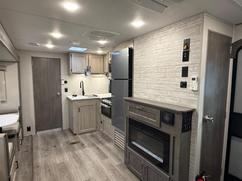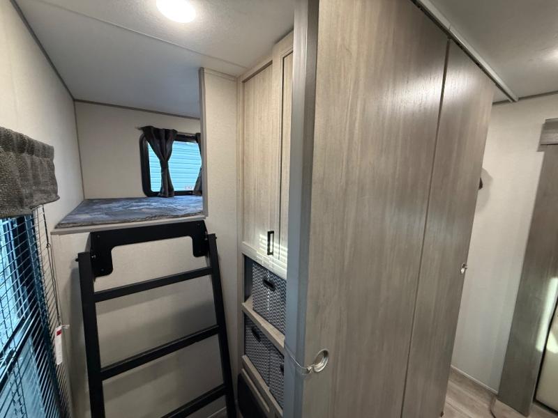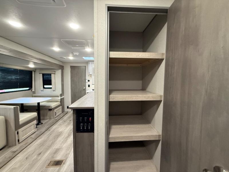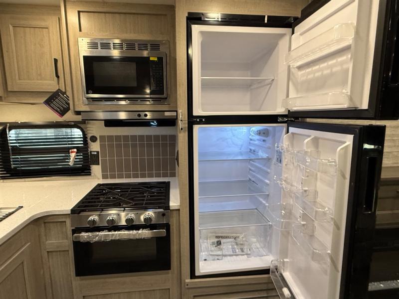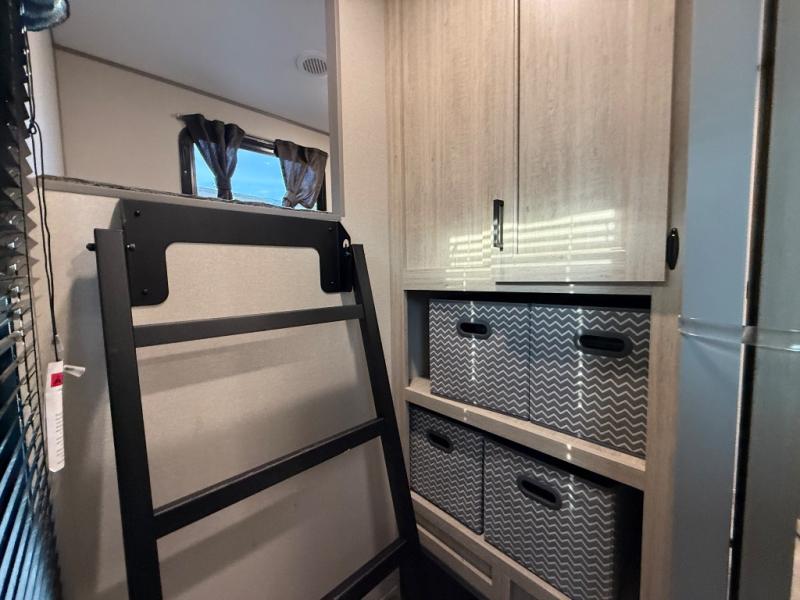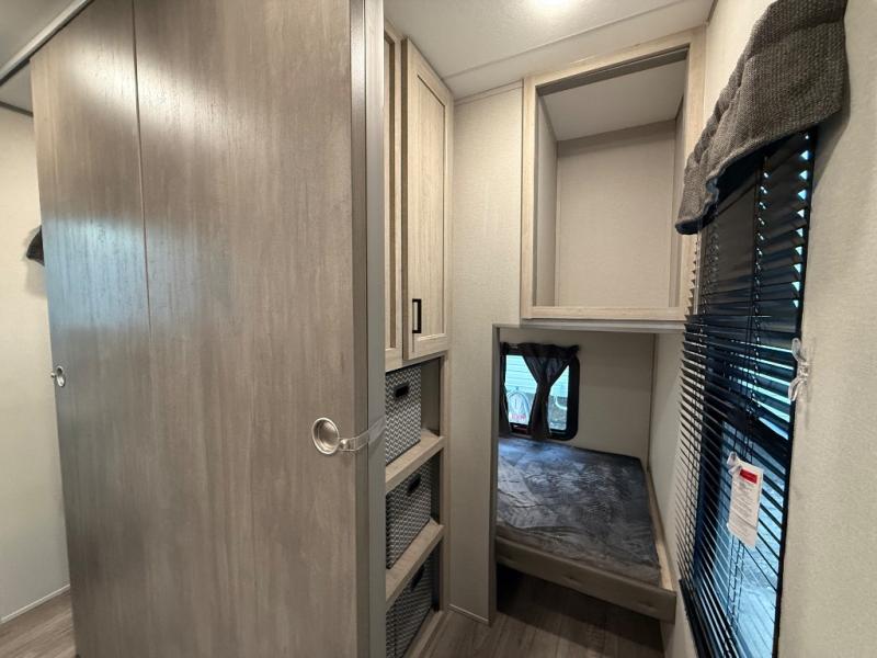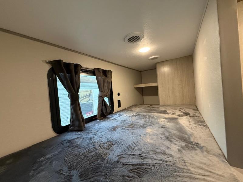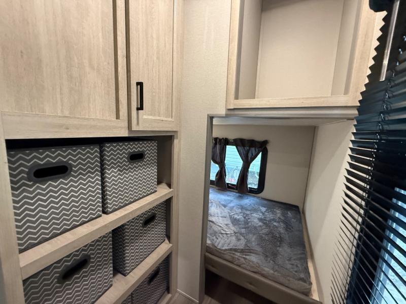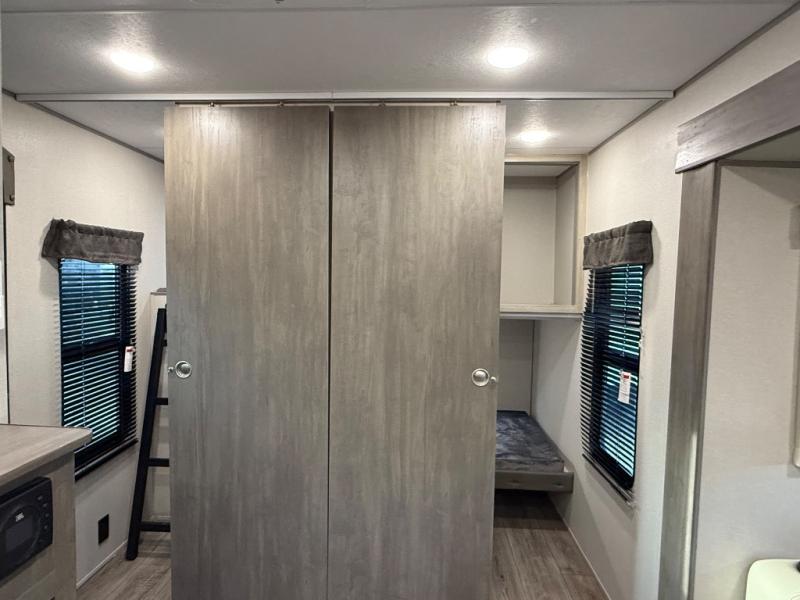 The bunk beds are perfect for the crew: kids, friends, or family, everyone’s comfy. The trundle sofa is a great spot for extra chill time or accommodating guests. The dinette is ideal for meals, homework, or game nights. And with the entertainment center, movie nights are a breeze. The walk-in closet/pantry gives you plenty of space to stash snacks, drinks, and more. The kitchen’s equipped with a refrigerator, microwave, and sink, perfect for easy meals and quick bites. Further, the walk-through bathroom is super handy, so you can refresh and get ready without fuss. In addition, the queen bed is perfect for having comfy nights ahead, and the overhead cabinets, dresser, and closet are ideal for keeping things tidy and organized.