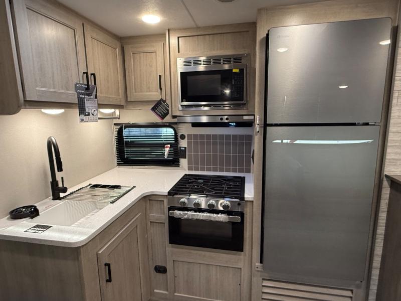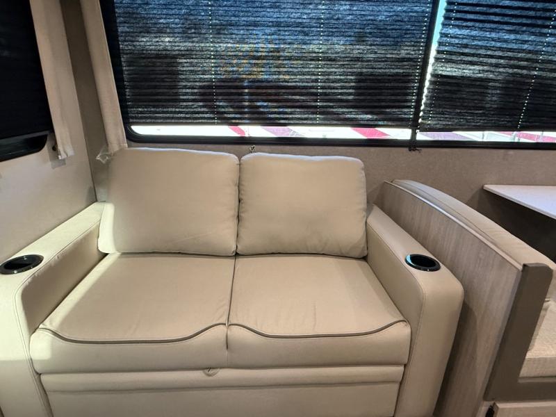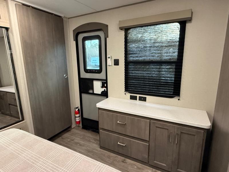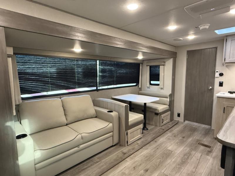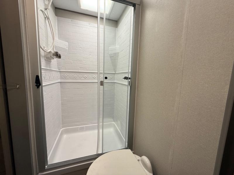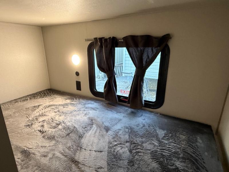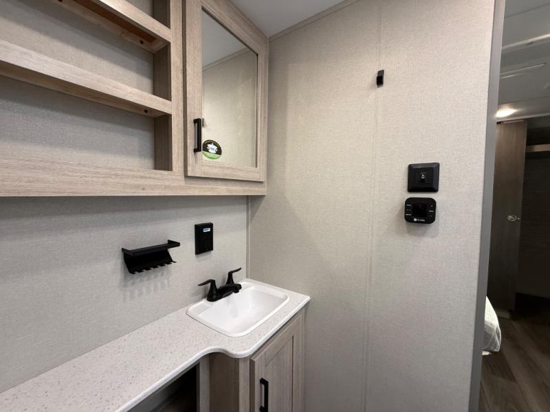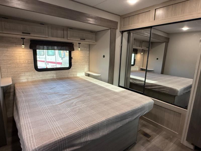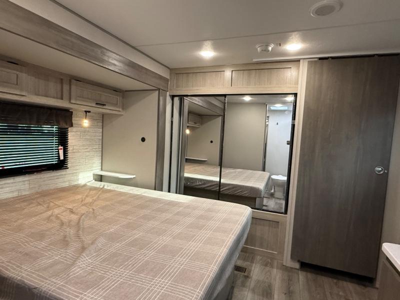 The bunk beds are perfect for the crew: kids, friends, or family, everyone’s comfy. The trundle sofa is a great spot for extra chill time or accommodating guests. The dinette is ideal for meals, homework, or game nights. And with the entertainment center, movie nights are a breeze. The walk-in closet/pantry gives you plenty of space to stash snacks, drinks, and more. The kitchen’s equipped with a refrigerator, microwave, and sink, perfect for easy meals and quick bites. Further, the walk-through bathroom is super handy, so you can refresh and get ready without fuss. In addition, the queen bed is perfect for having comfy nights ahead, and the overhead cabinets, dresser, and closet are ideal for keeping things tidy and organized.