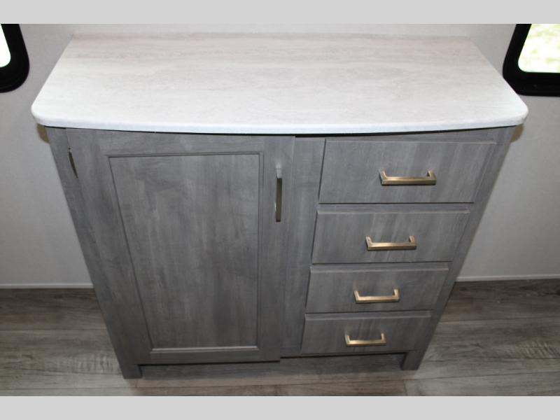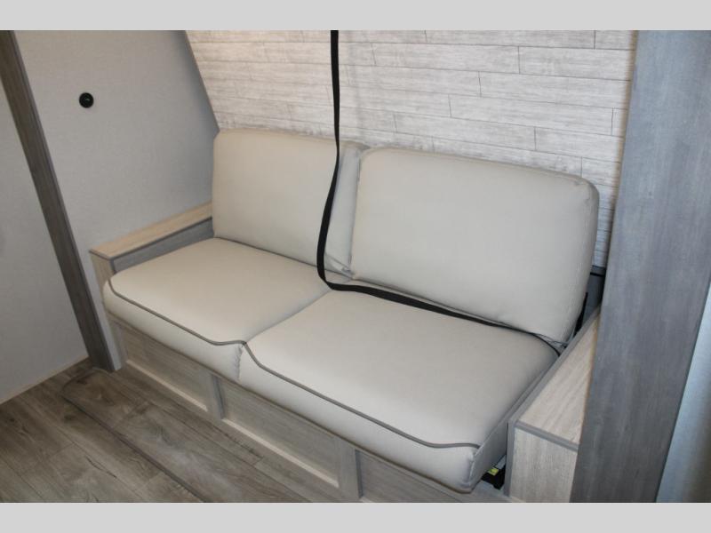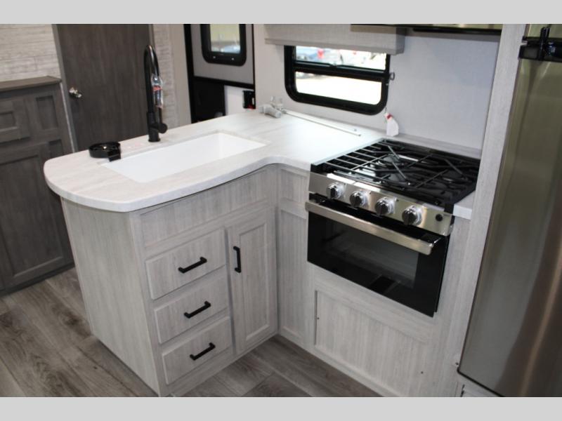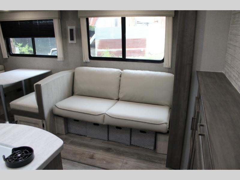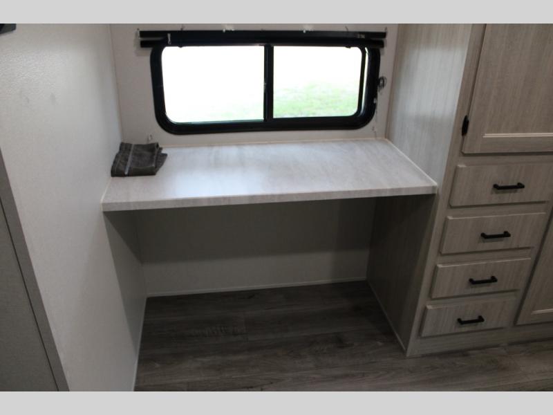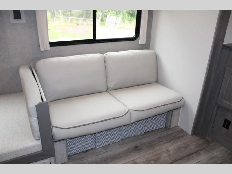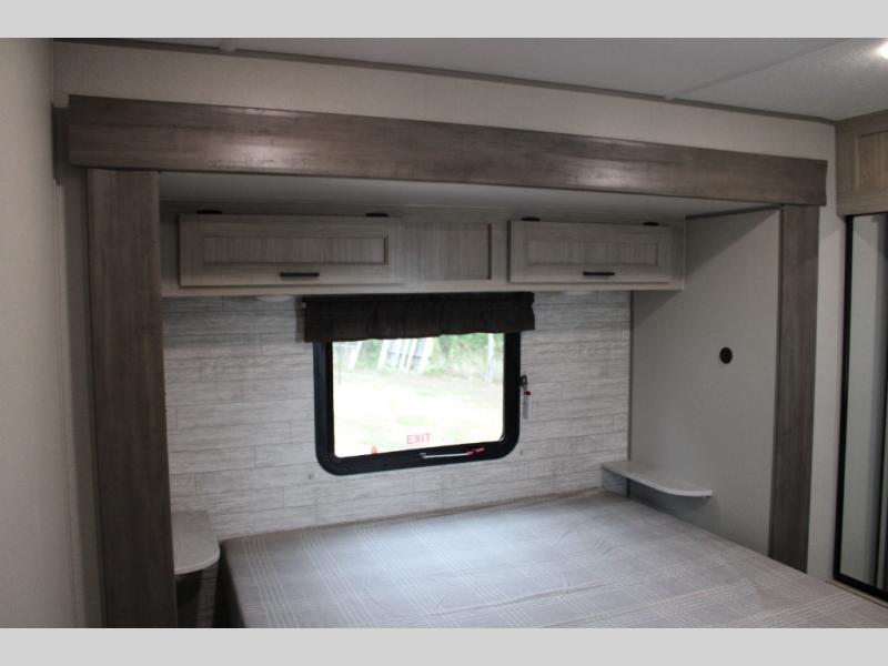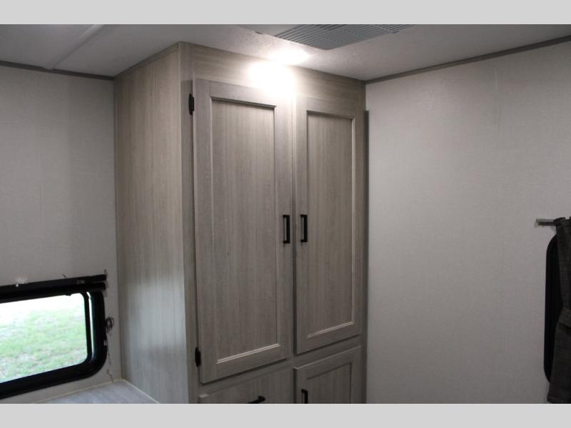 This unique travel trailer offers two bedrooms complete with a slide out RV queen beds with nightstands, and clothing storage. You can choose from the front bedroom with a large closet and a second closet prepped for a washer and dryer, or the rear bedroom with a wardrobe and TV cabinet. With three total slides throughout there is space for everyone! You and your family will love the combined living and kitchen area with a slide out booth dinette and sofa with drink holders, and maybe you'll decide to add the fireplace option. The L-shaped kitchen counter allows the cook to make meals without moving for anyone trying to get to the full bathroom or either bedroom. And when you want to relax outdoors, the 21' power awning with multicolor LED lights allows you to choose the color you like best.