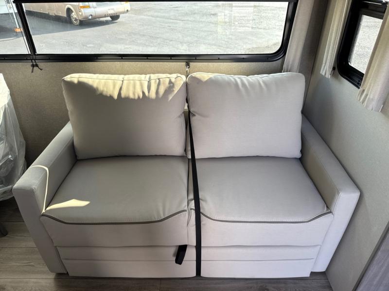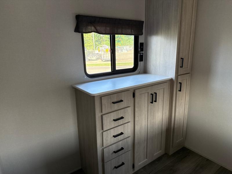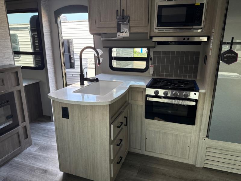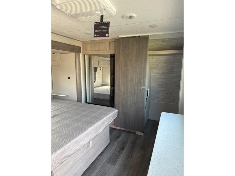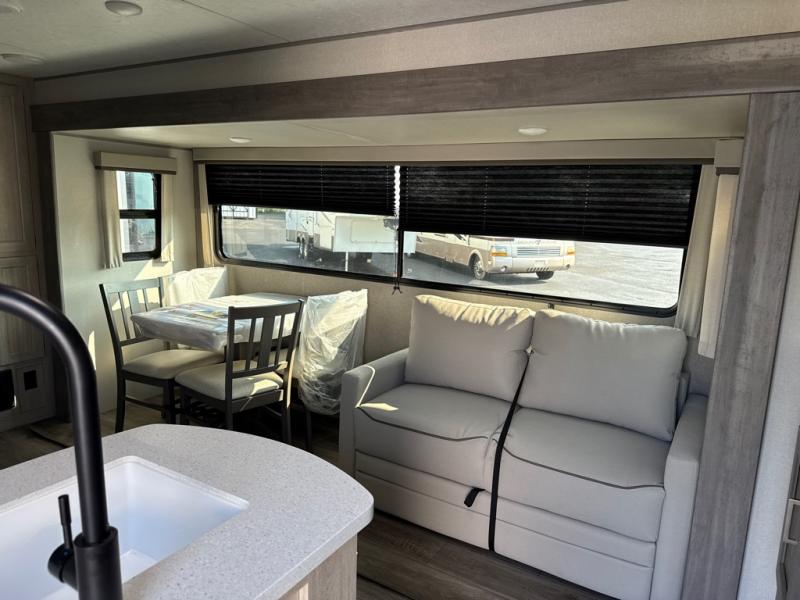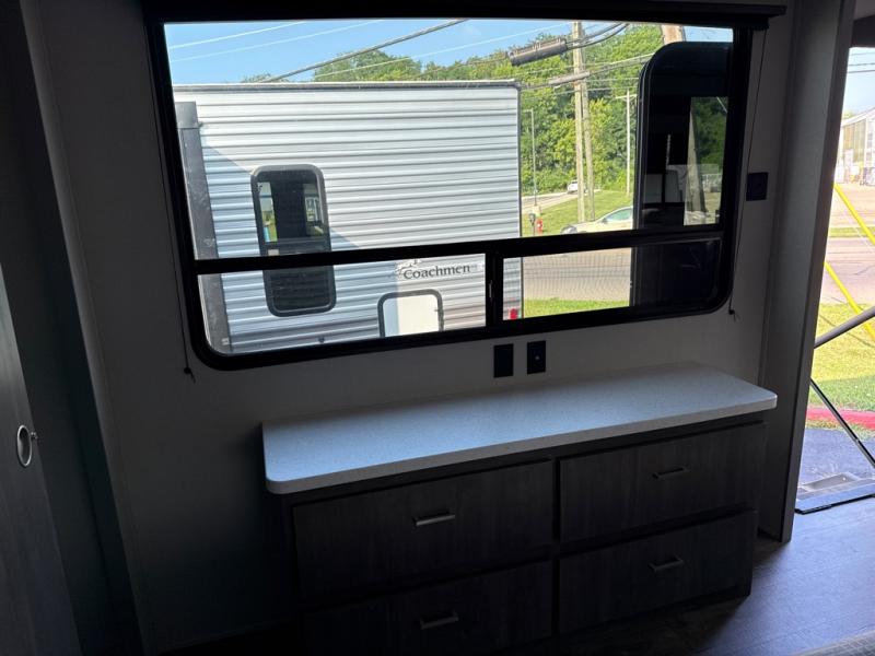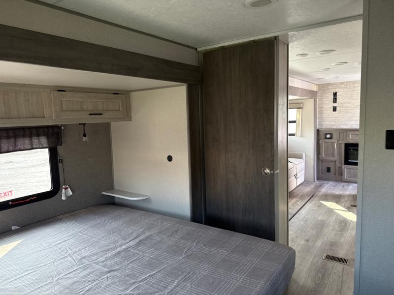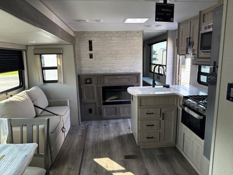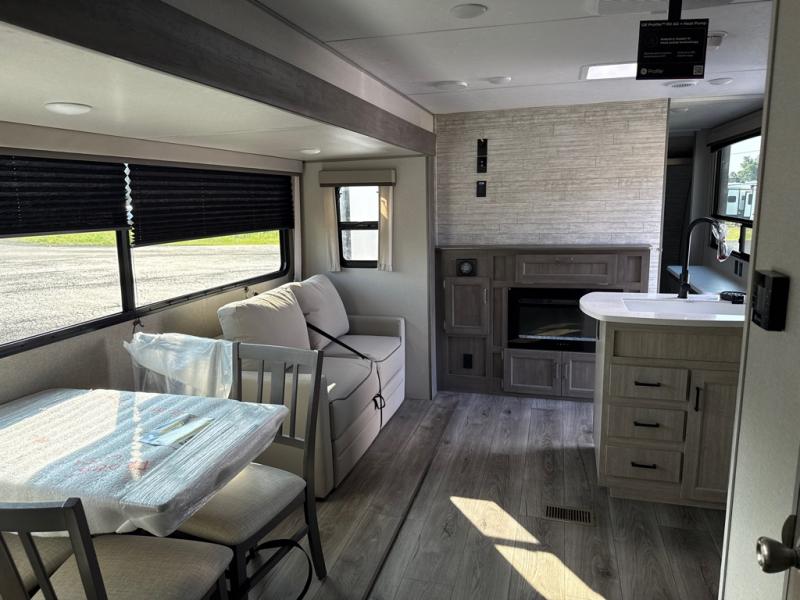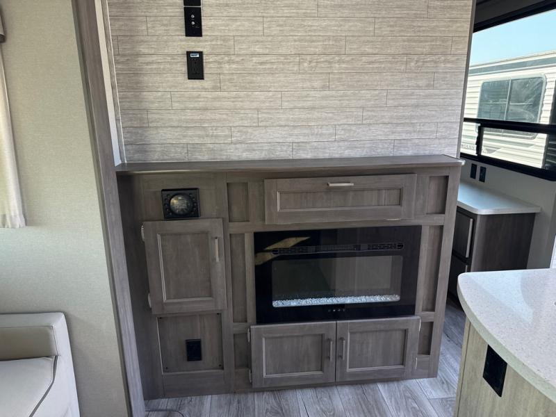This unique travel trailer offers two bedrooms complete with a slide out queen beds with nightstands, and clothing storage. You can choose from the front bedroom with a large closet and a second closet prepped for a washer and dryer, or the rear bedroom with a wardrobe and TV cabinet. With three total slides throughout there is space for everyone! You and your family will love the combined living and kitchen area with a slide out booth dinette and sofa with drink holders, and maybe you'll decide to add the fireplace option. The L-shaped kitchen counter allows the cook to make meals without moving for anyone trying to get to the full bathroom or either bedroom. And when you want to relax outdoors, the 21' power awning with multicolor LED lights allows you to choose the color you like best.