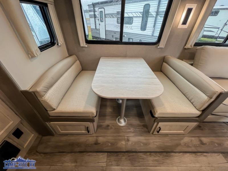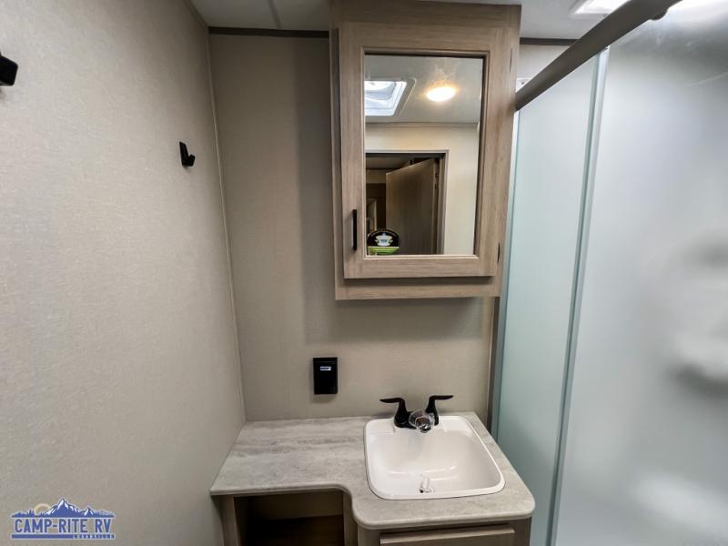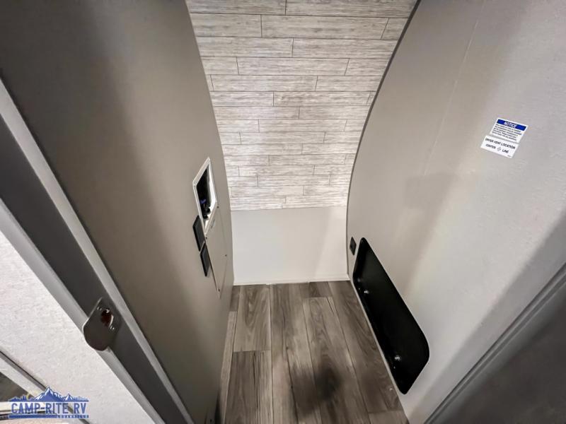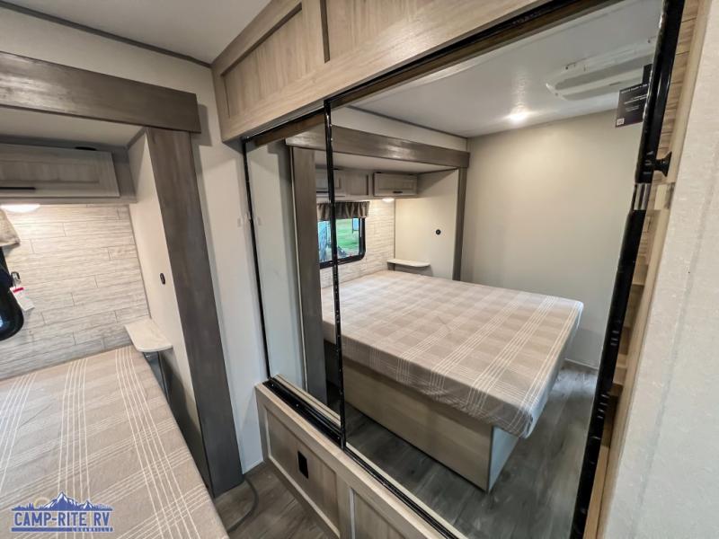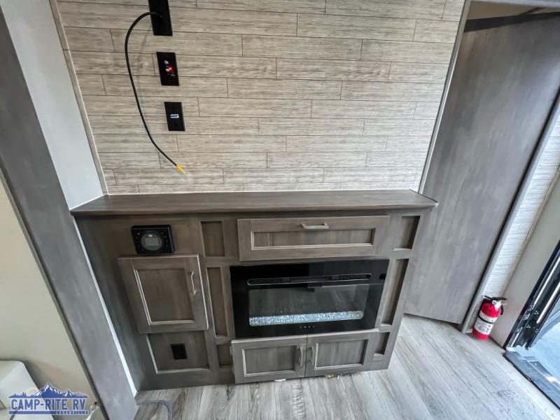 This unique travel trailer offers two bedrooms complete with a slide out queen beds with nightstands, and clothing storage. You can choose from the front bedroom with a large closet and a second closet prepped for a washer and dryer, or the rear bedroom with a wardrobe and TV cabinet. With three total slides throughout there is space for everyone! You and your family will love the combined living and kitchen area with a slide out booth dinette and sofa with drink holders, and maybe you'll decide to add the fireplace option. The L-shaped kitchen counter allows the cook to make meals without moving for anyone trying to get to the full bathroom or either bedroom. And when you want to relax outdoors, the 21' power awning with multicolor LED lights allows you to choose the color you like best.