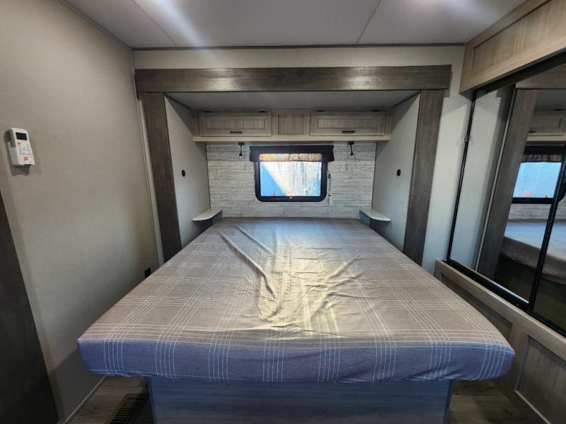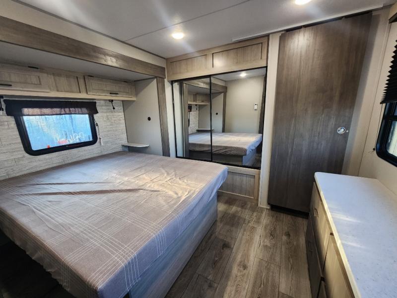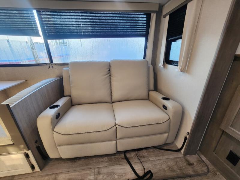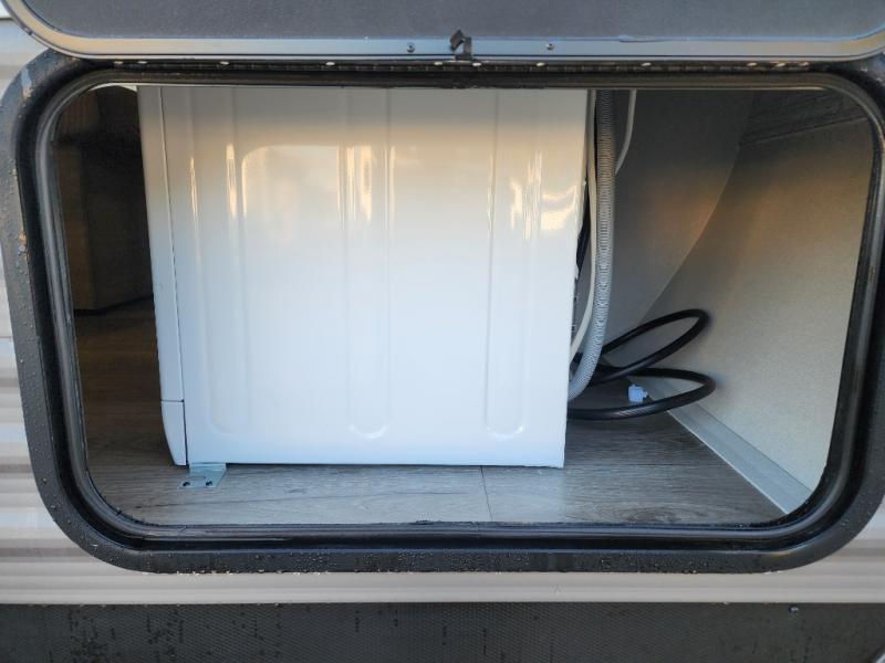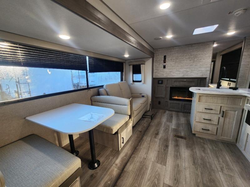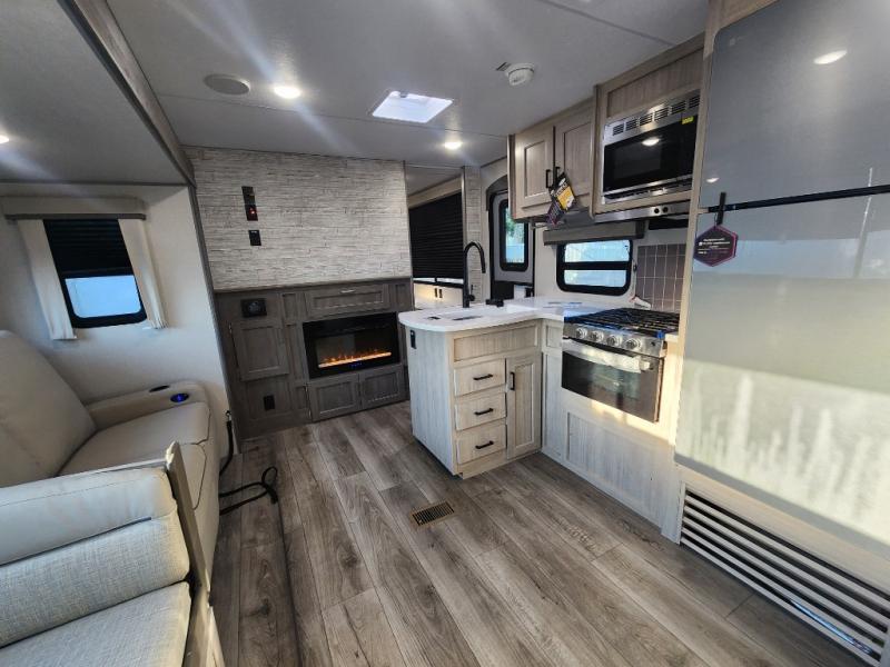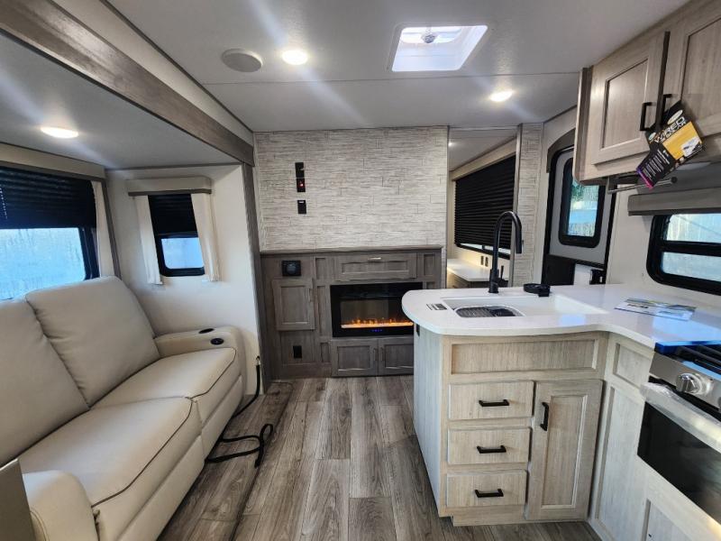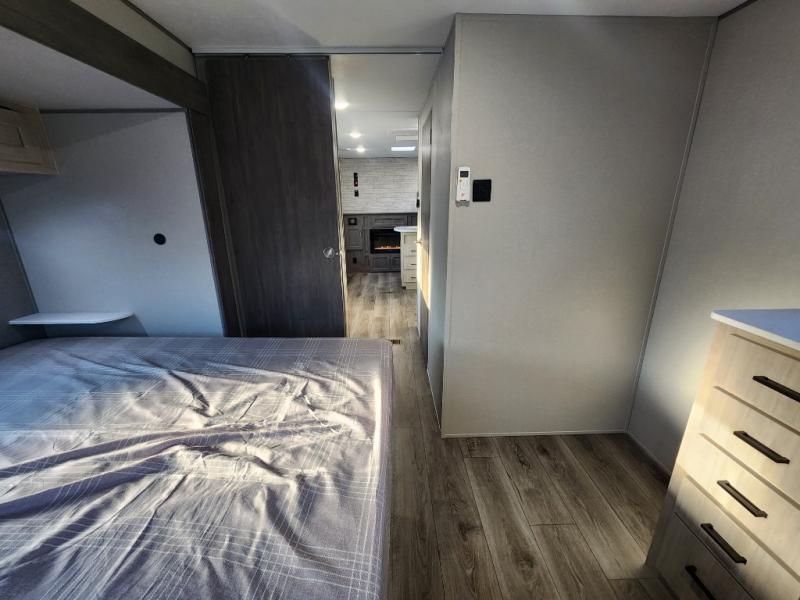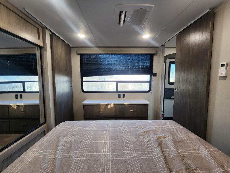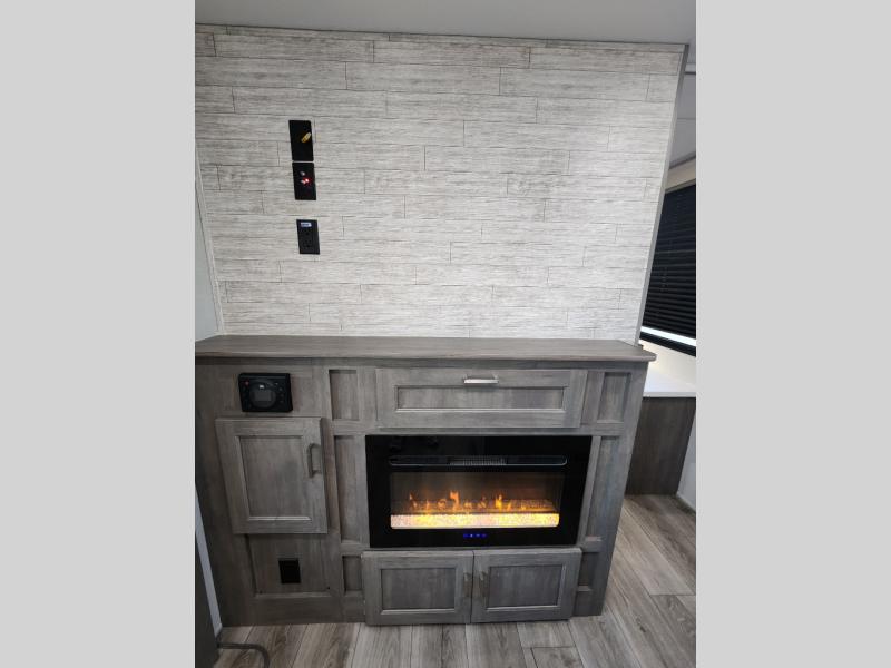 This unique travel trailer offers two bedrooms complete with a slide out queen beds with nightstands, and clothing storage. You can choose from the front bedroom with a large closet and a second closet prepped for a washer and dryer, or the rear bedroom with a wardrobe and TV cabinet. With three total slides throughout there is space for everyone! You and your family will love the combined living and kitchen area with a slide out booth dinette and sofa with drink holders, and maybe you'll decide to add the fireplace option. The L-shaped kitchen counter allows the cook to make meals without moving for anyone trying to get to the full bathroom or either bedroom. And when you want to relax outdoors, the 21' power awning with multicolor LED lights allows you to choose the color you like best.