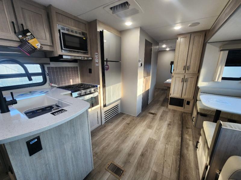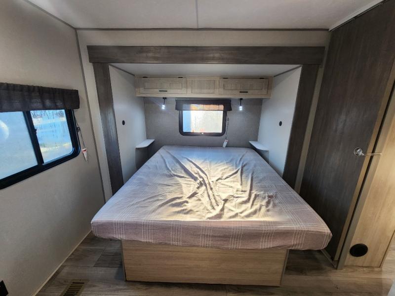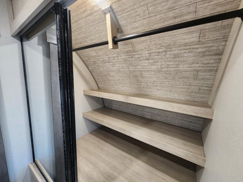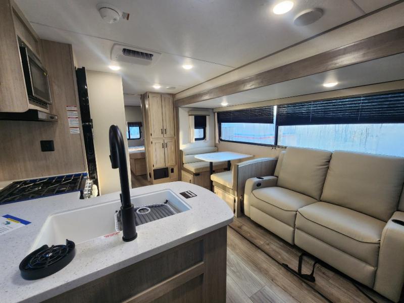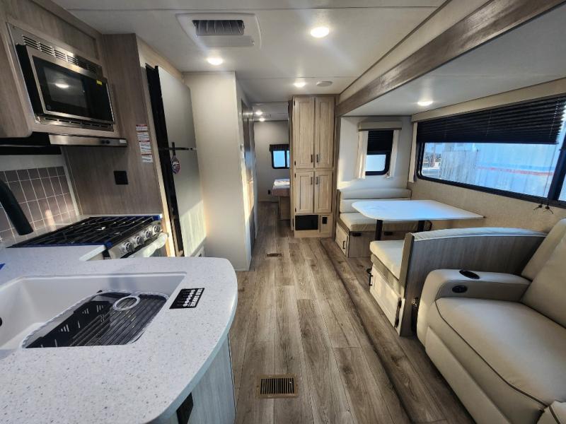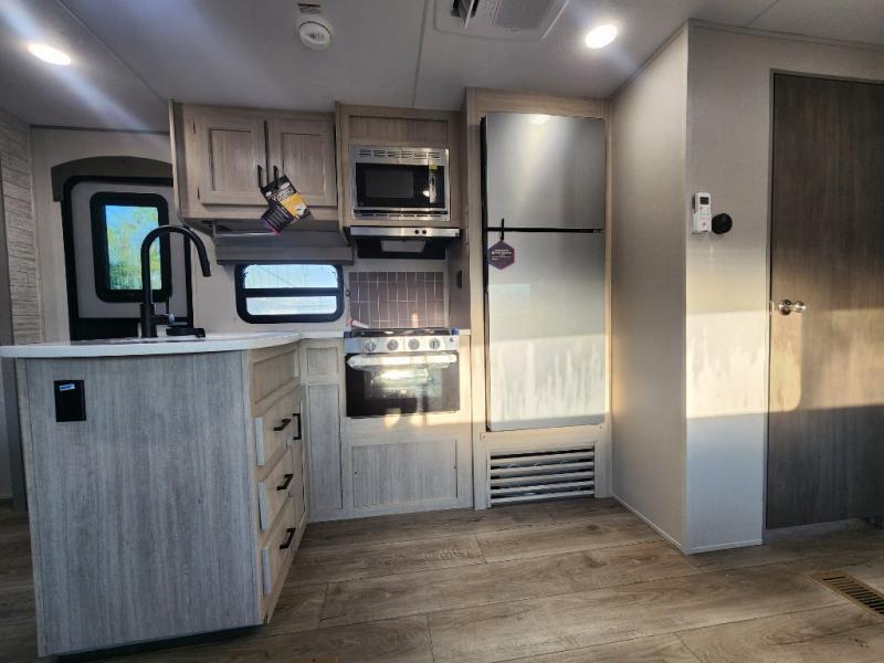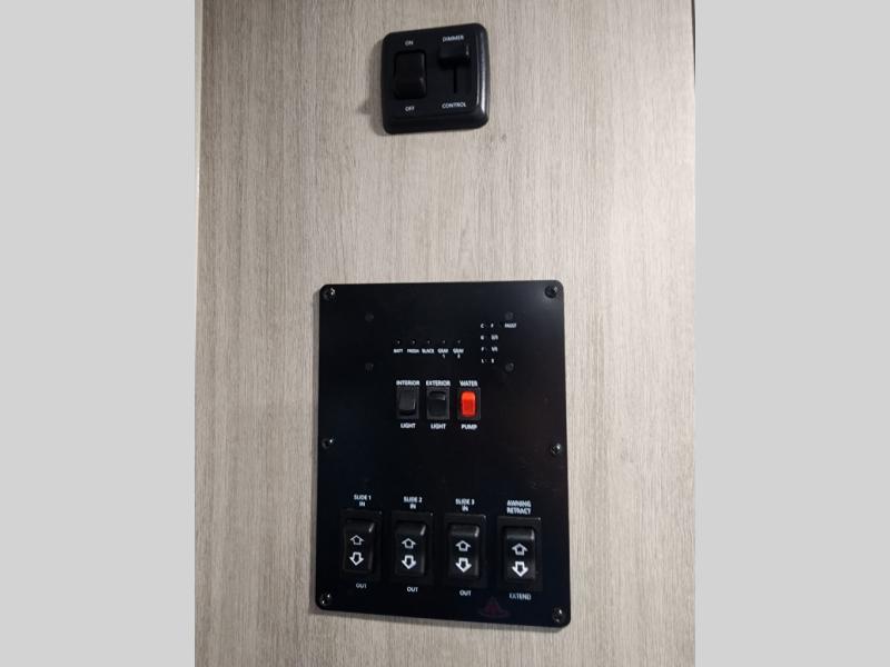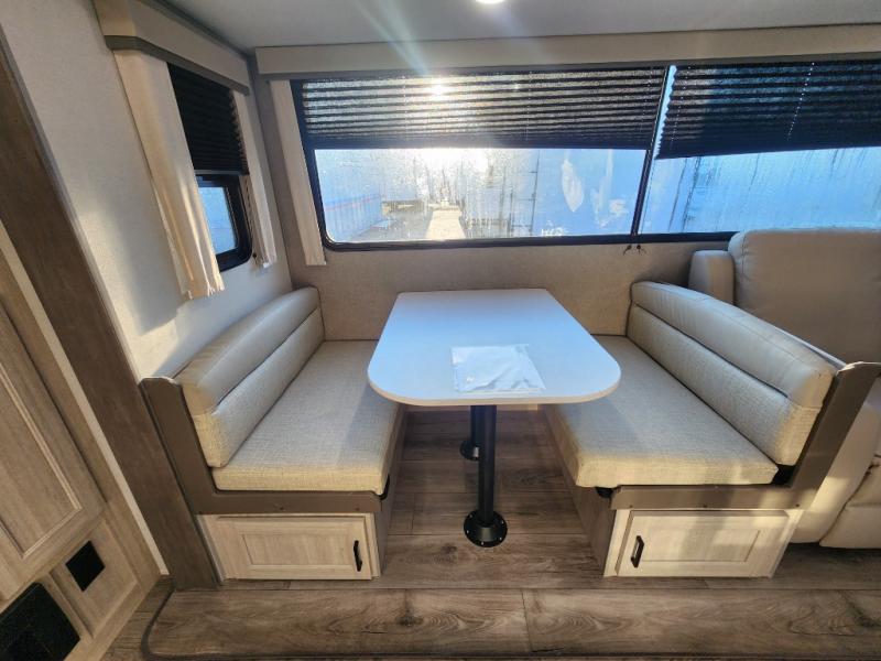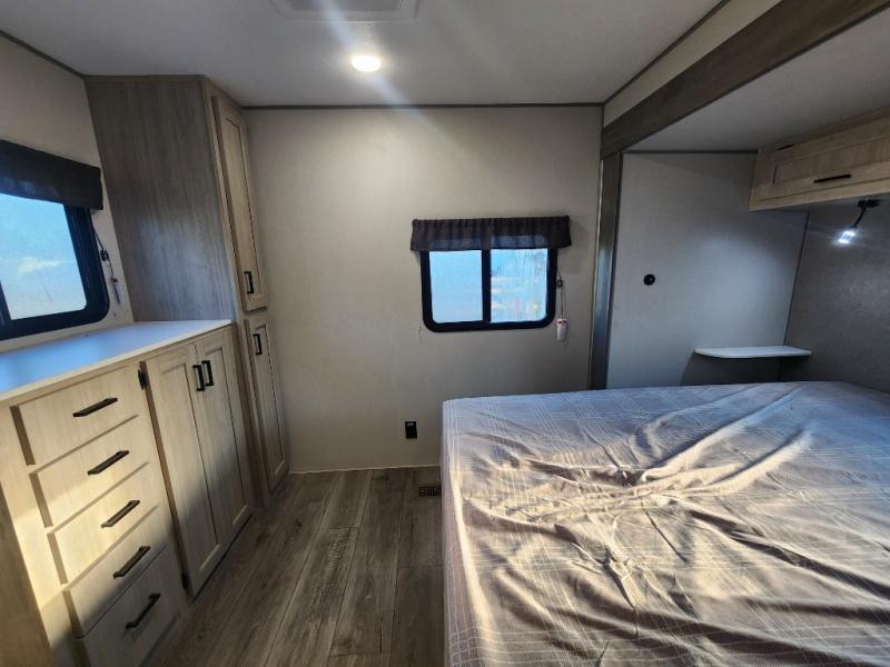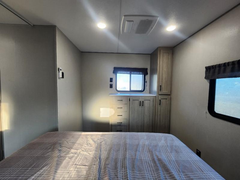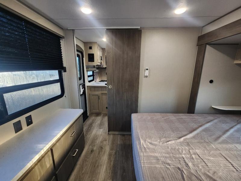 This unique travel trailer offers two bedrooms complete with a slide out queen beds with nightstands, and clothing storage. You can choose from the front bedroom with a large closet and a second closet prepped for a washer and dryer, or the rear bedroom with a wardrobe and TV cabinet. With three total slides throughout there is space for everyone! You and your family will love the combined living and kitchen area with a slide out booth dinette and sofa with drink holders, and maybe you'll decide to add the fireplace option. The L-shaped kitchen counter allows the cook to make meals without moving for anyone trying to get to the full bathroom or either bedroom. And when you want to relax outdoors, the 21' power awning with multicolor LED lights allows you to choose the color you like best.