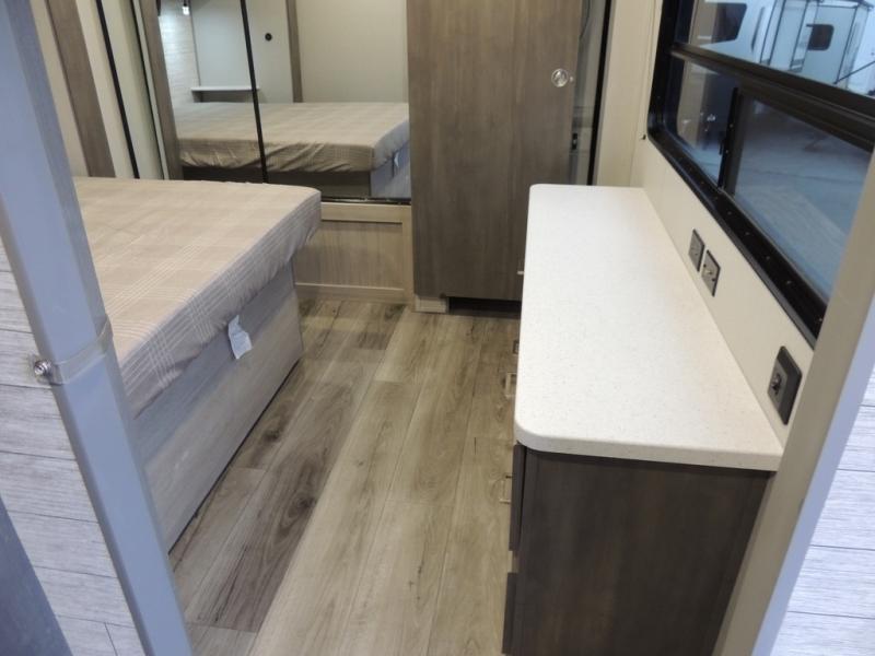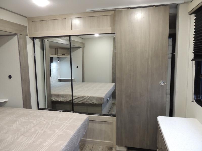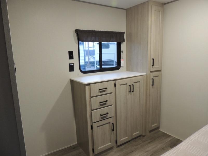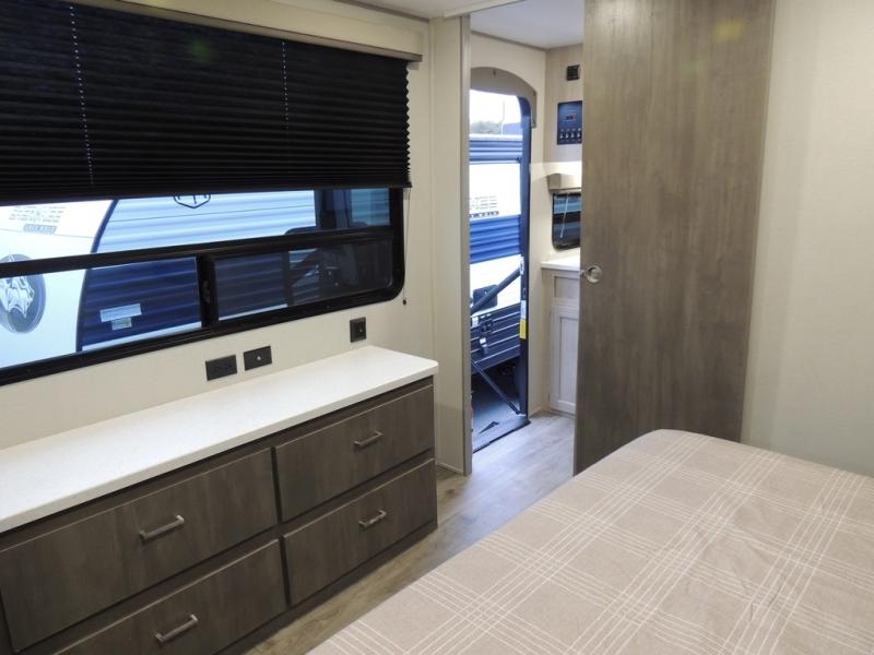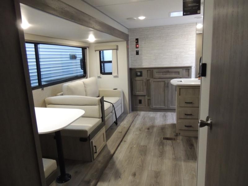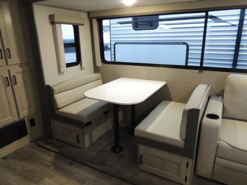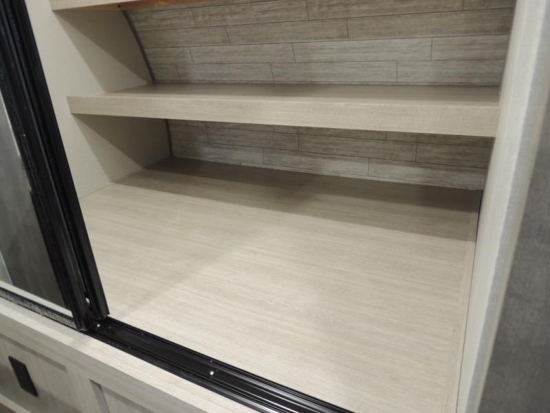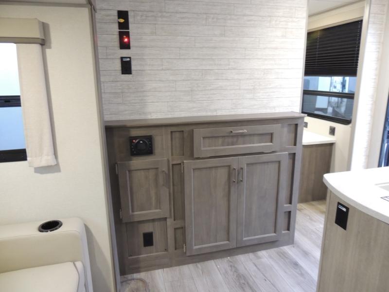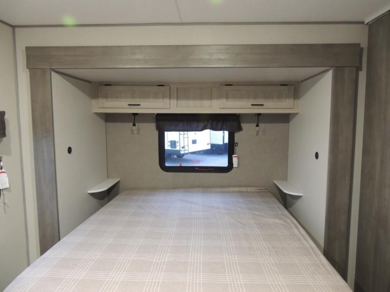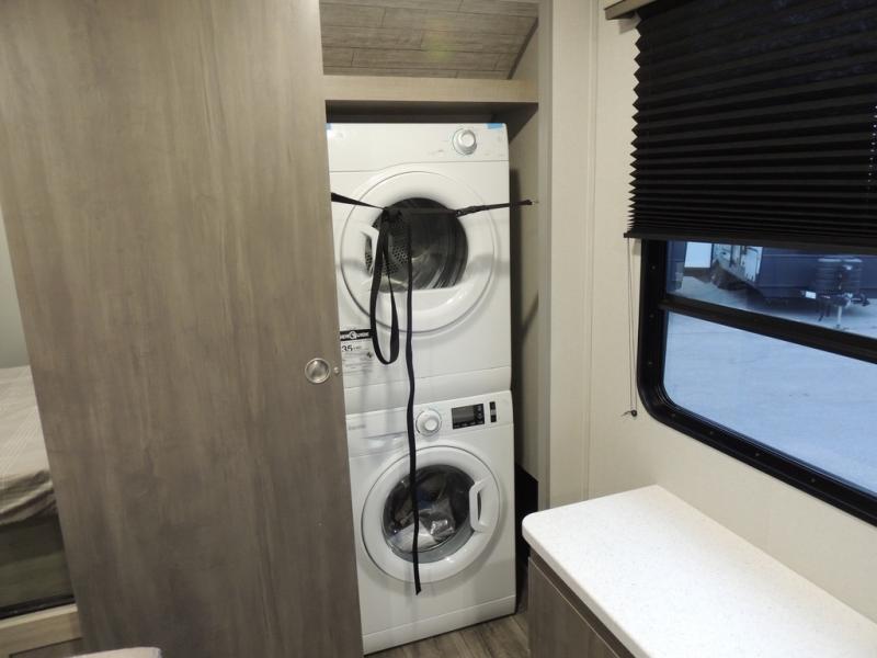 This unique travel trailer offers two bedrooms complete with a slide out RV queen beds with nightstands, and clothing storage. You can choose from the front bedroom with a large closet and a second closet prepped for a washer and dryer, or the rear bedroom with a wardrobe and TV cabinet. With three total slides throughout there is space for everyone! You and your family will love the combined living and kitchen area with a slide out booth dinette and sofa with drink holders, and maybe you'll decide to add the fireplace option. The L-shaped kitchen counter allows the cook to make meals without moving for anyone trying to get to the full bathroom or either bedroom. And when you want to relax outdoors, the 21' power awning with multicolor LED lights allows you to choose the color you like best.