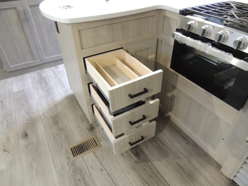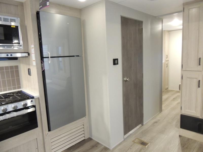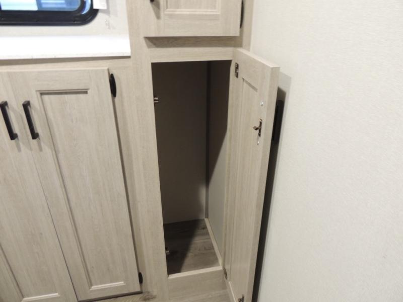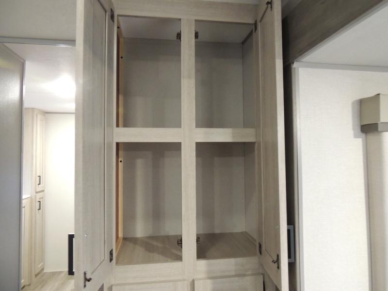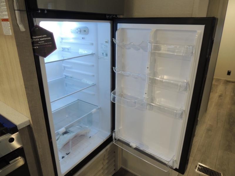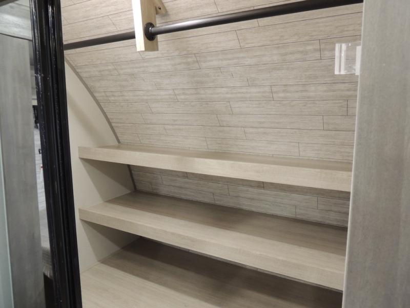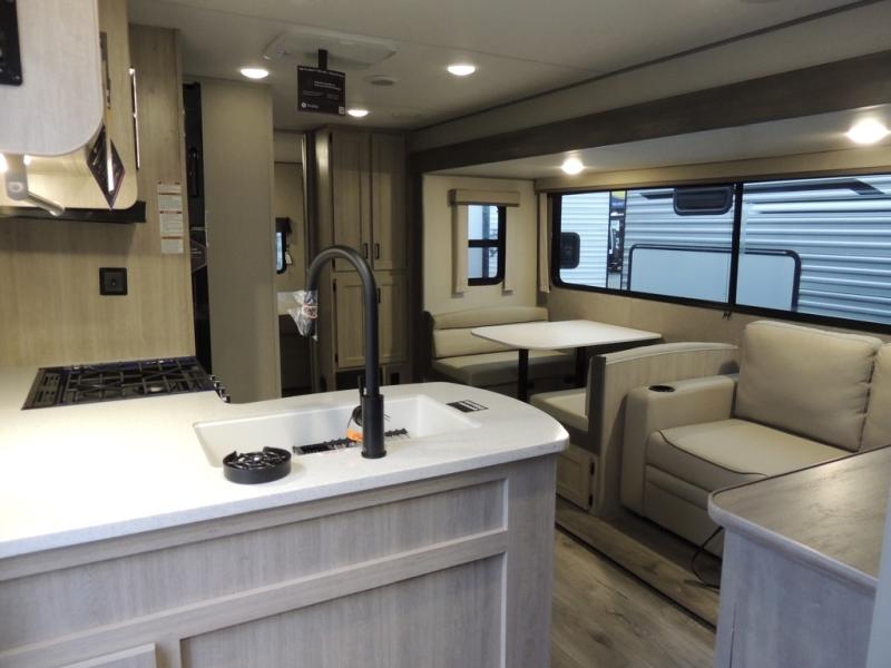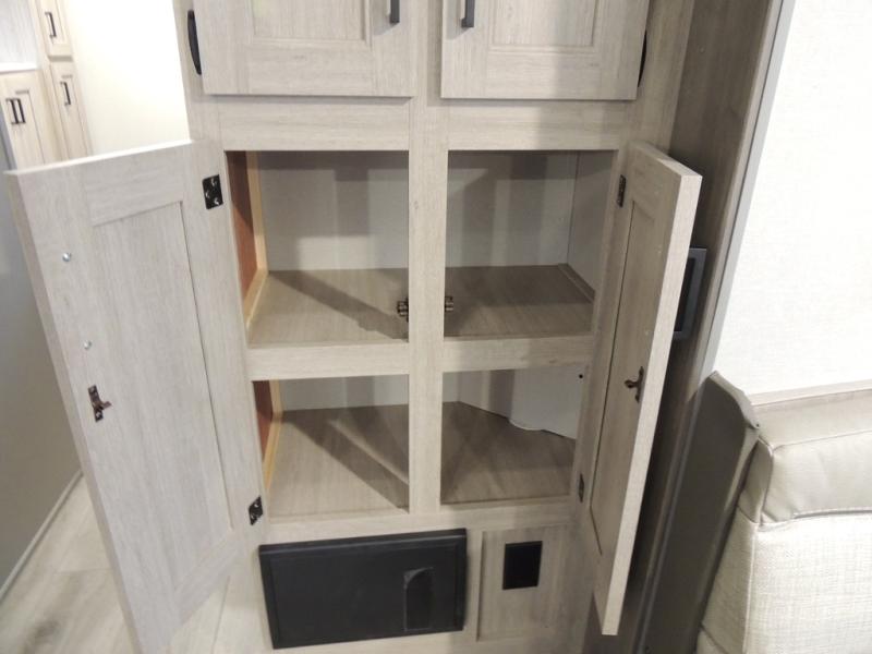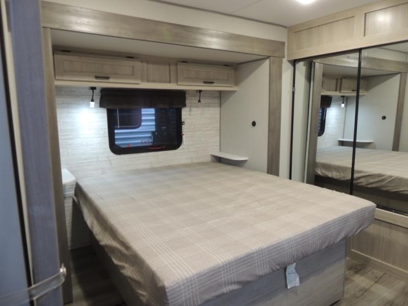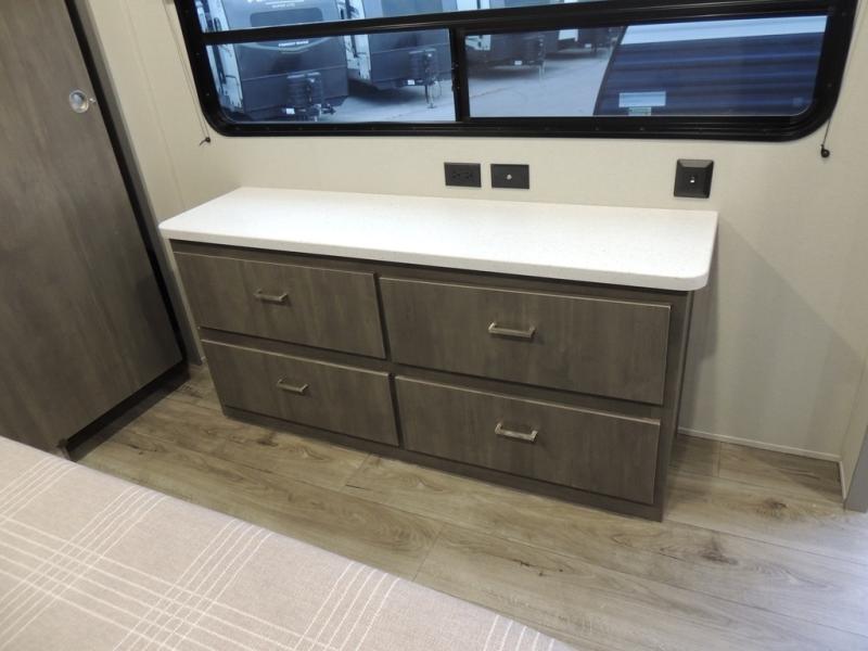 This unique travel trailer offers two bedrooms complete with a slide out RV queen beds with nightstands, and clothing storage. You can choose from the front bedroom with a large closet and a second closet prepped for a washer and dryer, or the rear bedroom with a wardrobe and TV cabinet. With three total slides throughout there is space for everyone! You and your family will love the combined living and kitchen area with a slide out booth dinette and sofa with drink holders, and maybe you'll decide to add the fireplace option. The L-shaped kitchen counter allows the cook to make meals without moving for anyone trying to get to the full bathroom or either bedroom. And when you want to relax outdoors, the 21' power awning with multicolor LED lights allows you to choose the color you like best.