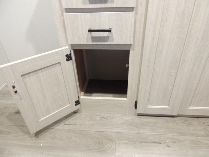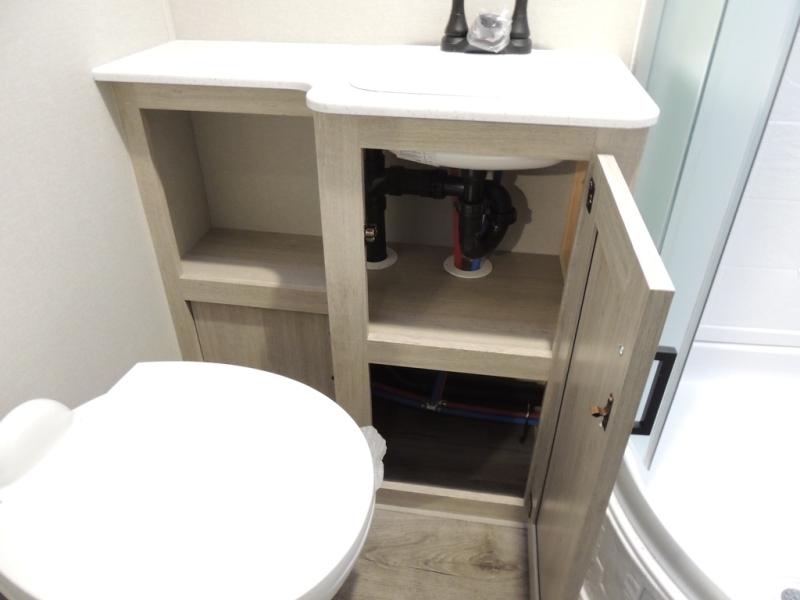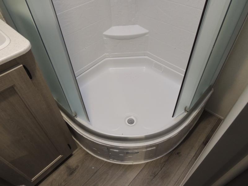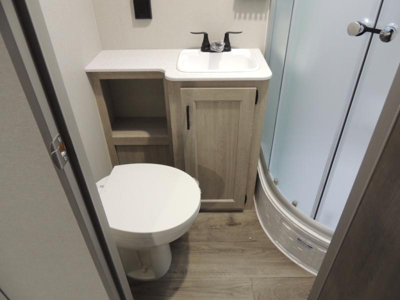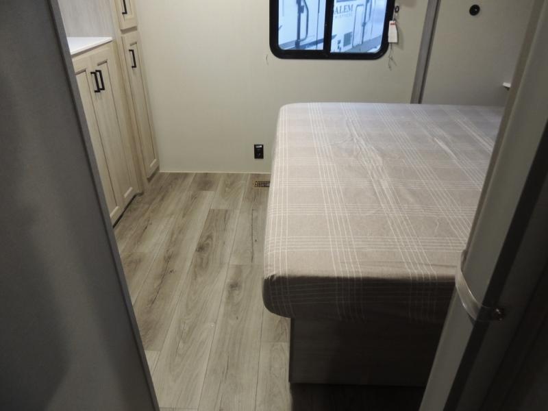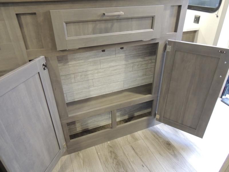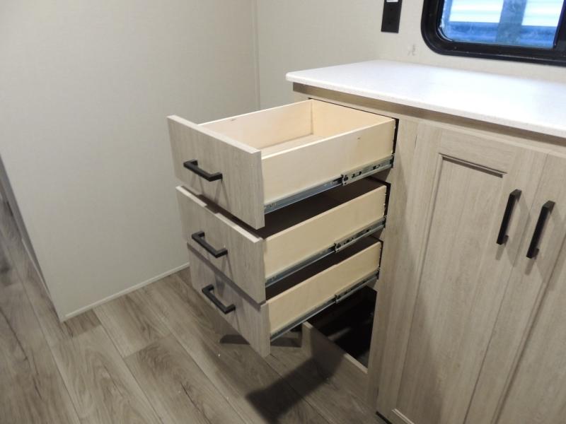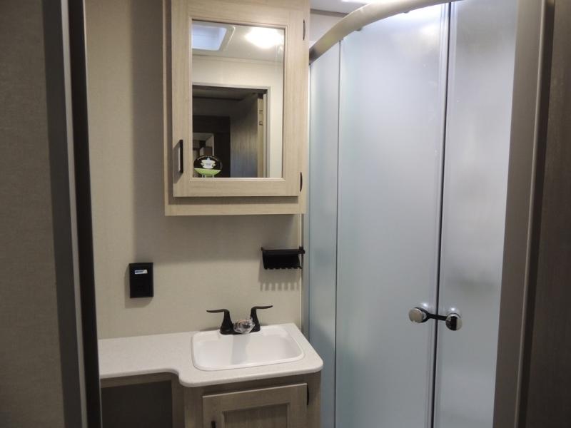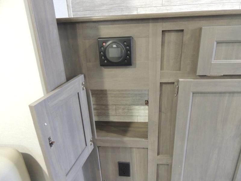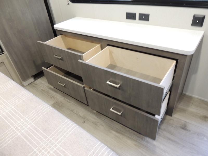 This unique travel trailer offers two bedrooms complete with a slide out RV queen beds with nightstands, and clothing storage. You can choose from the front bedroom with a large closet and a second closet prepped for a washer and dryer, or the rear bedroom with a wardrobe and TV cabinet. With three total slides throughout there is space for everyone! You and your family will love the combined living and kitchen area with a slide out booth dinette and sofa with drink holders, and maybe you'll decide to add the fireplace option. The L-shaped kitchen counter allows the cook to make meals without moving for anyone trying to get to the full bathroom or either bedroom. And when you want to relax outdoors, the 21' power awning with multicolor LED lights allows you to choose the color you like best.