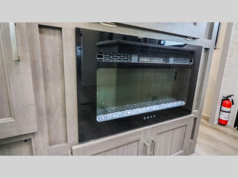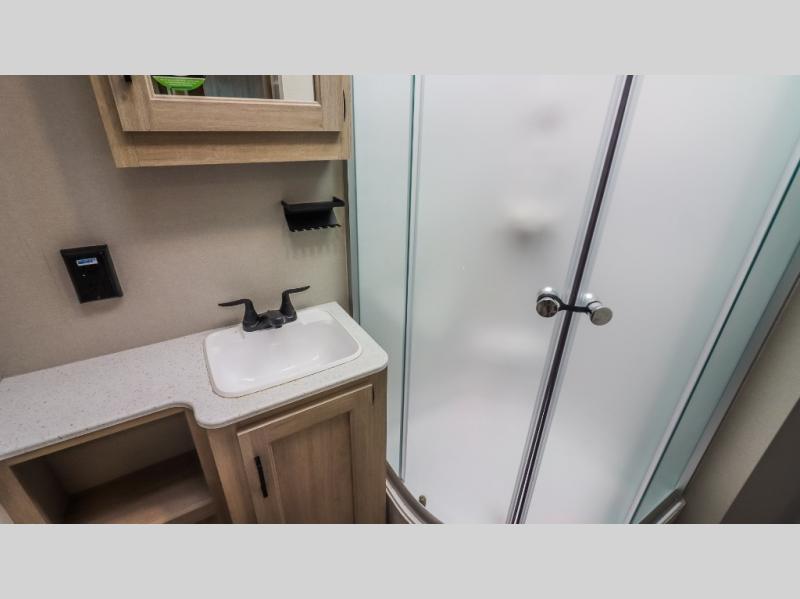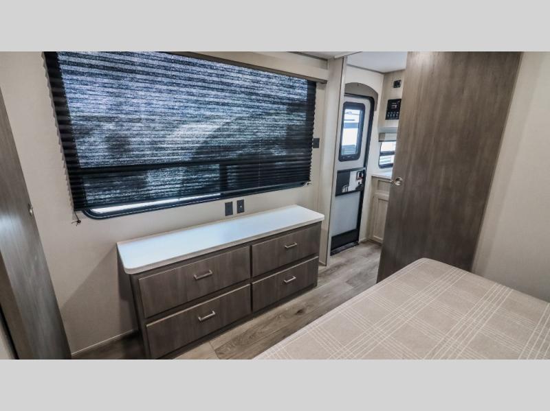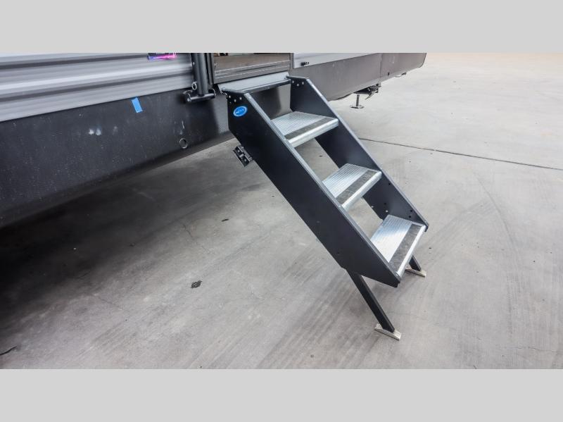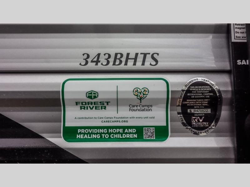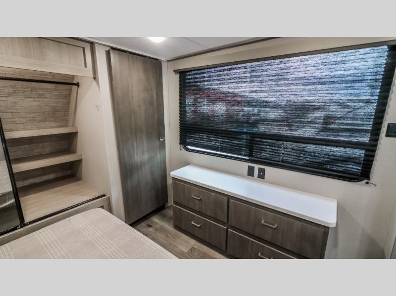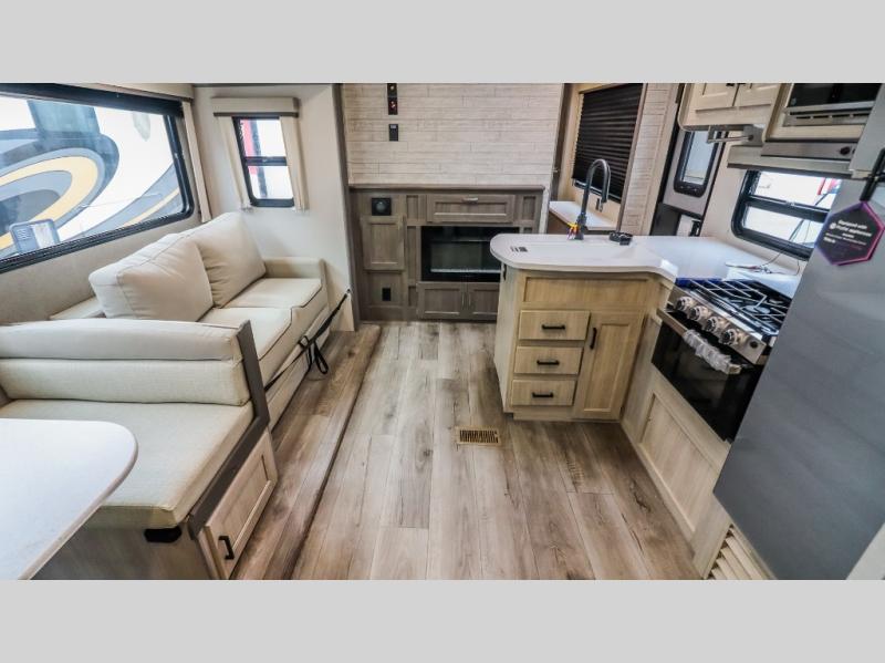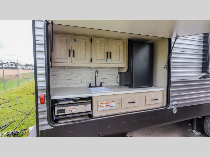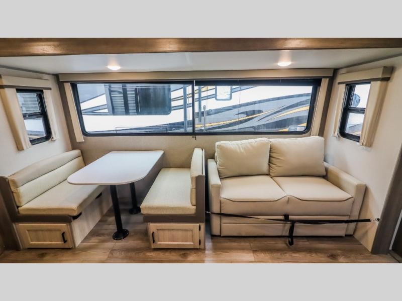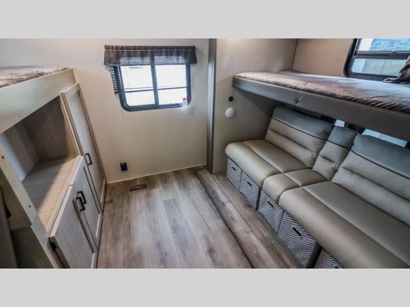 This family-friendly trailer offers lots of floor space thanks to the triple slides throughout! You and your family will love the combined living and kitchen area with a slide out booth dinette and a sofa with drink holders. The L-shaped kitchen counter allows the cook to make meals without moving for anyone trying to get to the full bathroom or the rear bunkhouse. The kids will have their own privacy, two bunk beds, a jack knife sofa with storage totes below plus a TV/wardrobe cabinet. The front private bedroom allows you to sleep like royalty and offers a large closet for your clothing and another closet prepped for a washer/dryer. And don't forget about the full-size camper kitchen and the 21' power awning with multicolor LED lights when you are outside.