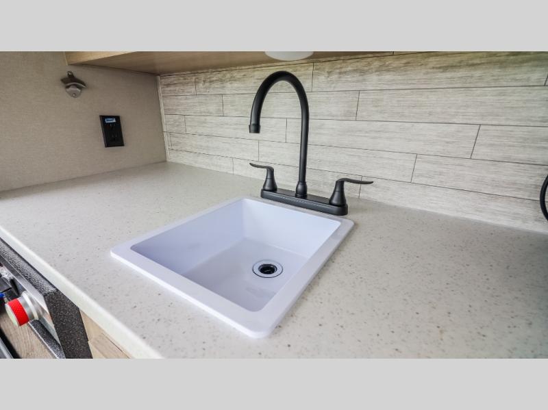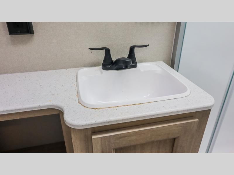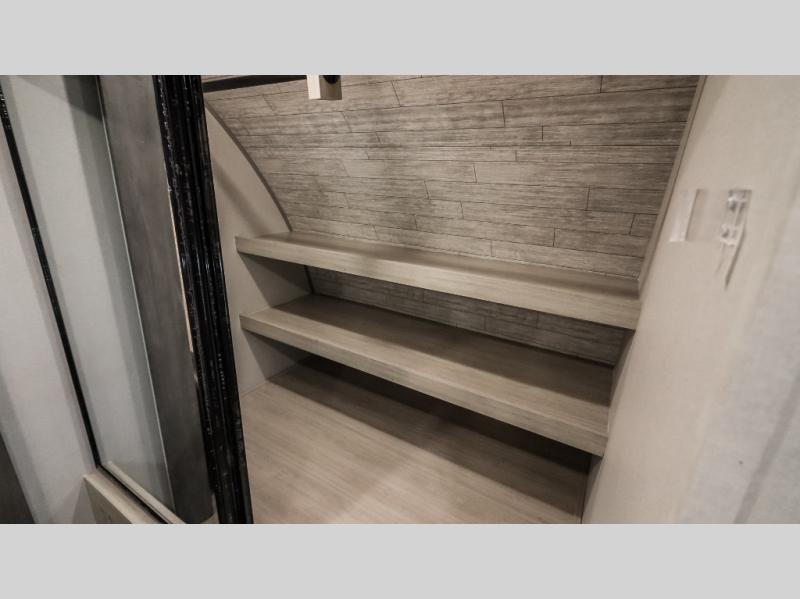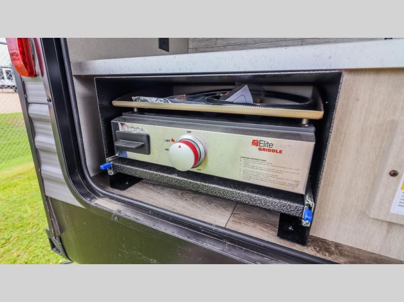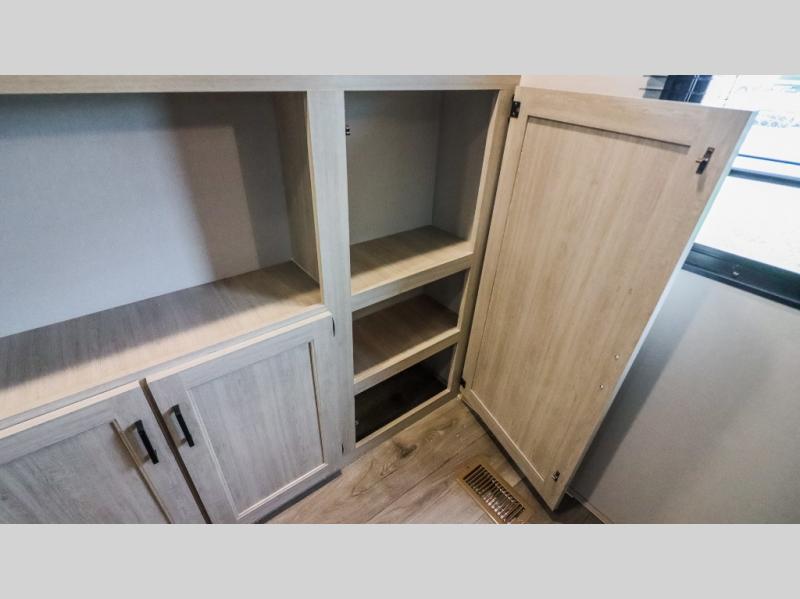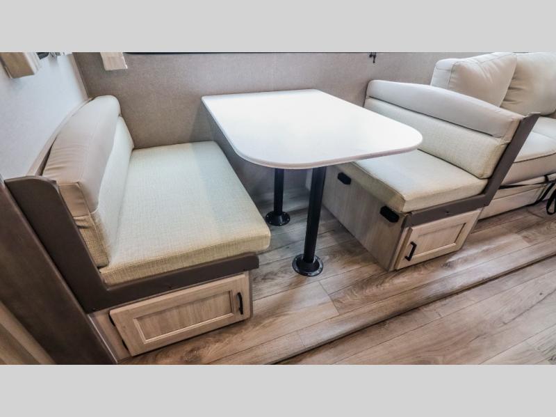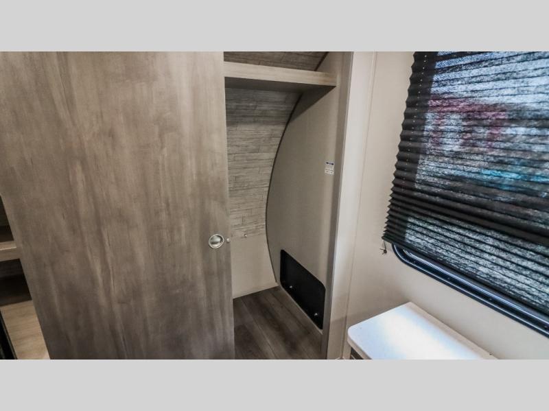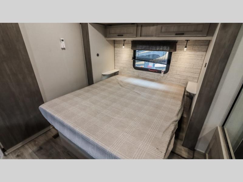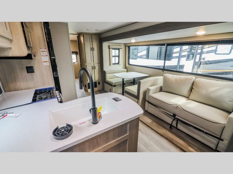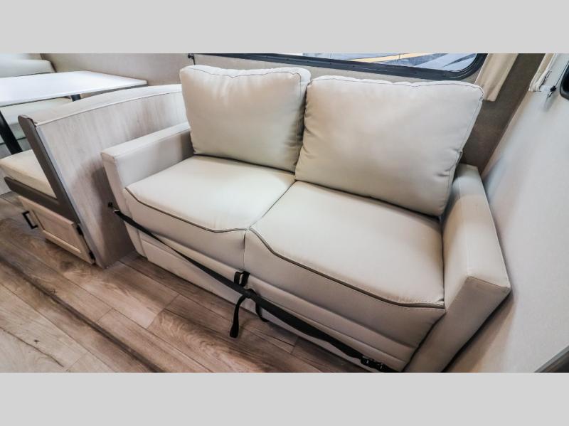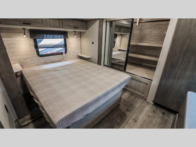 This family-friendly trailer offers lots of floor space thanks to the triple slides throughout! You and your family will love the combined living and kitchen area with a slide out booth dinette and a sofa with drink holders. The L-shaped kitchen counter allows the cook to make meals without moving for anyone trying to get to the full bathroom or the rear bunkhouse. The kids will have their own privacy, two bunk beds, a jack knife sofa with storage totes below plus a TV/wardrobe cabinet. The front private bedroom allows you to sleep like royalty and offers a large closet for your clothing and another closet prepped for a washer/dryer. And don't forget about the full-size camper kitchen and the 21' power awning with multicolor LED lights when you are outside.