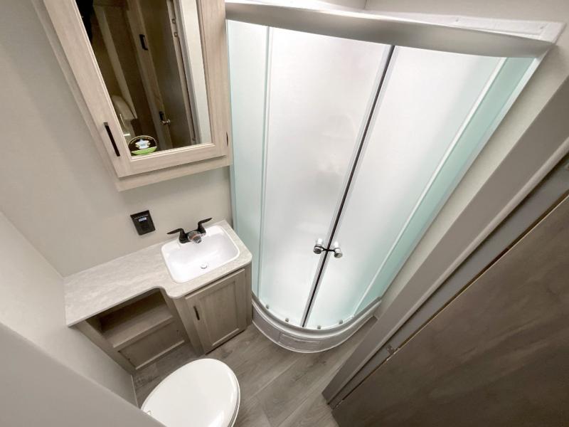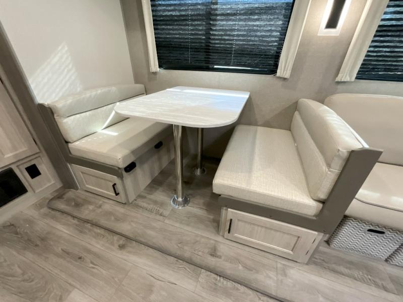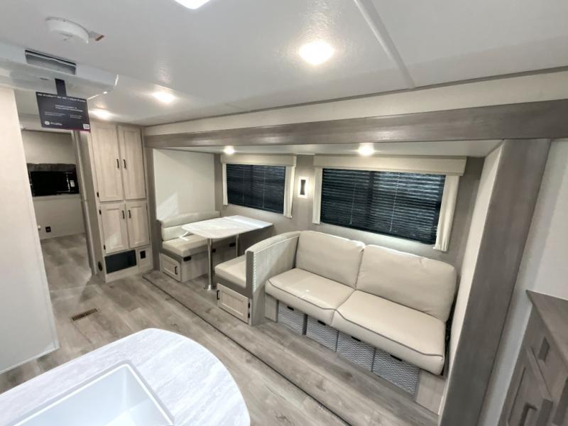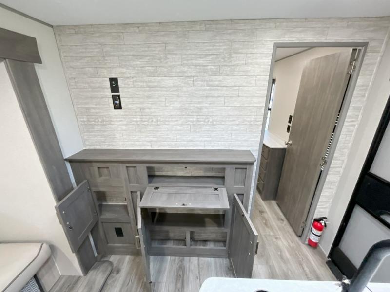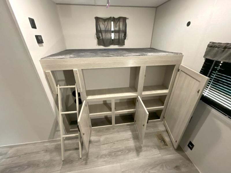 This family-friendly trailer offers lots of floor space thanks to the triple slides throughout! You and your family will love the combined living and kitchen area with a slide out booth dinette and a sofa with drink holders. The L-shaped kitchen counter allows the cook to make meals without moving for anyone trying to get to the full bathroom or the rear bunkhouse. The kids will have their own privacy, two bunk beds, a jack knife sofa with storage totes below plus a TV/wardrobe cabinet. The front private bedroom allows you to sleep like royalty and offers a large closet for your clothing and another closet prepped for a washer/dryer. And don't forget about the full-size camper kitchen and the 21' power awning with multicolor LED lights when you are outside.