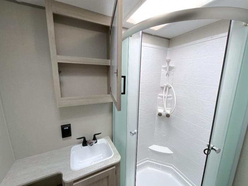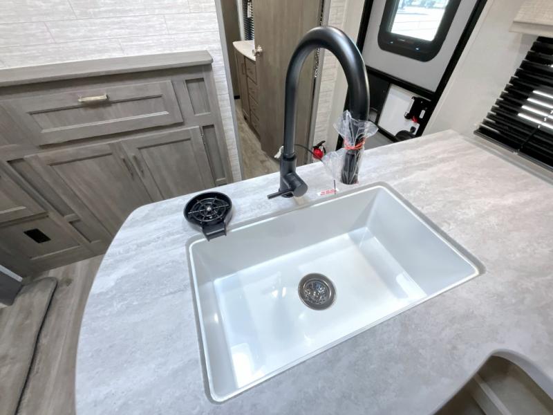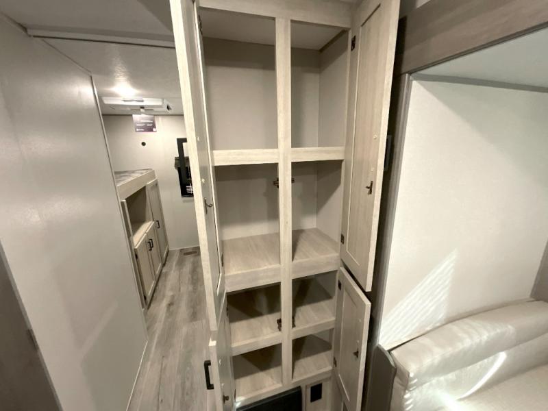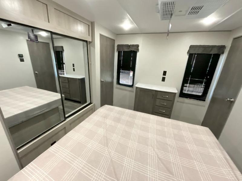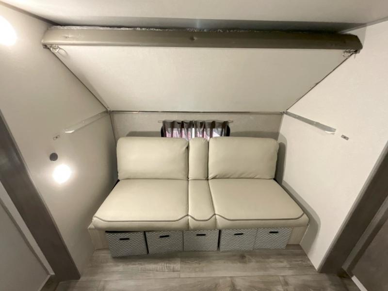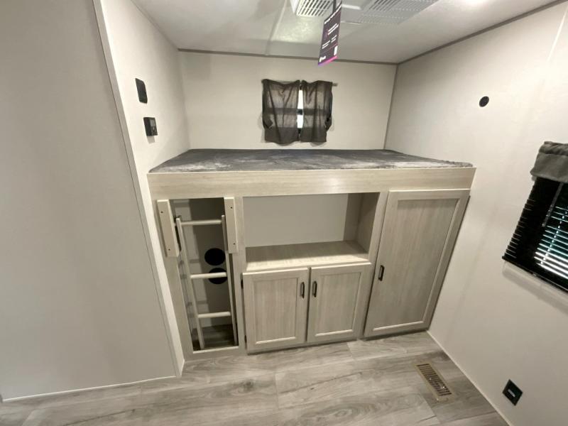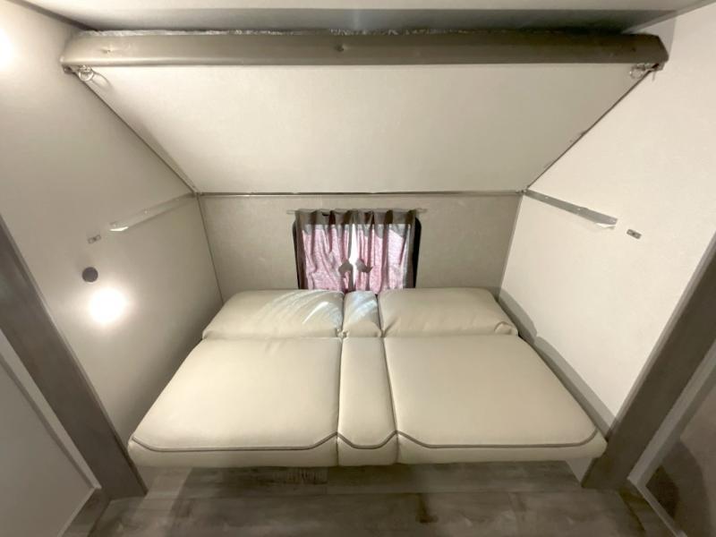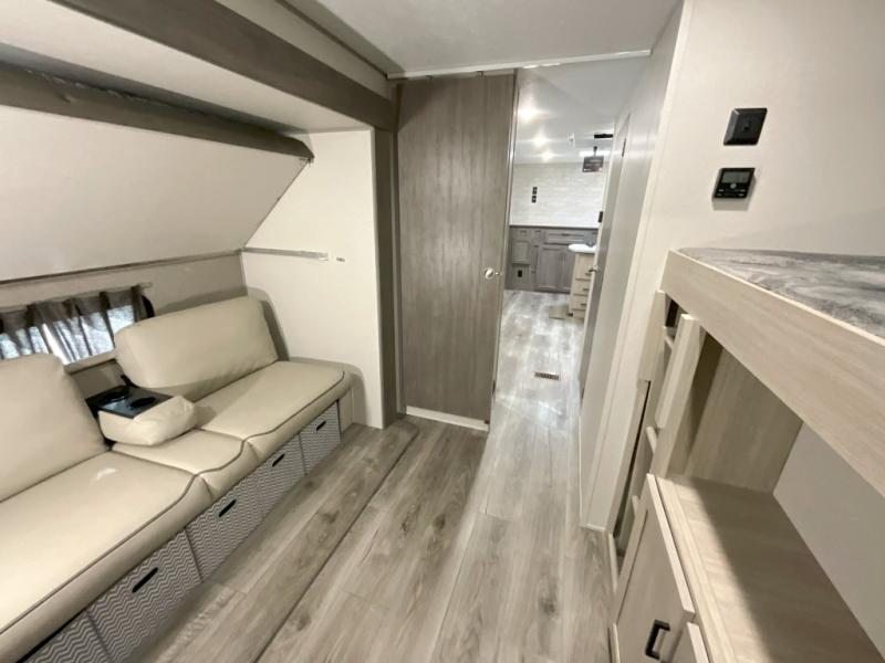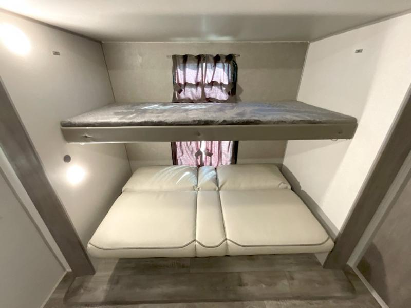 This family-friendly trailer offers lots of floor space thanks to the triple slides throughout! You and your family will love the combined living and kitchen area with a slide out booth dinette and a sofa with drink holders. The L-shaped kitchen counter allows the cook to make meals without moving for anyone trying to get to the full bathroom or the rear bunkhouse. The kids will have their own privacy, two bunk beds, a jack knife sofa with storage totes below plus a TV/wardrobe cabinet. The front private bedroom allows you to sleep like royalty, and offers a large closet for your clothing and another closet prepped for a washer/dryer. And don't forget about the full size camper kitchen and the 21' power awning with multicolor LED lights when you are outside.