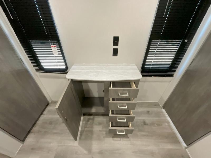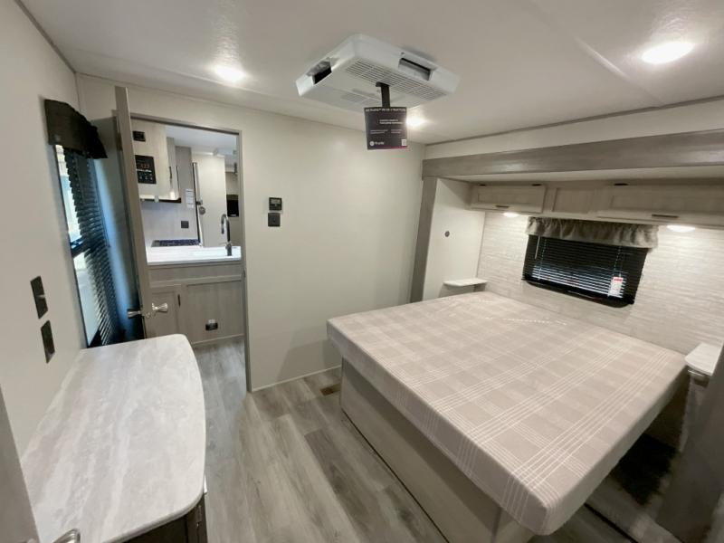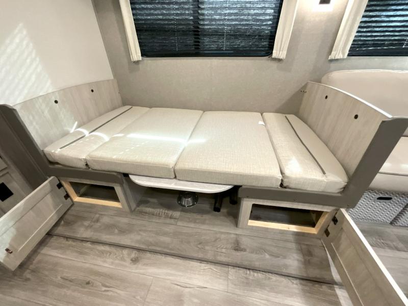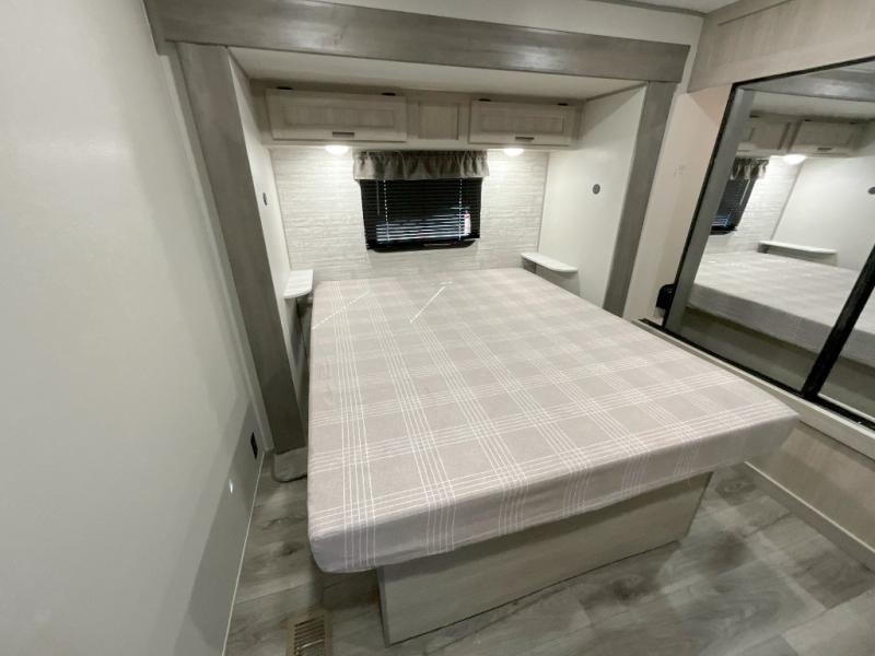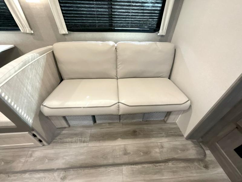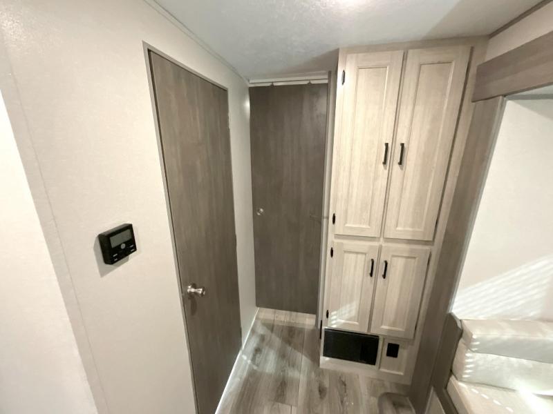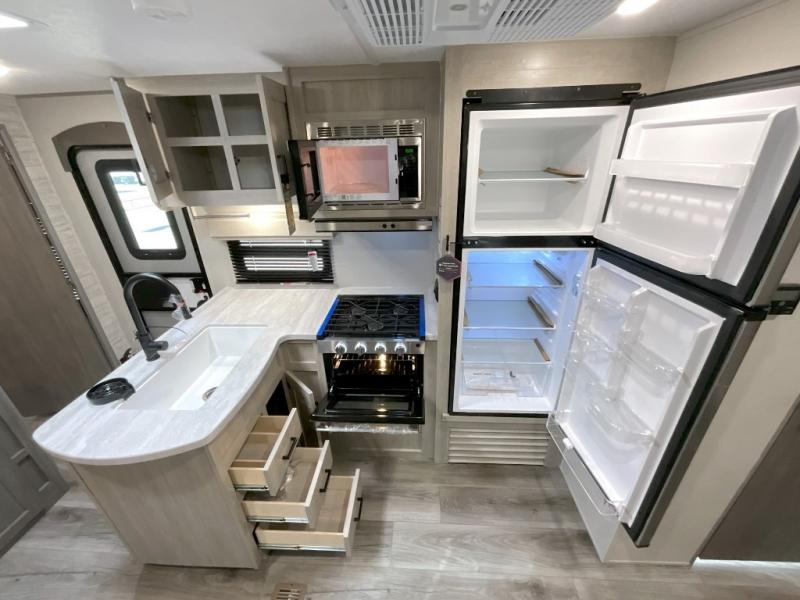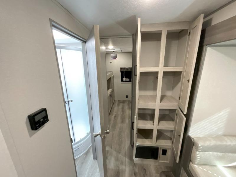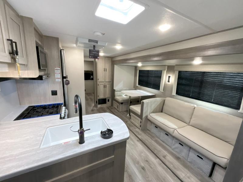 This family-friendly trailer offers lots of floor space thanks to the triple slides throughout! You and your family will love the combined living and kitchen area with a slide out booth dinette and a sofa with drink holders. The L-shaped kitchen counter allows the cook to make meals without moving for anyone trying to get to the full bathroom or the rear bunkhouse. The kids will have their own privacy, two bunk beds, a jack knife sofa with storage totes below plus a TV/wardrobe cabinet. The front private bedroom allows you to sleep like royalty, and offers a large closet for your clothing and another closet prepped for a washer/dryer. And don't forget about the full size camper kitchen and the 21' power awning with multicolor LED lights when you are outside.