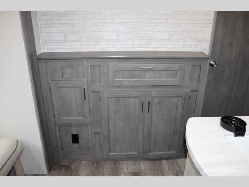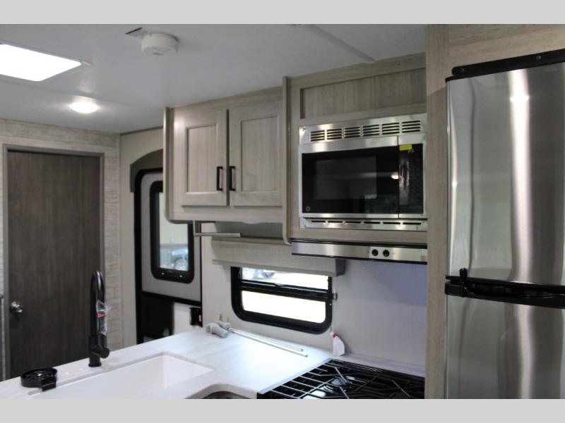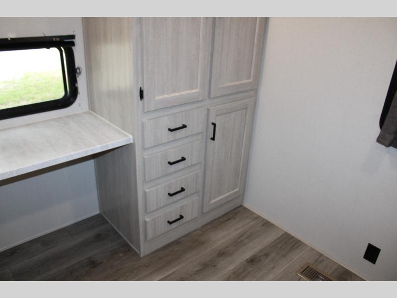 This family-friendly trailer offers lots of floor space thanks to the triple slides throughout! You and your family will love the combined living and kitchen area with a slide out booth dinette and a sofa with drink holders. The L-shaped kitchen counter allows the cook to make meals without moving for anyone trying to get to the full bathroom or the rear bunkhouse. The kids will have their own privacy, two bunk beds, a jack knife sofa with storage totes below plus a TV/wardrobe cabinet. The front private bedroom allows you to sleep like royalty and offers a large closet for your clothing and another closet prepped for a washer/dryer. And don't forget about the full-size camper kitchen and the 21' power awning with multicolor LED lights when you are outside.