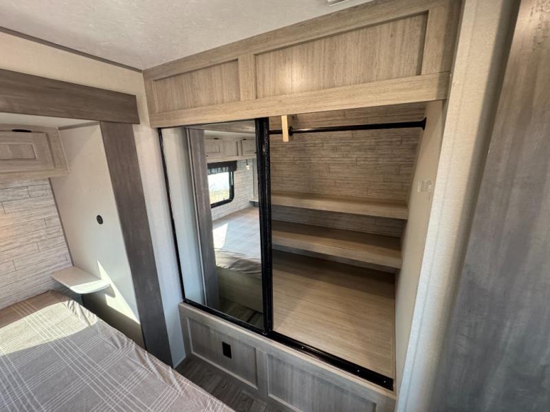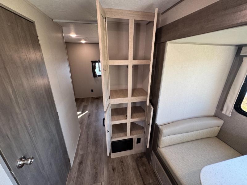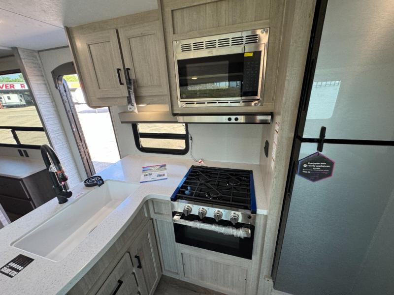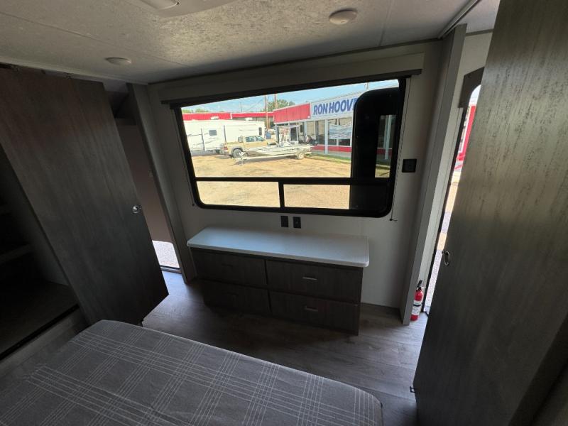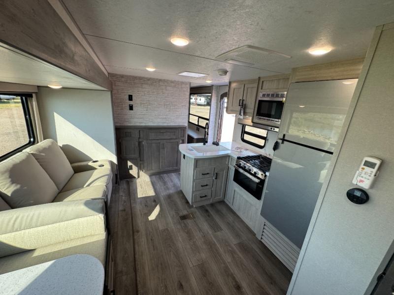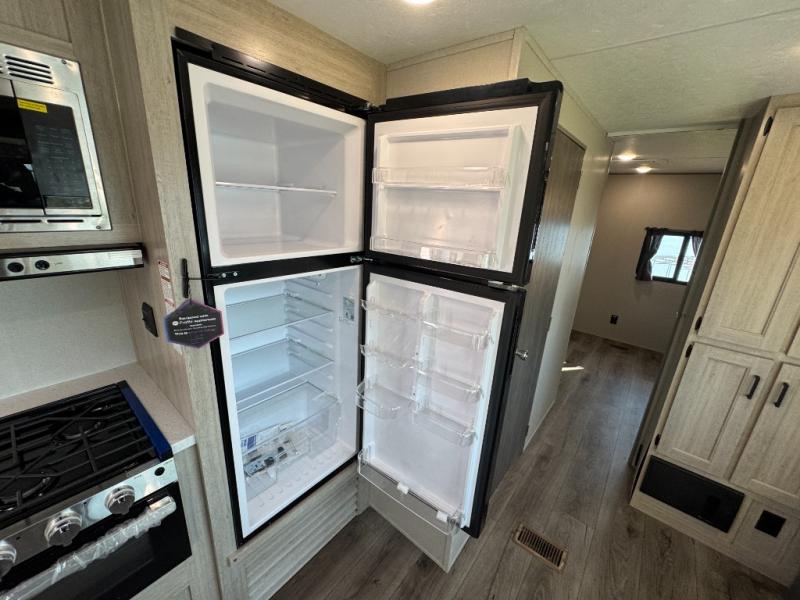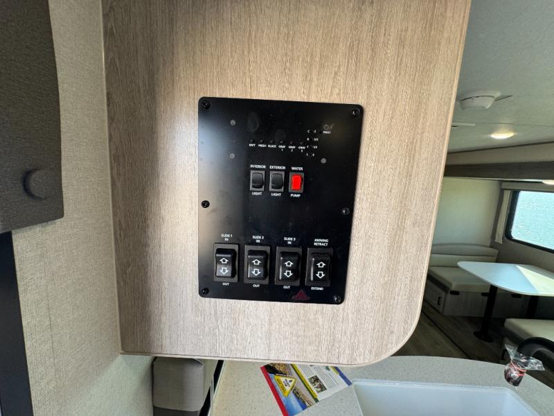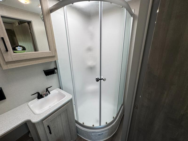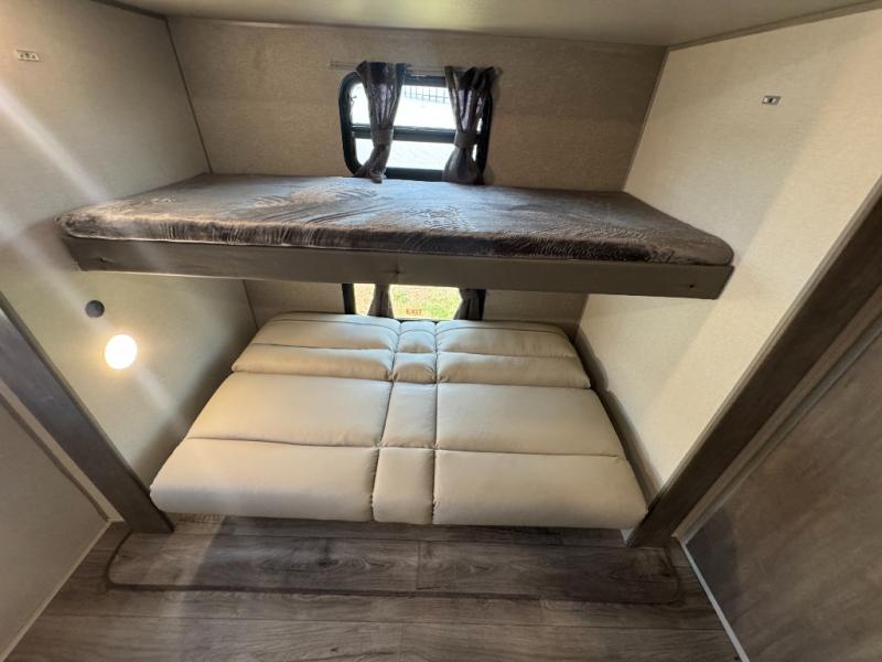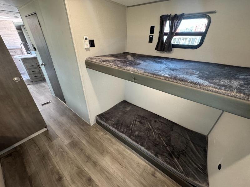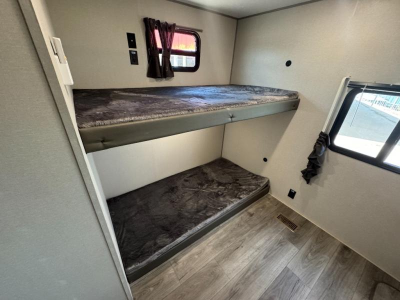 This family-friendly trailer offers lots of floor space thanks to the triple slides throughout! You and your family will love the combined living and kitchen area with a slide out booth dinette and a sofa with drink holders. The L-shaped kitchen counter allows the cook to make meals without moving for anyone trying to get to the full bathroom or the rear bunkhouse. The kids will have their own privacy, two bunk beds, a jack knife sofa with storage totes below plus a TV/wardrobe cabinet. The front private bedroom allows you to sleep like royalty and offers a large closet for your clothing and another closet prepped for a washer/dryer. And don't forget about the full-size camper kitchen and the 21' power awning with multicolor LED lights when you are outside.