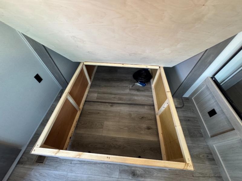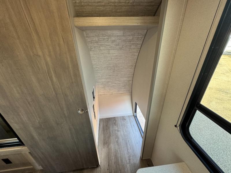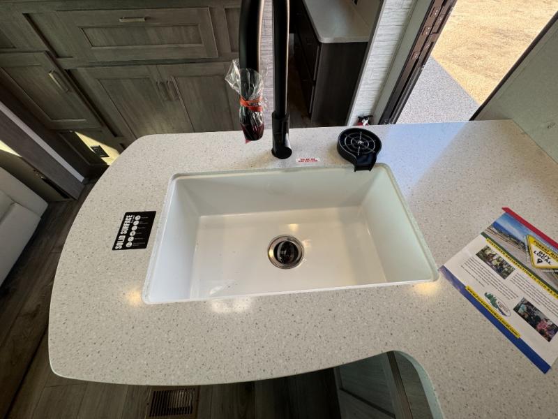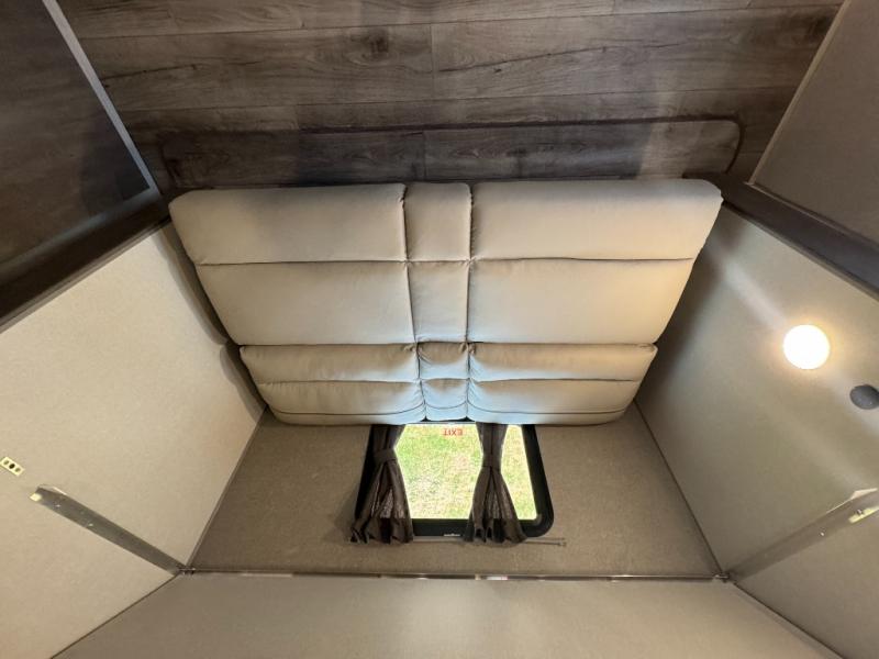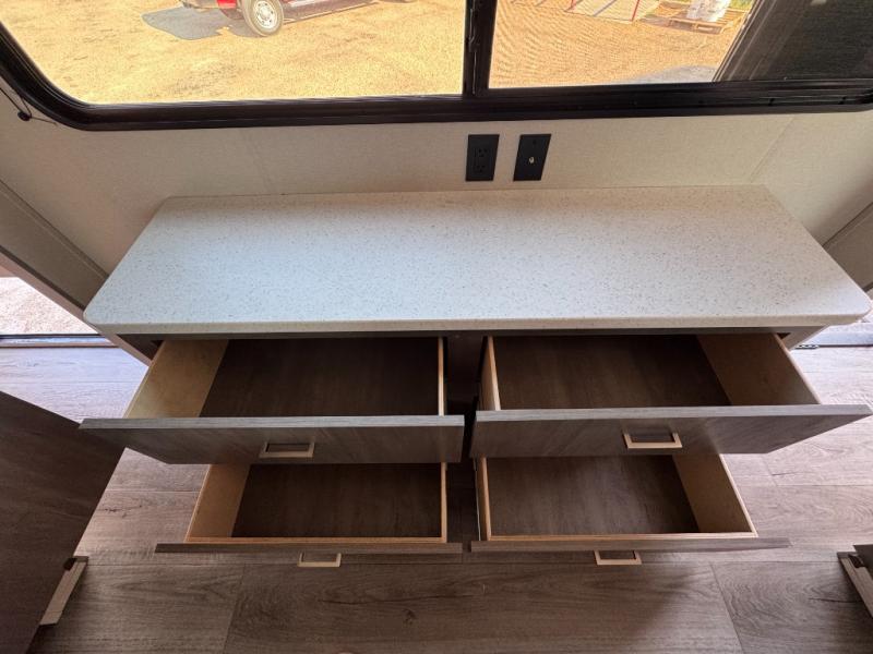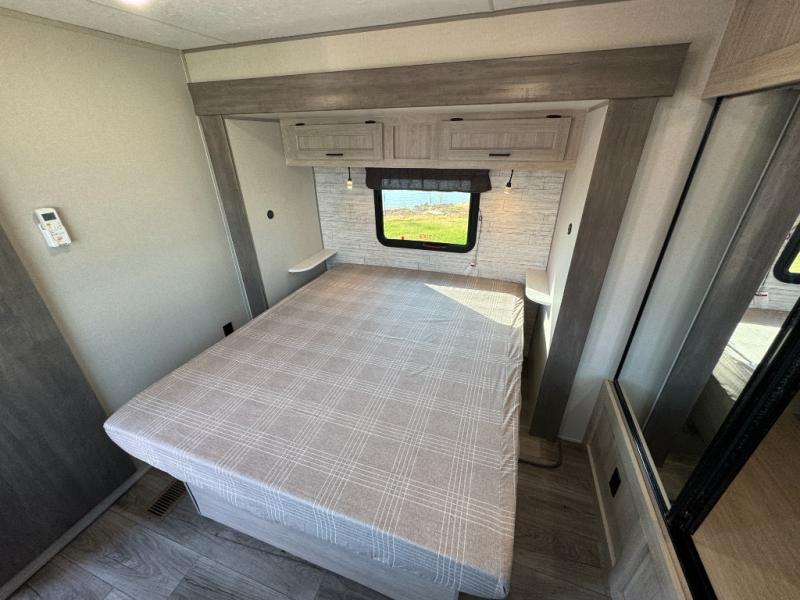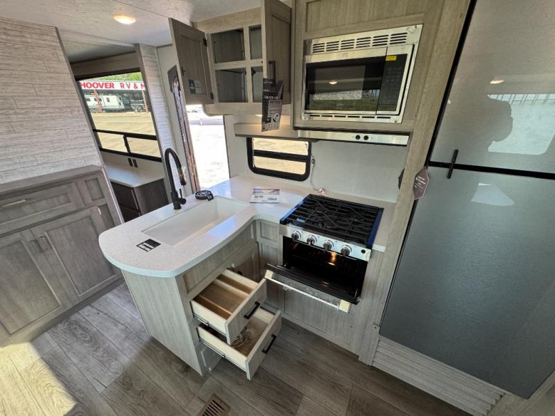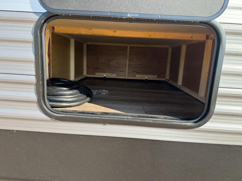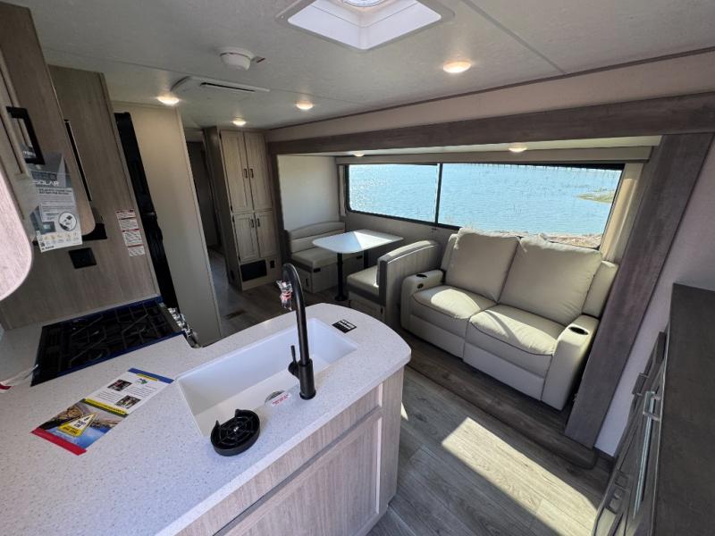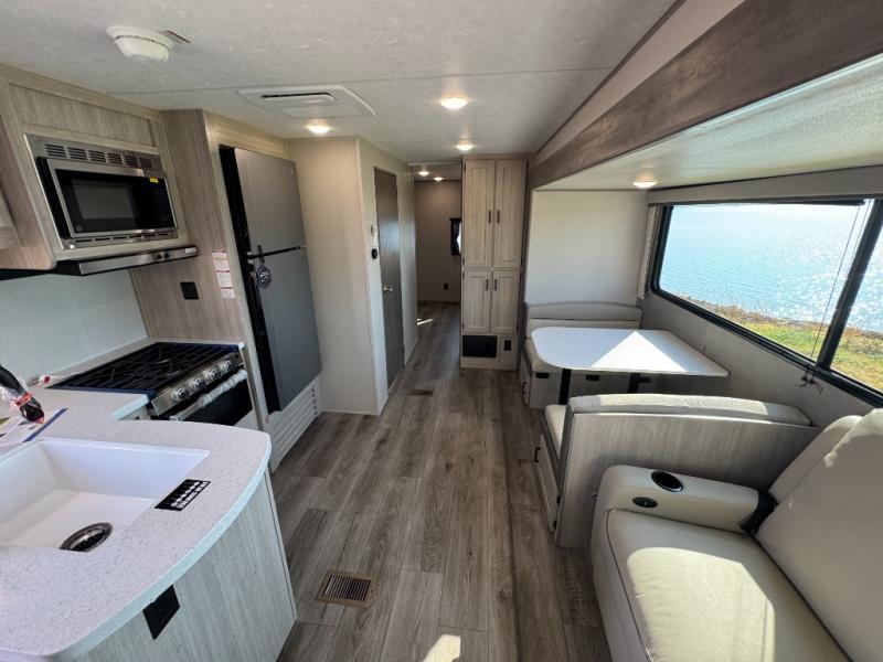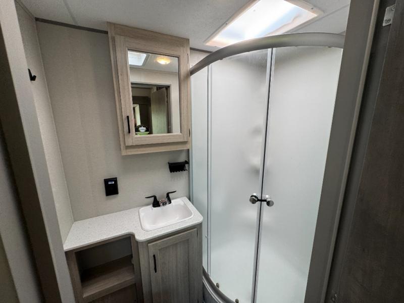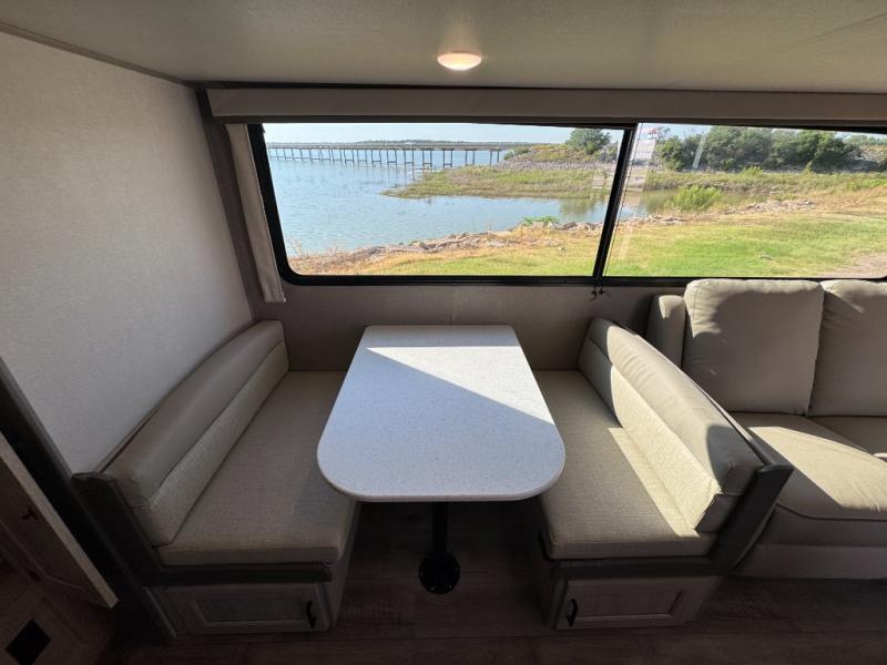 This family-friendly trailer offers lots of floor space thanks to the triple slides throughout! You and your family will love the combined living and kitchen area with a slide out booth dinette and a sofa with drink holders. The L-shaped kitchen counter allows the cook to make meals without moving for anyone trying to get to the full bathroom or the rear bunkhouse. The kids will have their own privacy, two bunk beds, a jack knife sofa with storage totes below plus a TV/wardrobe cabinet. The front private bedroom allows you to sleep like royalty and offers a large closet for your clothing and another closet prepped for a washer/dryer. And don't forget about the full-size camper kitchen and the 21' power awning with multicolor LED lights when you are outside.