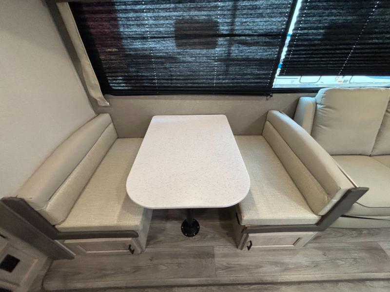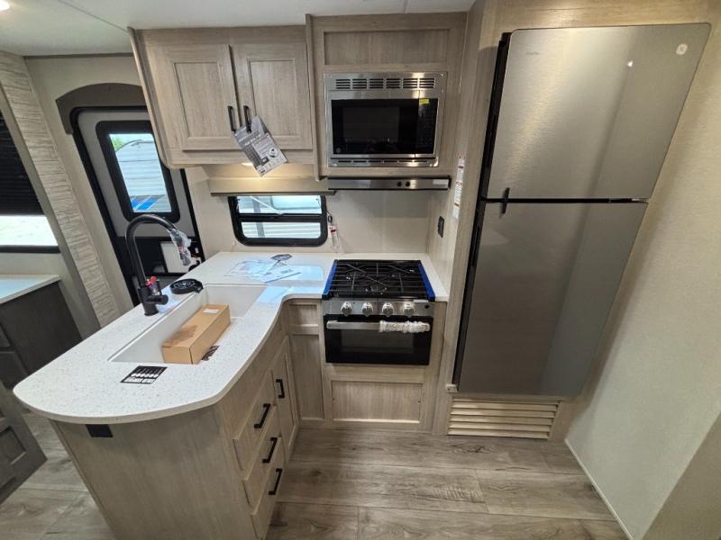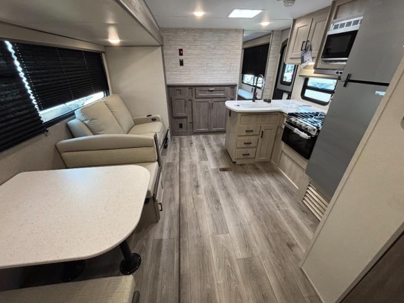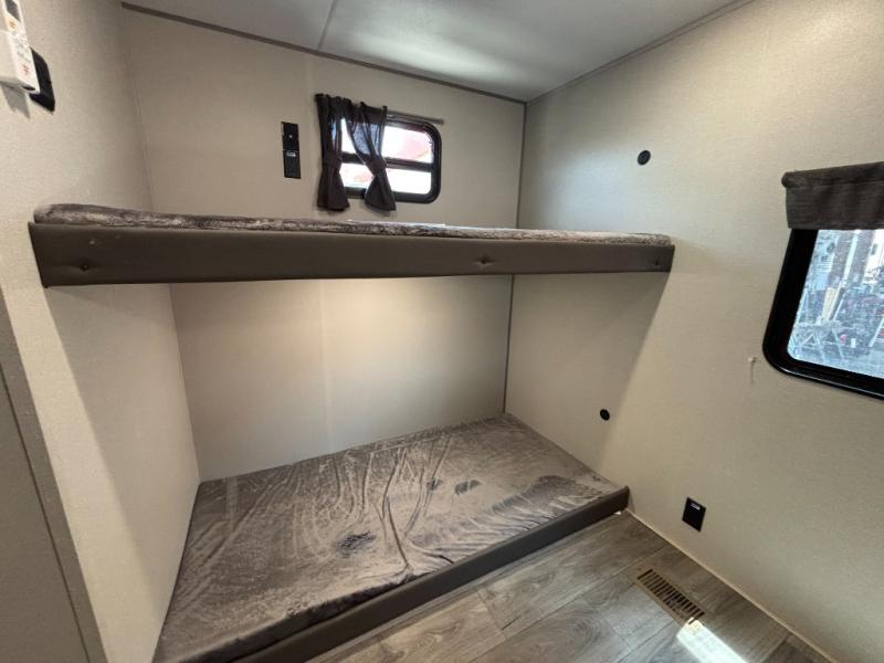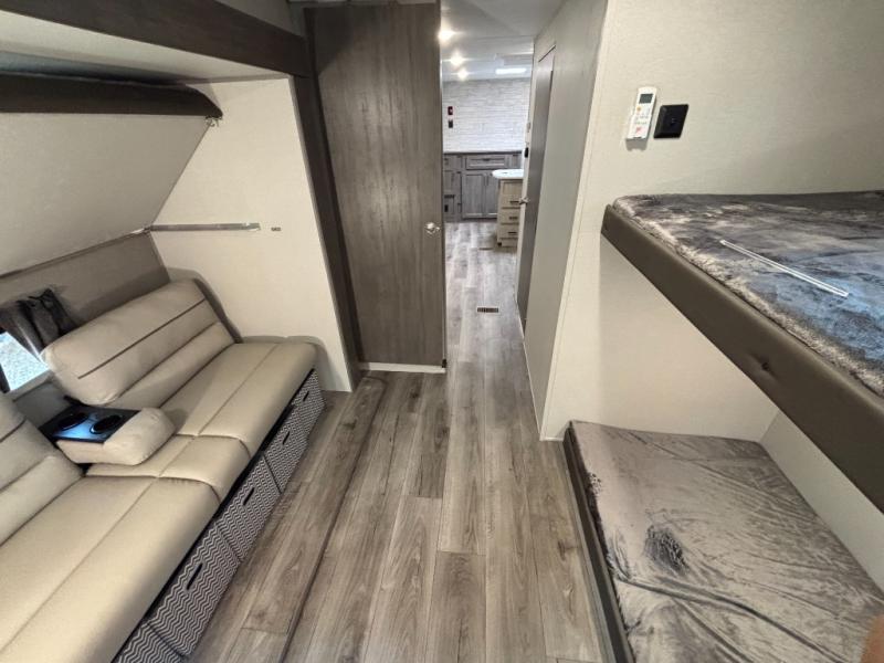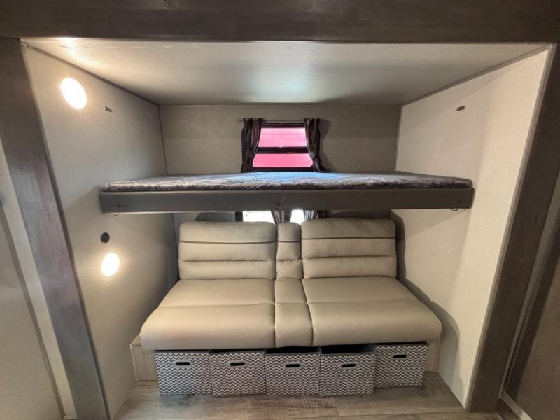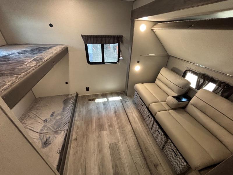 This family-friendly trailer offers lots of floor space thanks to the triple slides throughout! You and your family will love the combined living and kitchen area with a slide out booth dinette and a sofa with drink holders. The L-shaped kitchen counter allows the cook to make meals without moving for anyone trying to get to the full bathroom or the rear bunkhouse. The kids will have their own privacy, two bunk beds, a jack knife sofa with storage totes below plus a TV/wardrobe cabinet. The front private bedroom allows you to sleep like royalty and offers a large closet for your clothing and another closet prepped for a washer/dryer. And don't forget about the full-size camper kitchen and the 21' power awning with multicolor LED lights when you are outside.