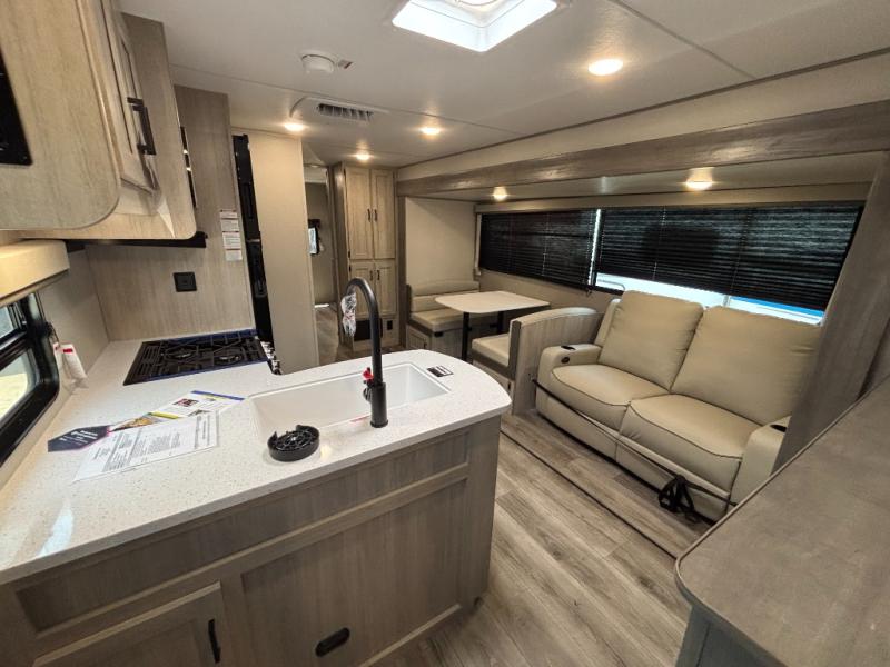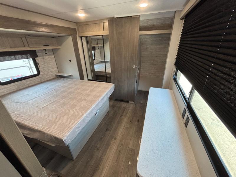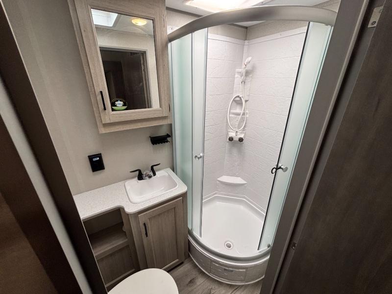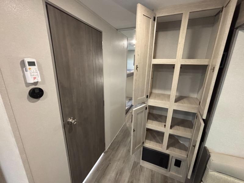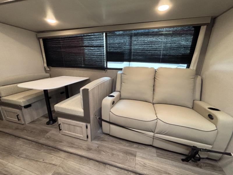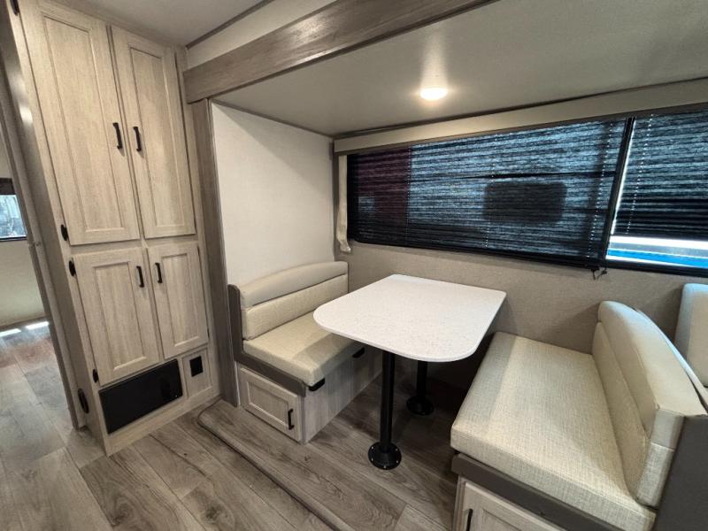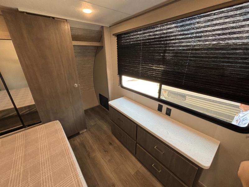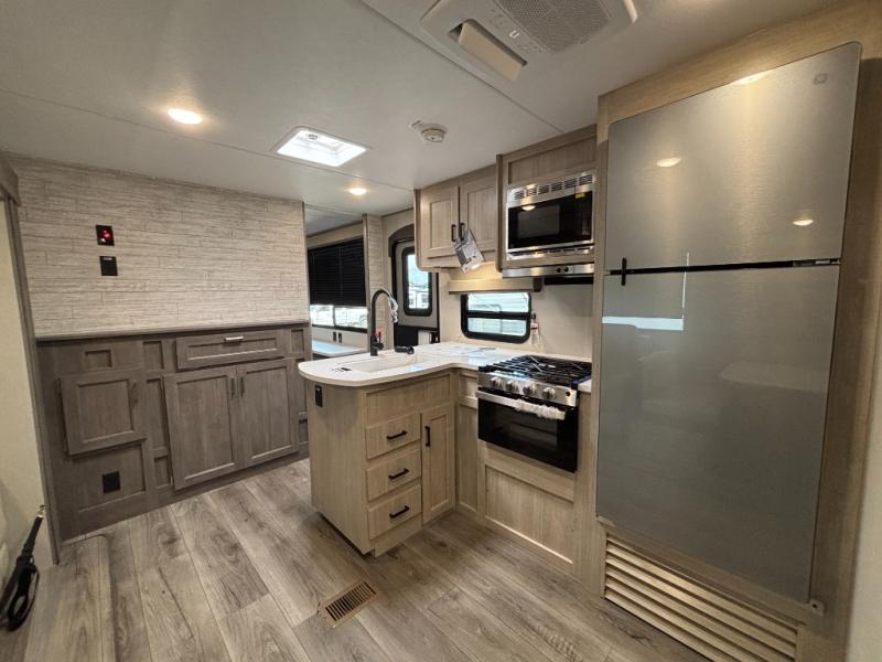 This family-friendly trailer offers lots of floor space thanks to the triple slides throughout! You and your family will love the combined living and kitchen area with a slide out booth dinette and a sofa with drink holders. The L-shaped kitchen counter allows the cook to make meals without moving for anyone trying to get to the full bathroom or the rear bunkhouse. The kids will have their own privacy, two bunk beds, a jack knife sofa with storage totes below plus a TV/wardrobe cabinet. The front private bedroom allows you to sleep like royalty and offers a large closet for your clothing and another closet prepped for a washer/dryer. And don't forget about the full-size camper kitchen and the 21' power awning with multicolor LED lights when you are outside.