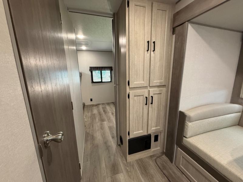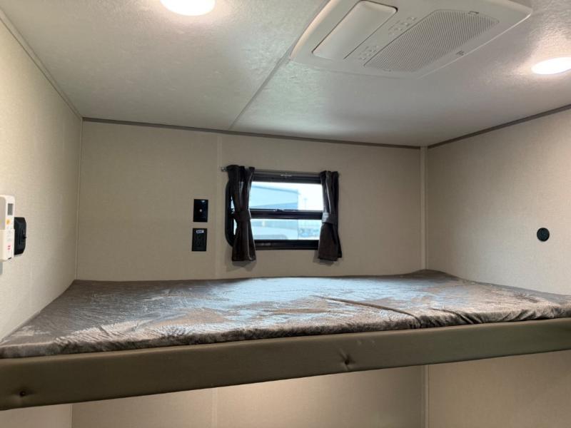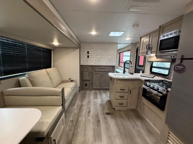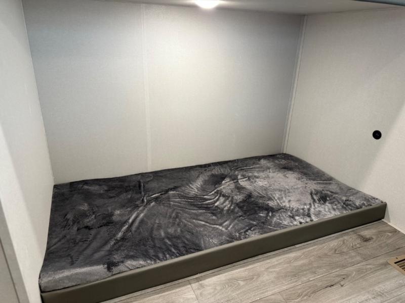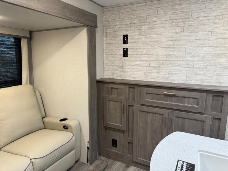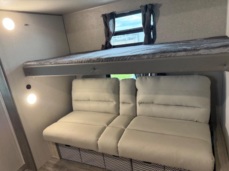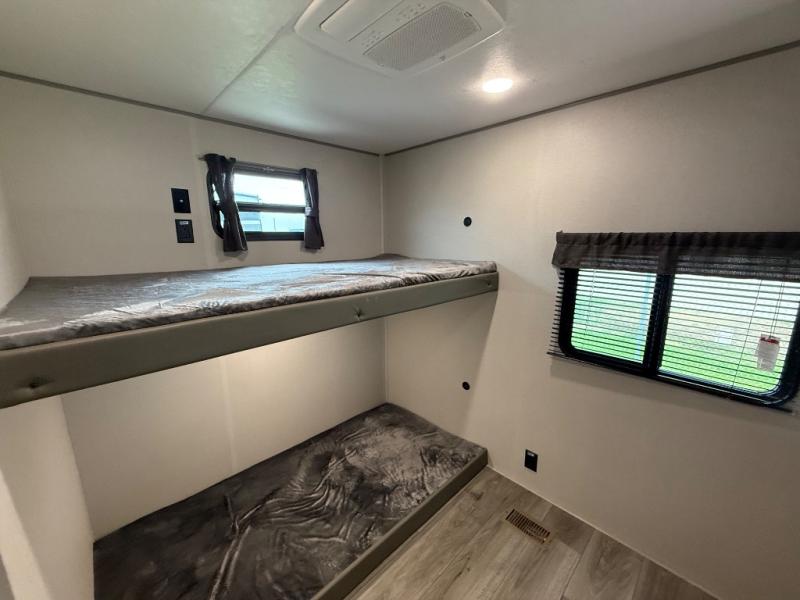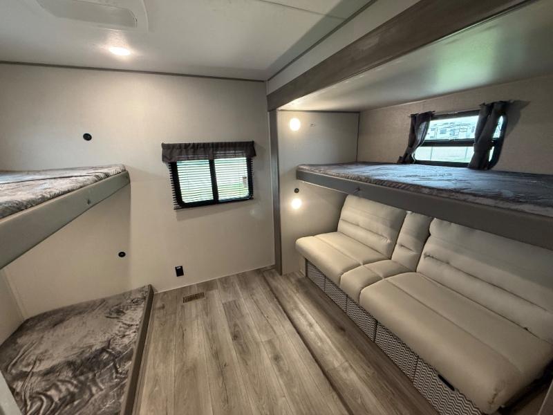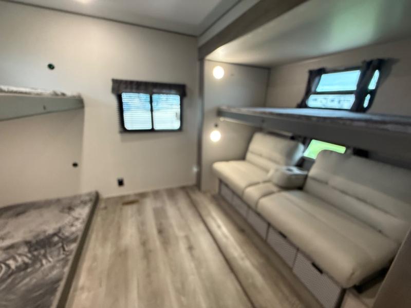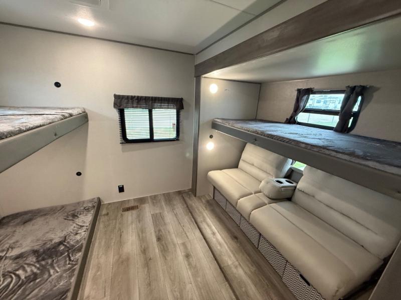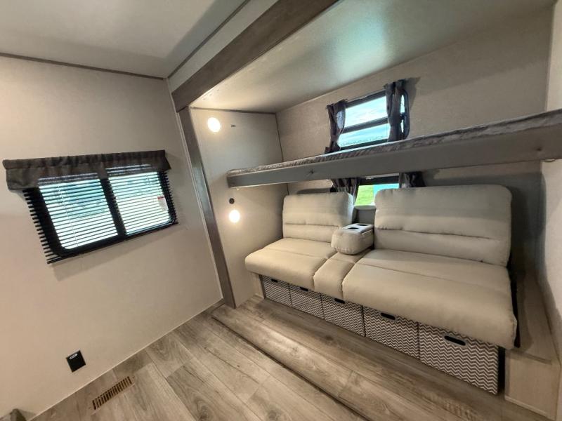 This family-friendly trailer offers lots of floor space thanks to the triple slides throughout! You and your family will love the combined living and kitchen area with a slide out booth dinette and a sofa with drink holders. The L-shaped kitchen counter allows the cook to make meals without moving for anyone trying to get to the full bathroom or the rear bunkhouse. The kids will have their own privacy, two bunk beds, a jack knife sofa with storage totes below plus a TV/wardrobe cabinet. The front private bedroom allows you to sleep like royalty and offers a large closet for your clothing and another closet prepped for a washer/dryer. And don't forget about the full-size camper kitchen and the 21' power awning with multicolor LED lights when you are outside.