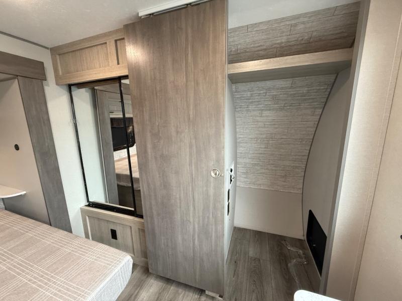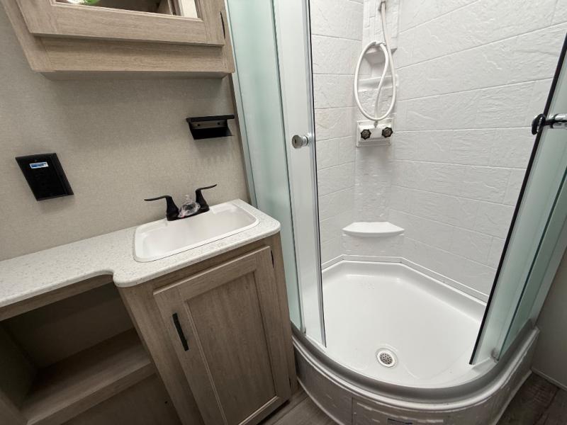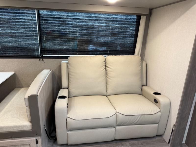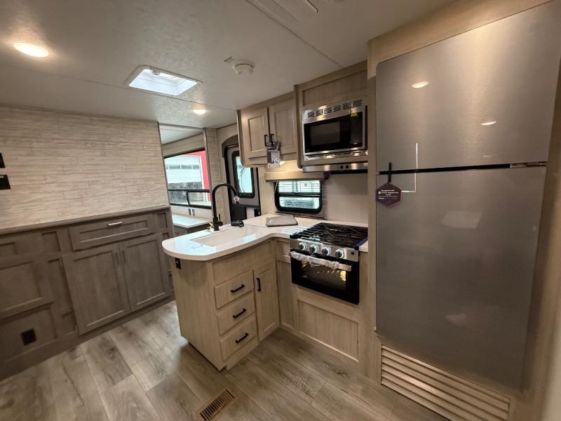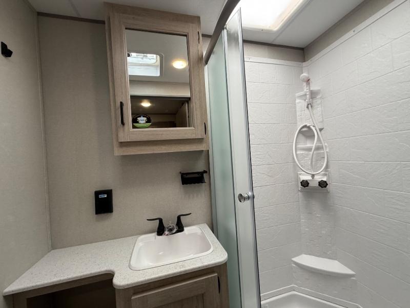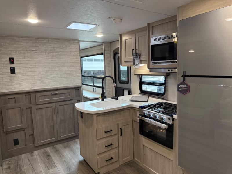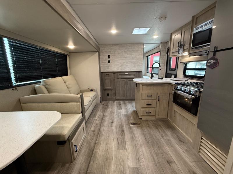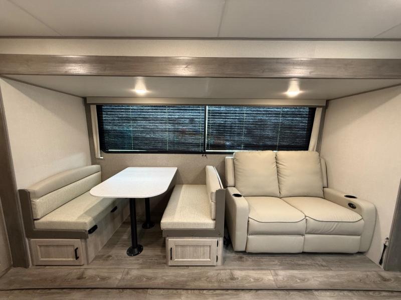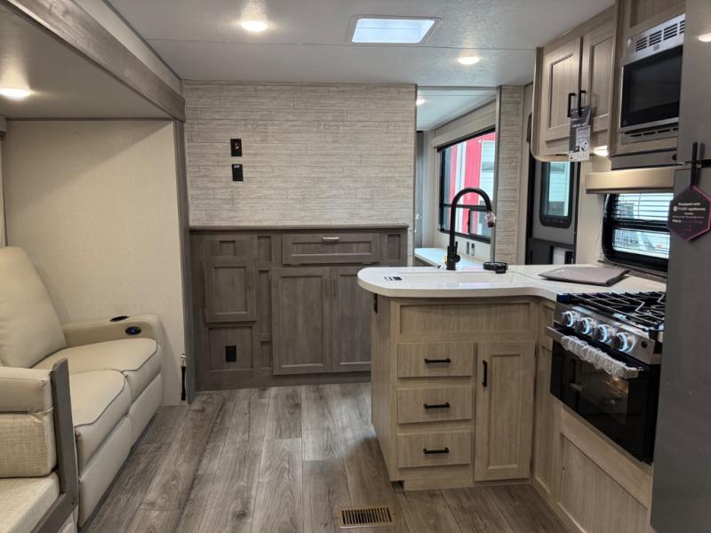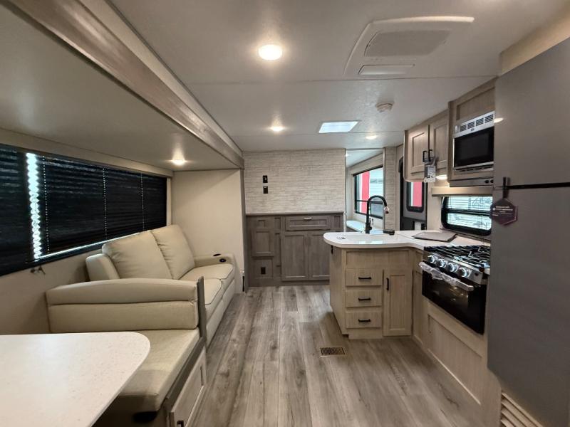This family-friendly trailer offers lots of floor space thanks to the triple slides throughout! You and your family will love the combined living and kitchen area with a slide out booth dinette and a sofa with drink holders. The L-shaped kitchen counter allows the cook to make meals without moving for anyone trying to get to the full bathroom or the rear bunkhouse. The kids will have their own privacy, two bunk beds, a jack knife sofa with storage totes below plus a TV/wardrobe cabinet. The front private bedroom allows you to sleep like royalty and offers a large closet for your clothing and another closet prepped for a washer/dryer. And don't forget about the full-size camper kitchen and the 21' power awning with multicolor LED lights when you are outside.
