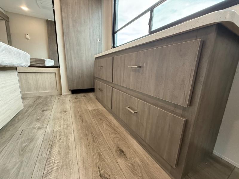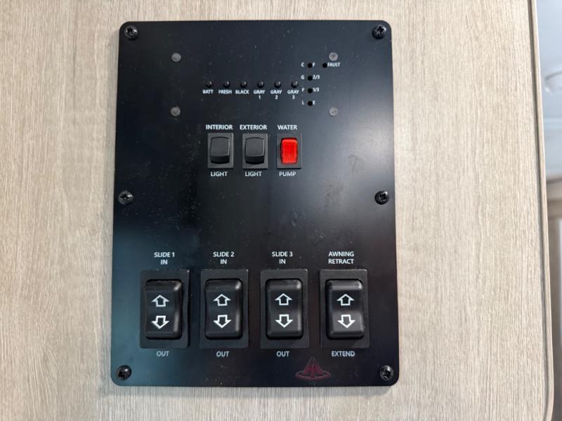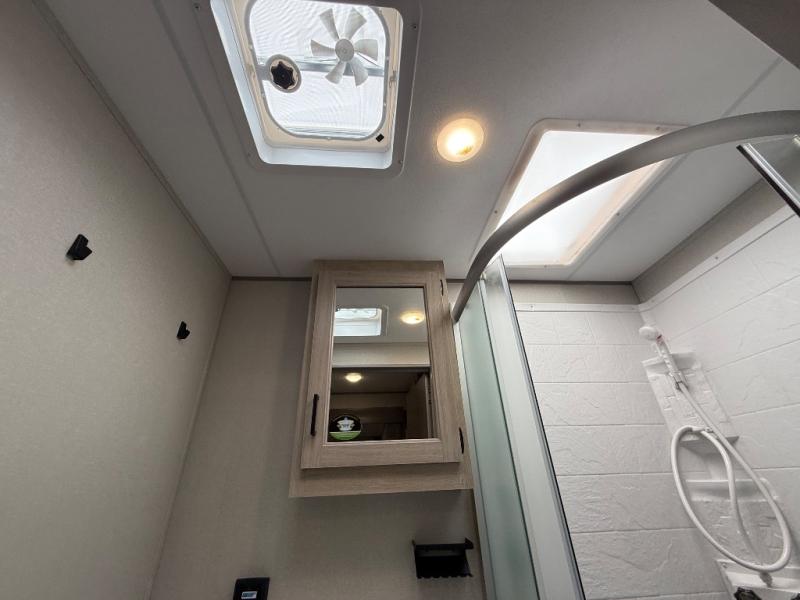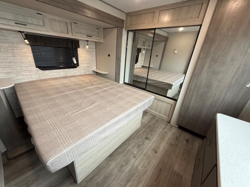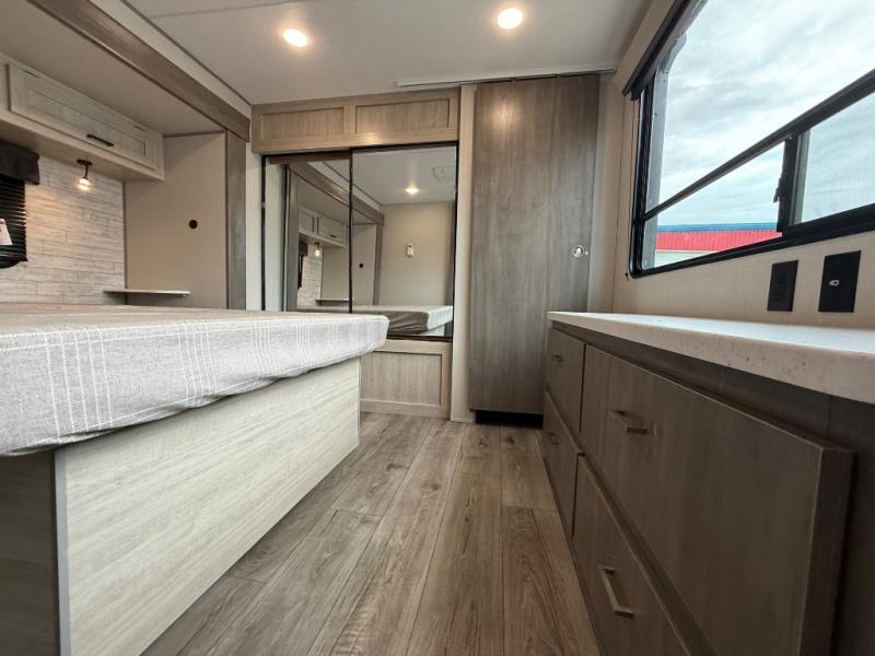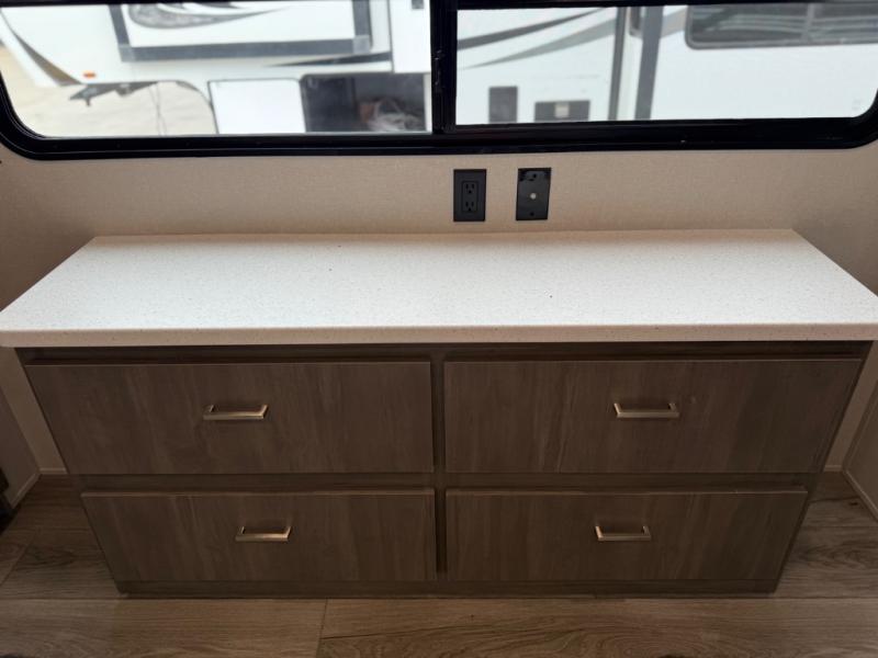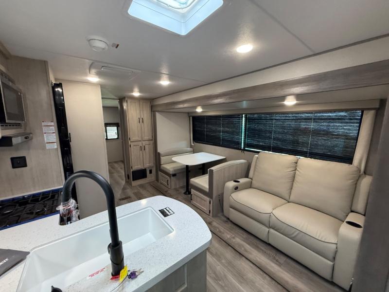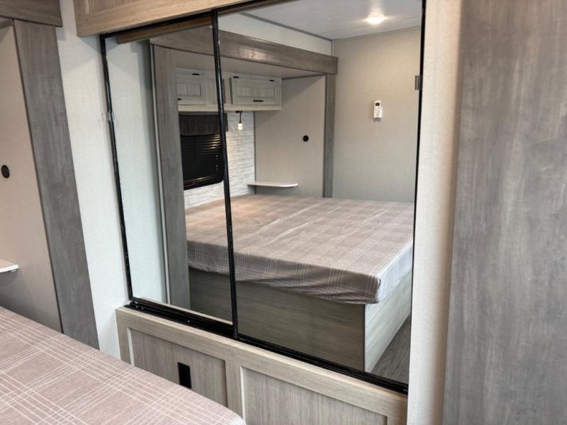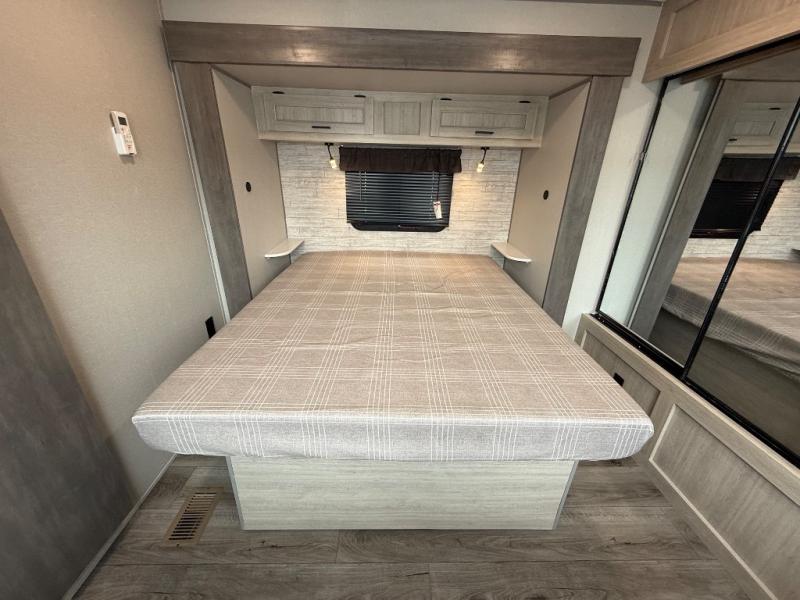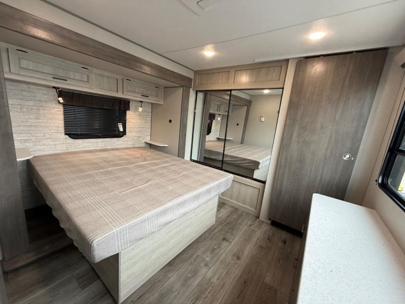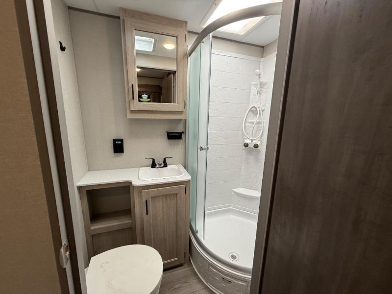 This family-friendly trailer offers lots of floor space thanks to the triple slides throughout! You and your family will love the combined living and kitchen area with a slide out booth dinette and a sofa with drink holders. The L-shaped kitchen counter allows the cook to make meals without moving for anyone trying to get to the full bathroom or the rear bunkhouse. The kids will have their own privacy, two bunk beds, a jack knife sofa with storage totes below plus a TV/wardrobe cabinet. The front private bedroom allows you to sleep like royalty and offers a large closet for your clothing and another closet prepped for a washer/dryer. And don't forget about the full-size camper kitchen and the 21' power awning with multicolor LED lights when you are outside.