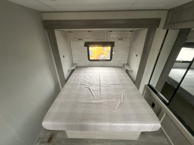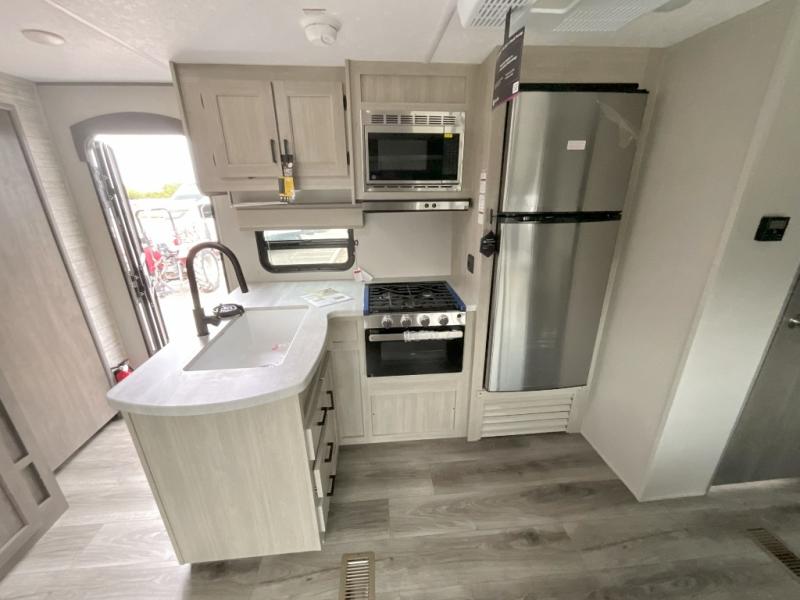This family-friendly trailer offers lots of floor space thanks to the triple slides throughout! You and your family will love the combined living and kitchen area with a slide out booth dinette and a sofa with drink holders. The L-shaped kitchen counter allows the cook to make meals without moving for anyone trying to get to the full bathroom or the rear bunkhouse. The kids will have their own privacy, two bunk beds, a jack knife sofa with storage totes below plus a TV/wardrobe cabinet. The front private bedroom allows you to sleep like royalty and offers a large closet for your clothing and another closet prepped for a washer/dryer. And don't forget about the full-size camper kitchen and the 21' power awning with multicolor LED lights when you are outside.