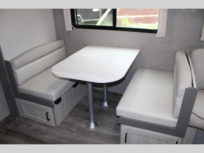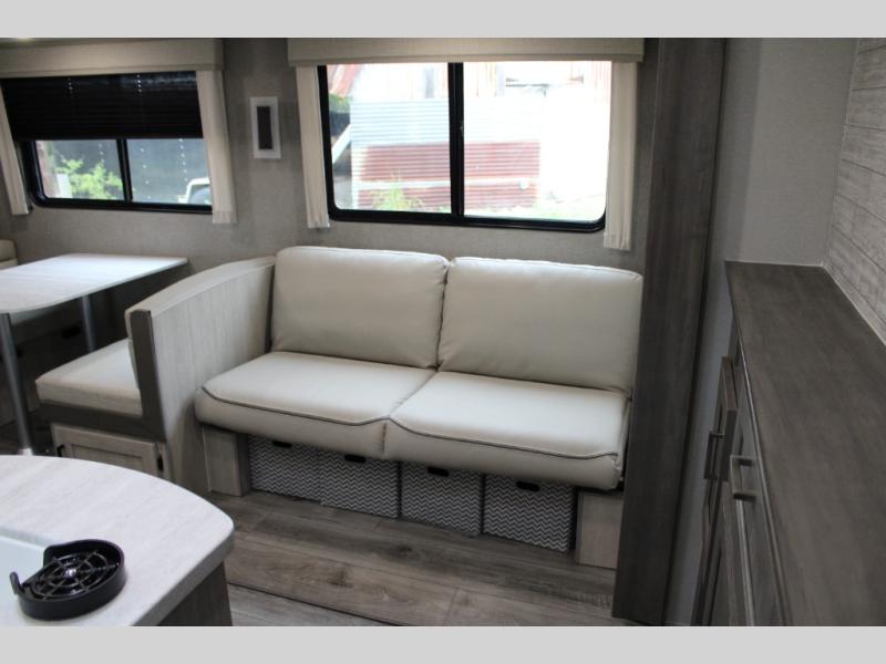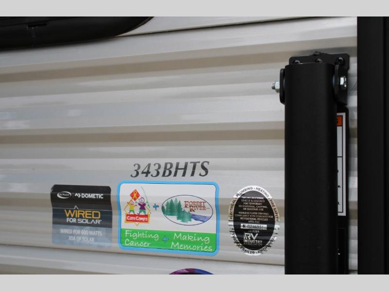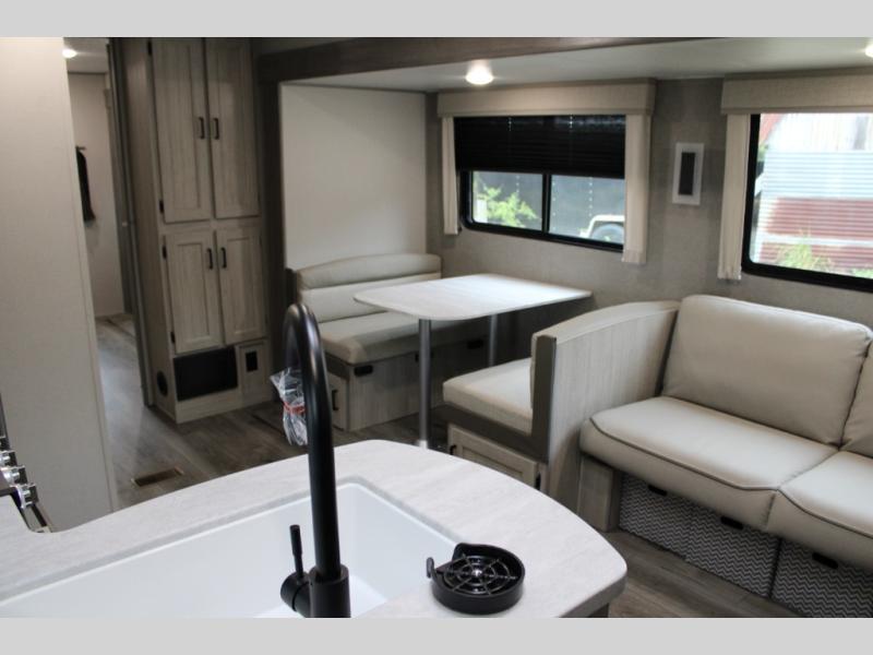 This family-friendly trailer offers lots of floor space thanks to the triple slides throughout! You and your family will love the combined living and kitchen area with a slide out booth dinette and a sofa with drink holders. The L-shaped kitchen counter allows the cook to make meals without moving for anyone trying to get to the full bathroom or the rear bunkhouse. The kids will have their own privacy, two bunk beds, a jack knife sofa with storage totes below plus a TV/wardrobe cabinet. The front private bedroom allows you to sleep like royalty and offers a large closet for your clothing and another closet prepped for a washer/dryer. And don't forget about the full-size camper kitchen and the 21' power awning with multicolor LED lights when you are outside.