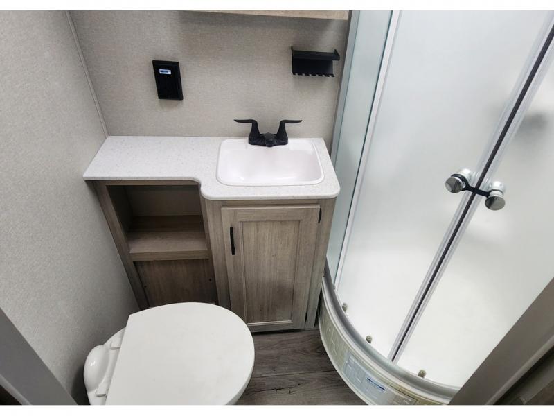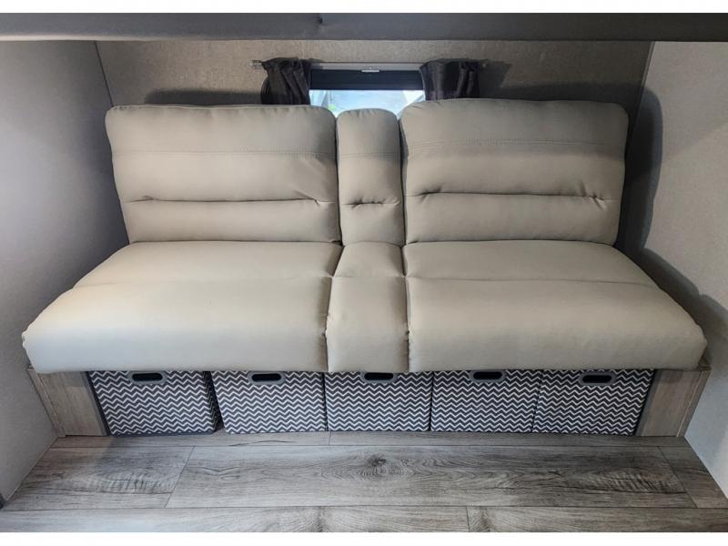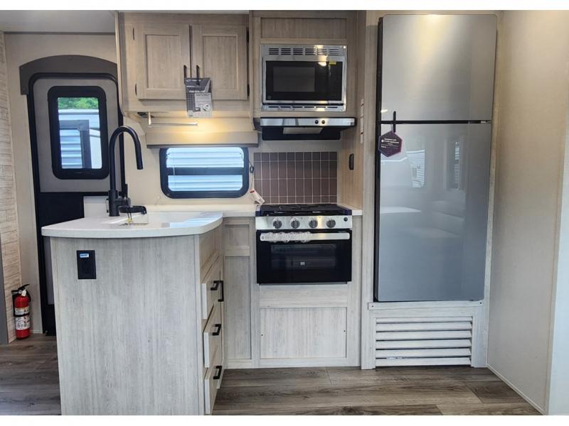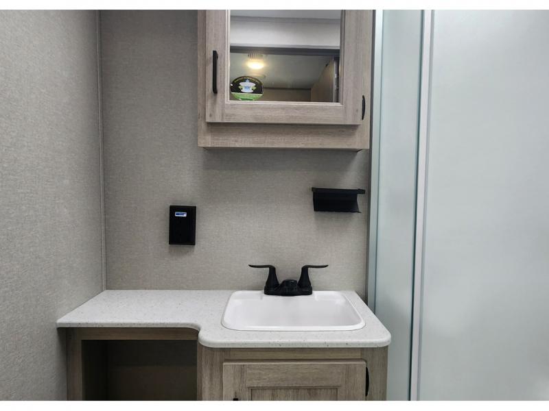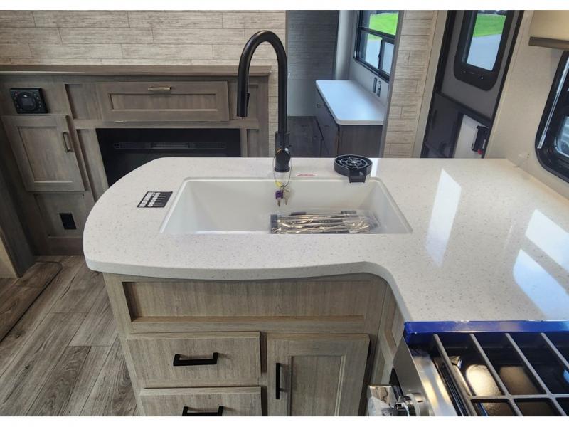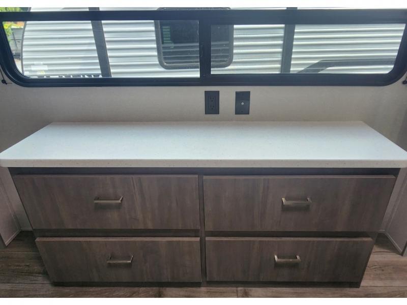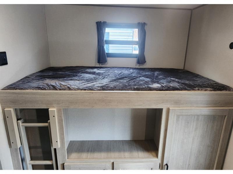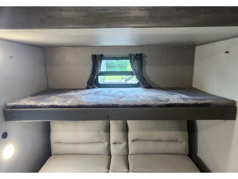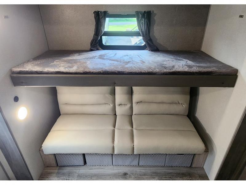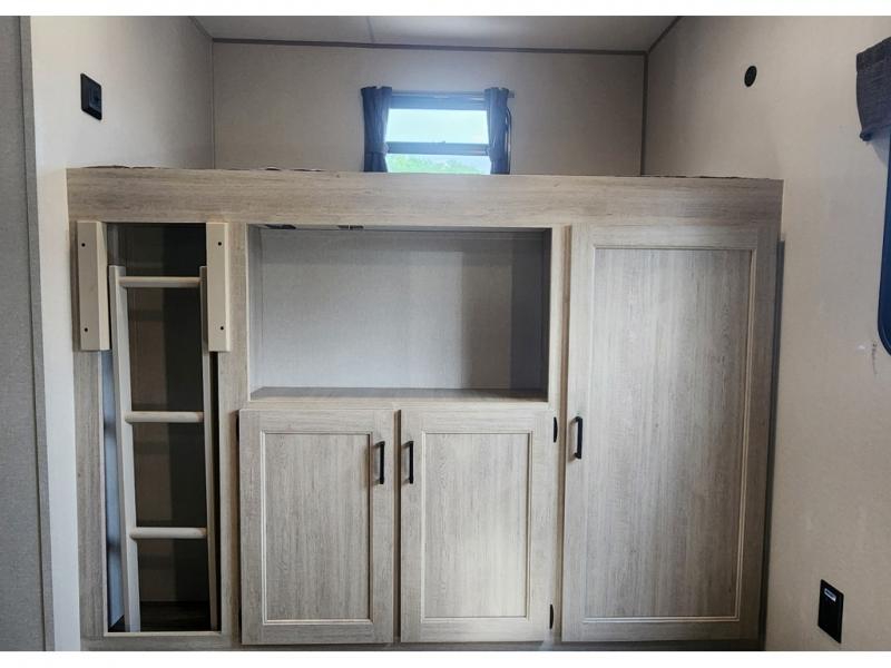 This family-friendly trailer offers lots of floor space thanks to the triple slides throughout! You and your family will love the combined living and kitchen area with a slide out booth dinette and a sofa with drink holders. The L-shaped kitchen counter allows the cook to make meals without moving for anyone trying to get to the full bathroom or the rear bunkhouse. The kids will have their own privacy, two bunk beds, a jack knife sofa with storage totes below plus a TV/wardrobe cabinet. The front private bedroom allows you to sleep like royalty, and offers a large closet for your clothing and another closet prepped for a washer/dryer. And don't forget about the full size camper kitchen and the 21' power awning with multicolor LED lights when you are outside.