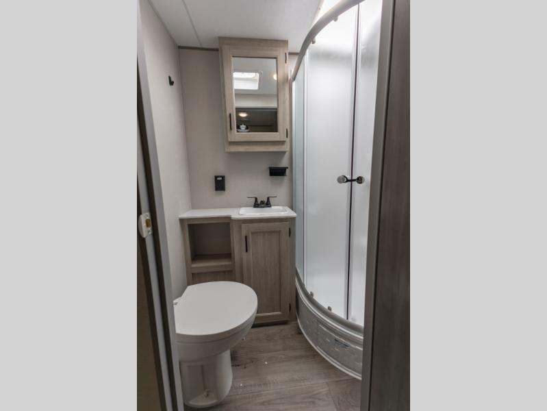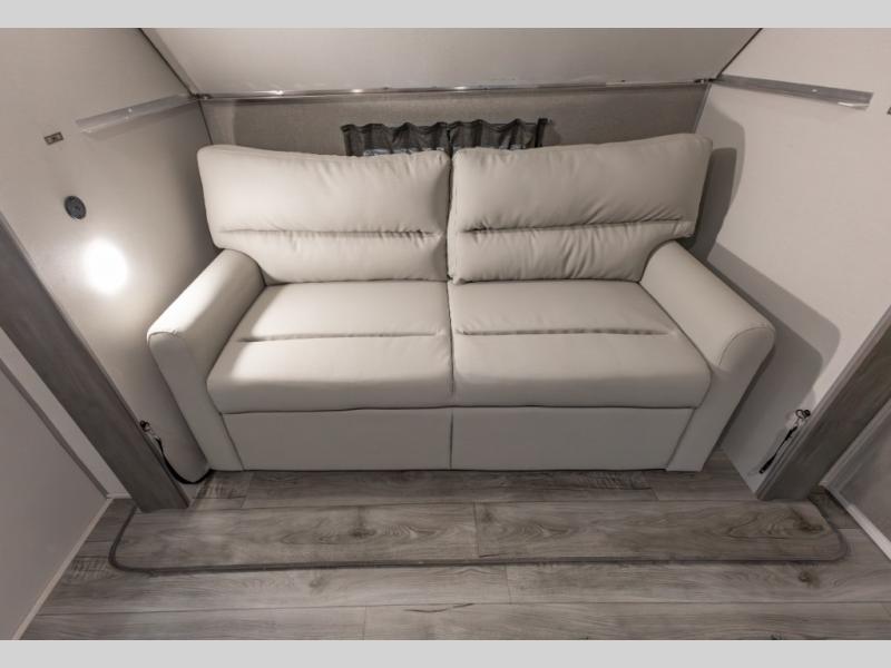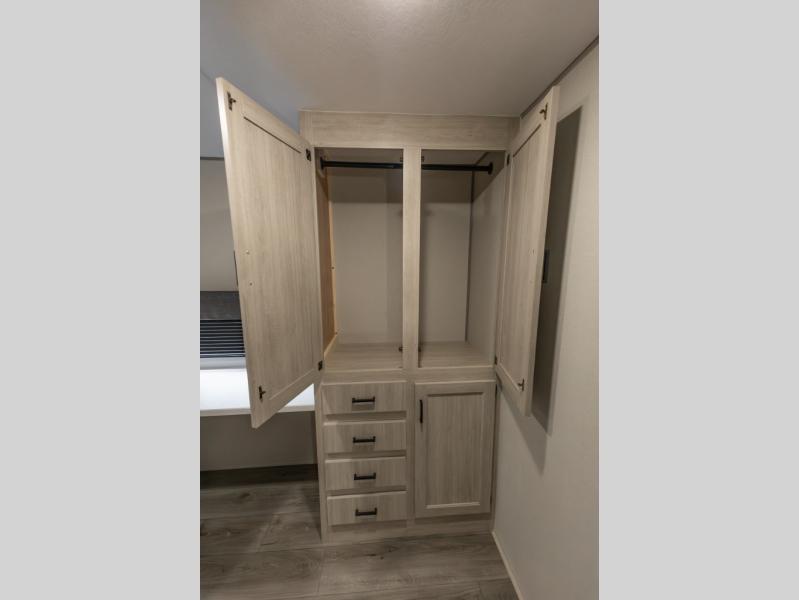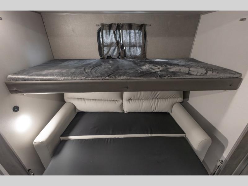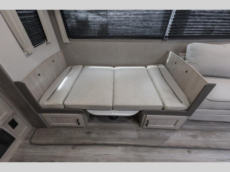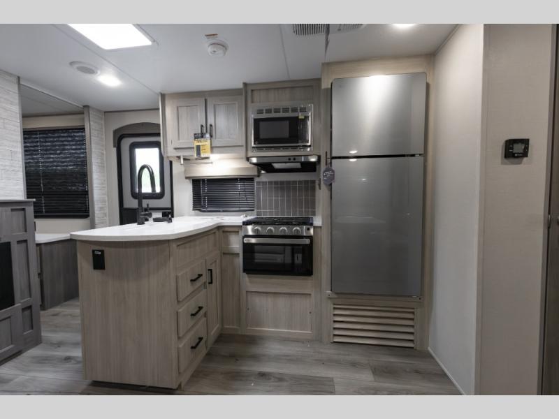 This family-friendly trailer offers lots of floor space thanks to the triple slides throughout! You and your family will love the combined living and kitchen area with a slide out booth dinette and a sofa with drink holders. The L-shaped kitchen counter allows the cook to make meals without moving for anyone trying to get to the full bathroom or the rear bunkhouse. The kids will have their own privacy, two bunk beds, a jack knife sofa with storage totes below plus a TV/wardrobe cabinet. The front private bedroom allows you to sleep like royalty, and offers a large closet for your clothing and another closet prepped for a washer/dryer. And don't forget about the full size camper kitchen and the 21' power awning with multicolor LED lights when you are outside.