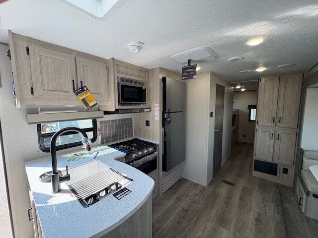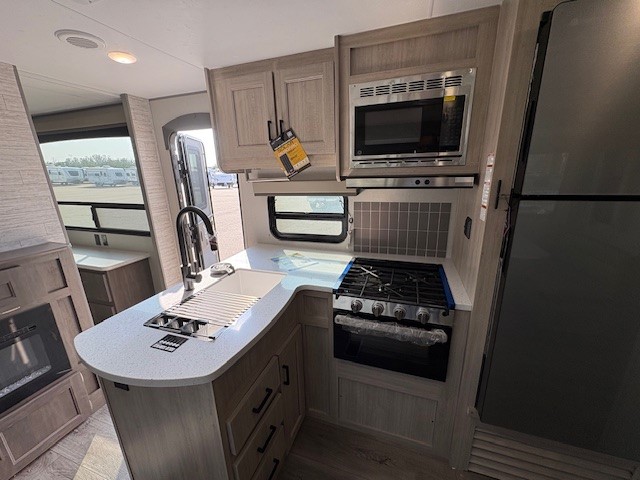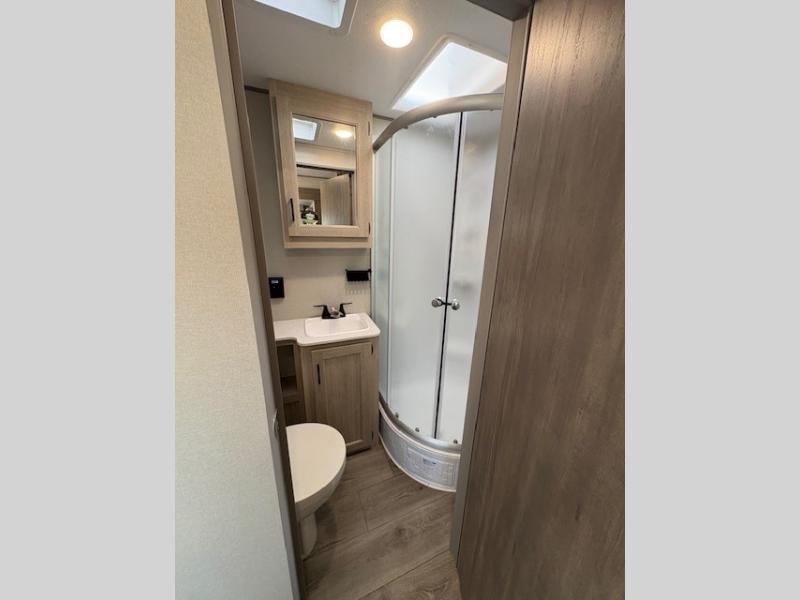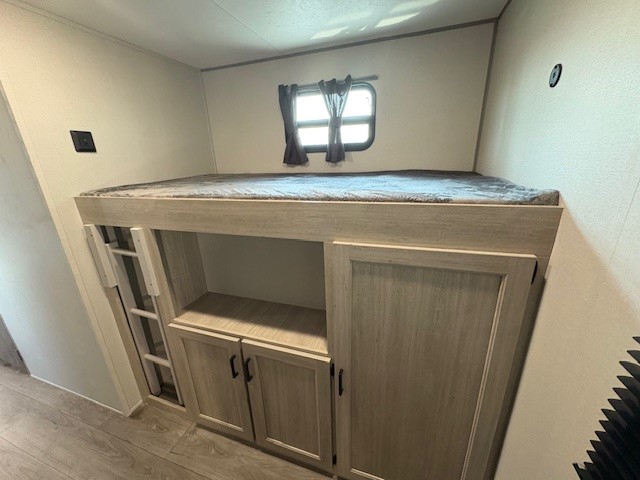 This family-friendly trailer offers lots of floor space thanks to the triple slides throughout! You and your family will love the combined living and kitchen area with a slide out booth dinette and a sofa with drink holders. The L-shaped kitchen counter allows the cook to make meals without moving for anyone trying to get to the full bathroom or the rear bunkhouse. The kids will have their own privacy, two bunk beds, a jack knife sofa with storage totes below plus a TV/wardrobe cabinet. The front private bedroom allows you to sleep like royalty, and offers a large closet for your clothing and another closet prepped for a washer/dryer. And don't forget about the full size camper kitchen and the 21' power awning with multicolor LED lights when you are outside.