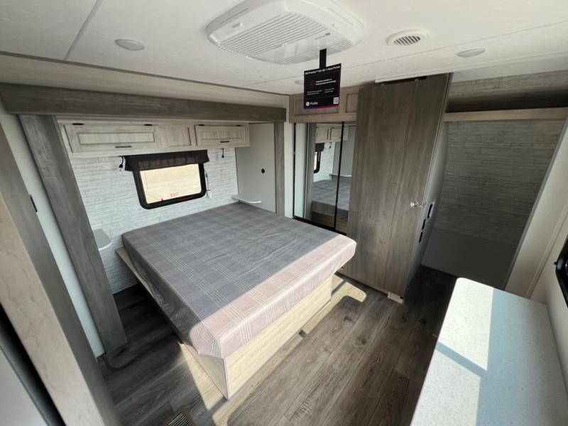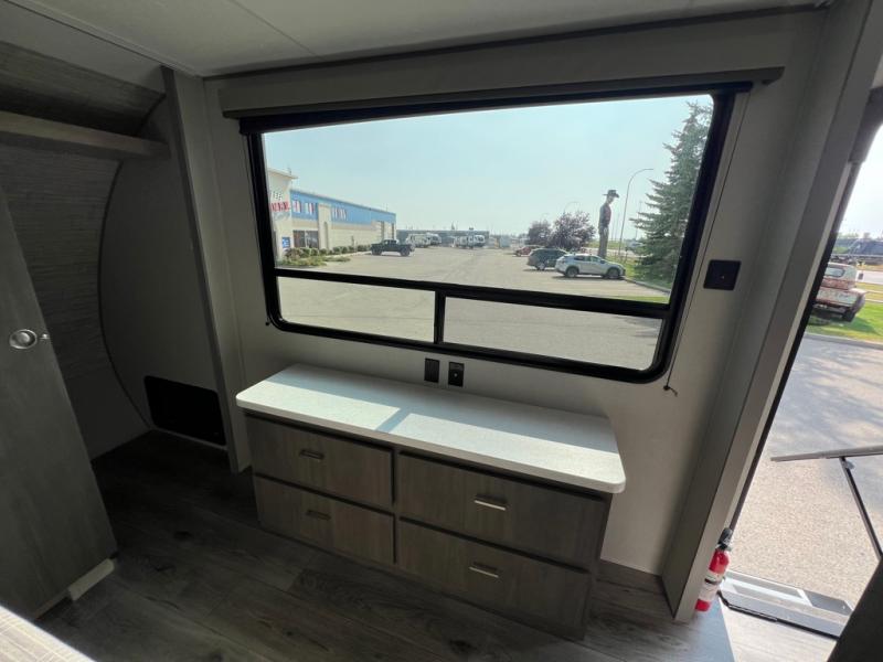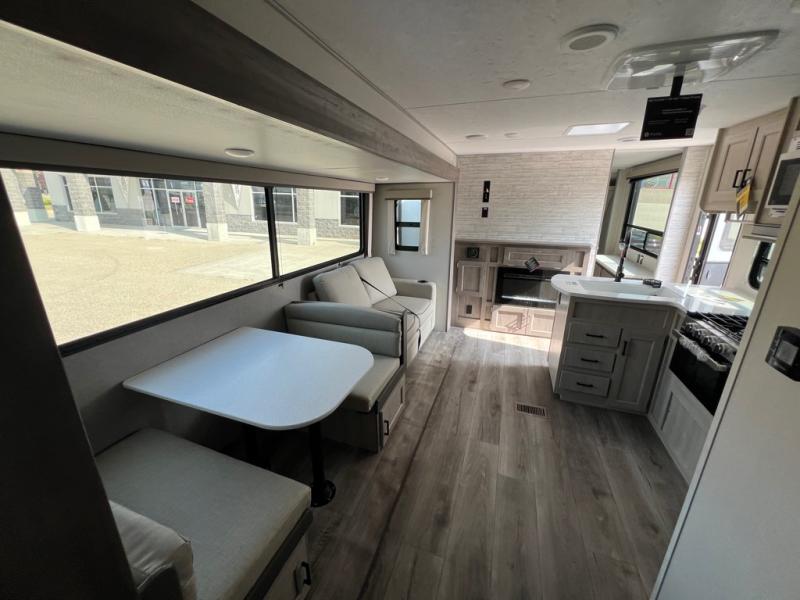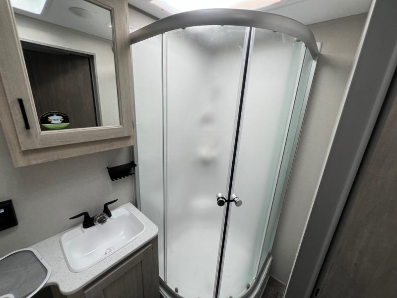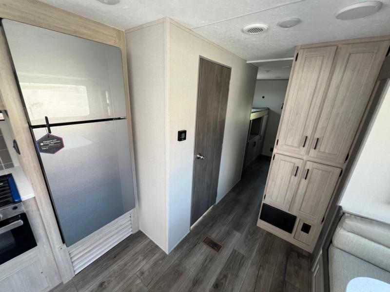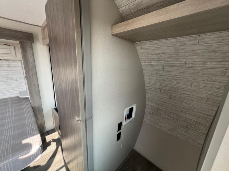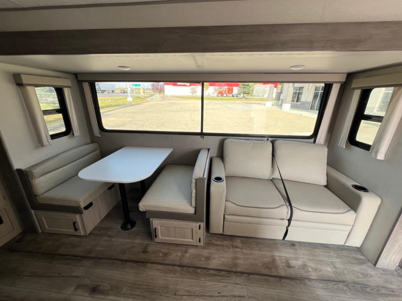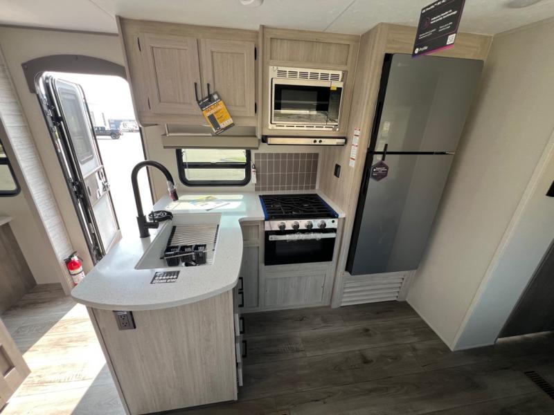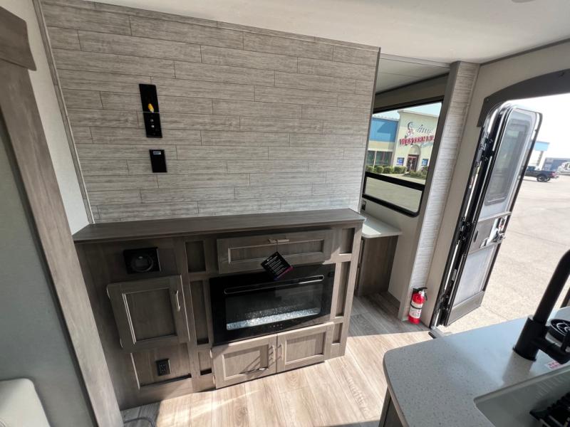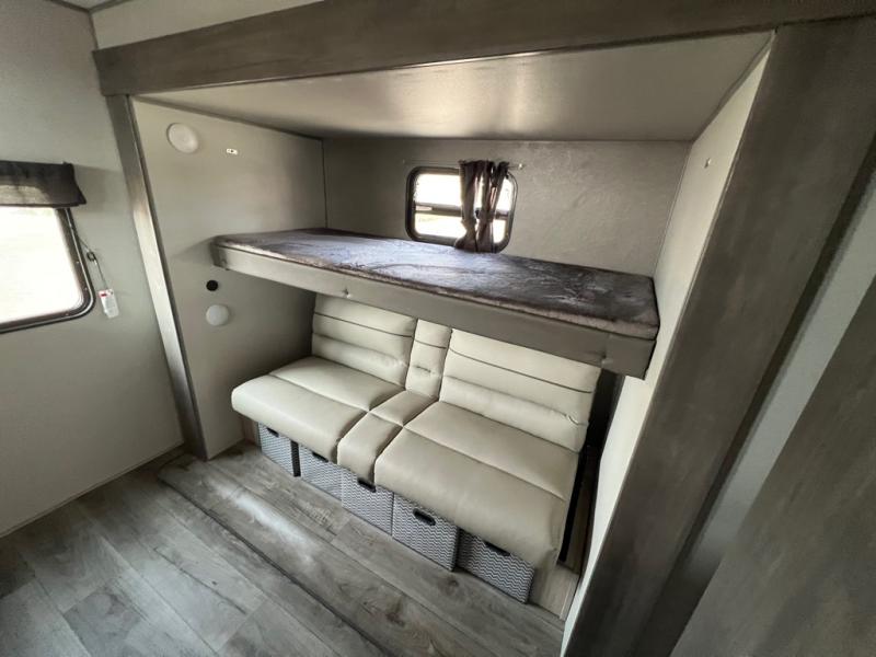 This family-friendly trailer offers lots of floor space thanks to the triple slides throughout! You and your family will love the combined living and kitchen area with a slide out booth dinette and a sofa with drink holders. The L-shaped kitchen counter allows the cook to make meals without moving for anyone trying to get to the full bathroom or the rear bunkhouse. The kids will have their own privacy, two bunk beds, a jack knife sofa with storage totes below plus a TV/wardrobe cabinet. The front private bedroom allows you to sleep like royalty, and offers a large closet for your clothing and another closet prepped for a washer/dryer. And don't forget about the full size camper kitchen and the 21' power awning with multicolor LED lights when you are outside.