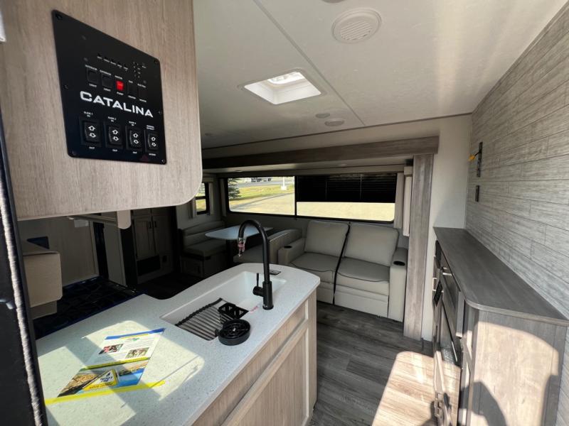 Each Catalina Legacy travel trailer by Coachmen is constructed with a cambered structural steel I-beam frame for added strength and support, plus an enclosed and fully sealed corrugated underbelly to extend your camping season. There is also a seamless Alpha roof membrane, R-7 insulation throughout, full length frame outriggers, plus many more durable construction materials. You will love the 6' 9" interior height, along with Congoleum woodplank linoleum flooring, seamless Thermofoil countertops, and hard valance window treatments. Choose a Catalina Legacy today!