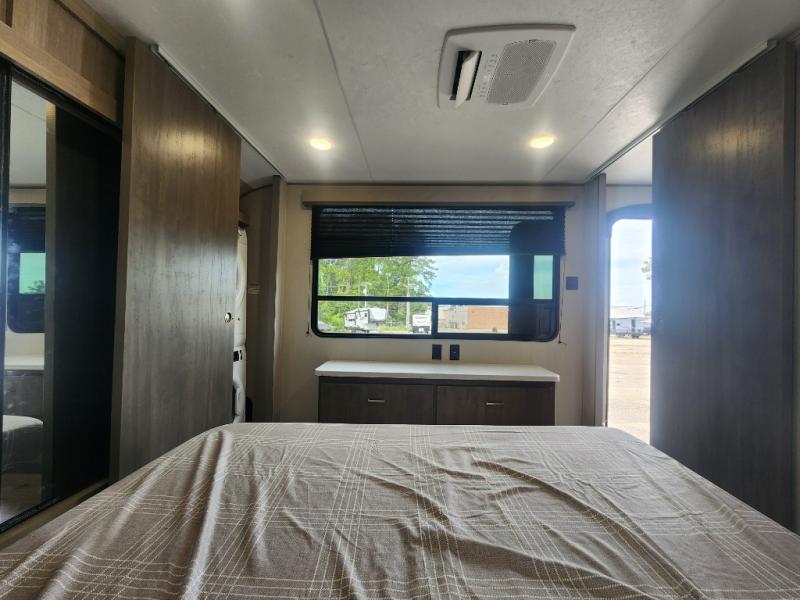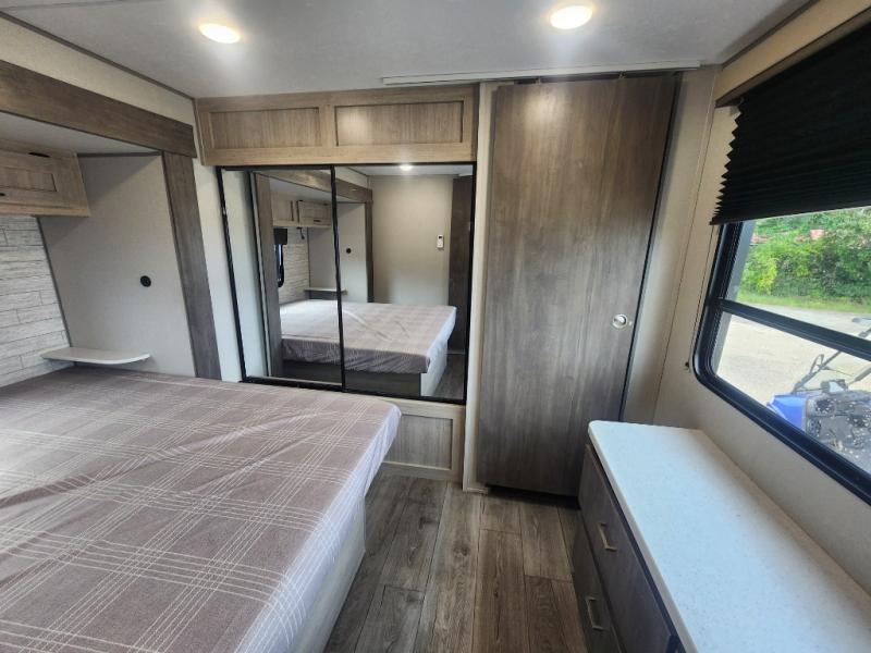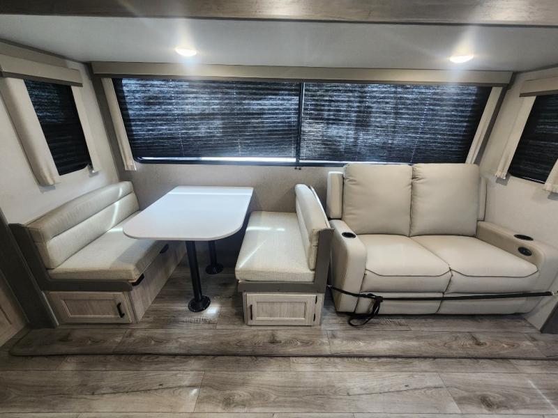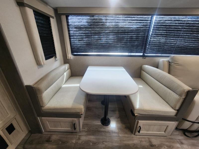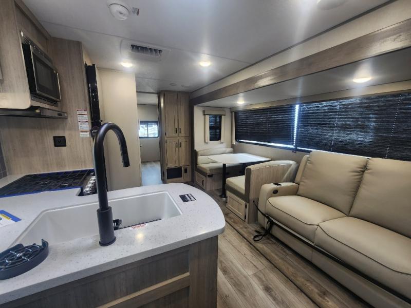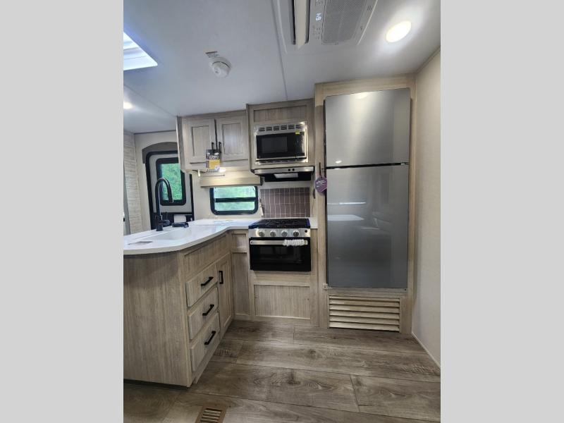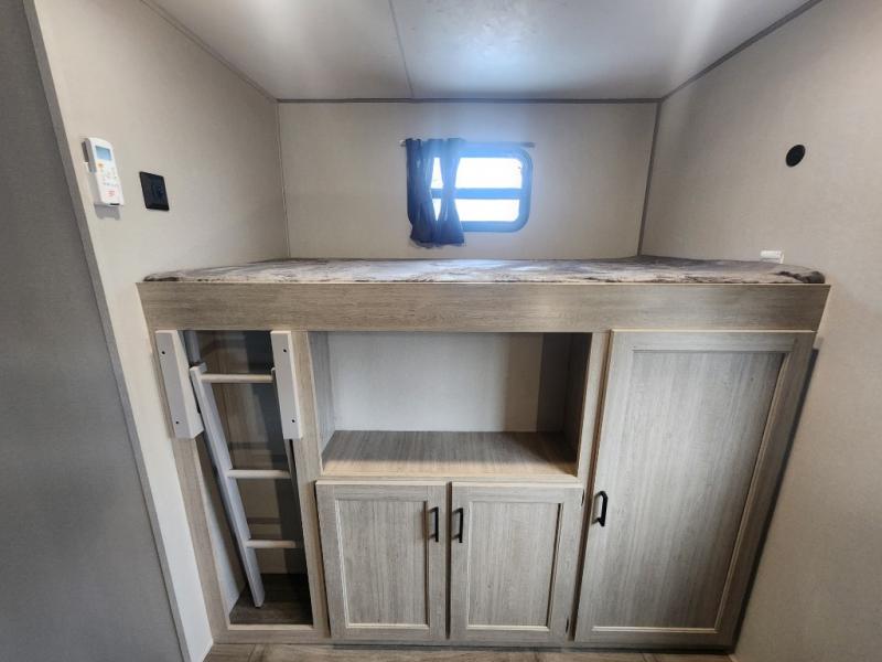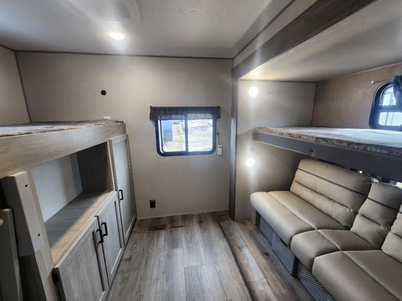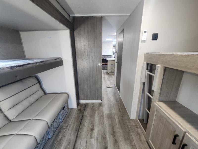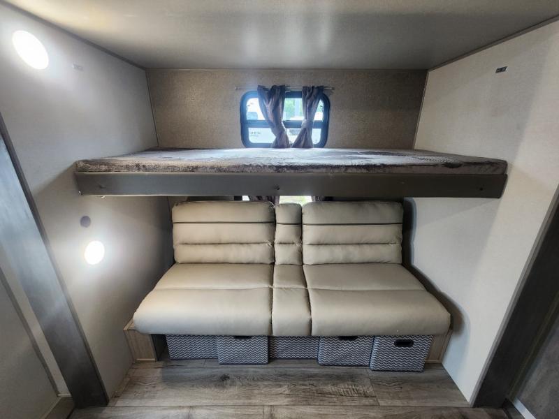 This family-friendly trailer offers lots of floor space thanks to the triple slides throughout! You and your family will love the combined living and kitchen area with a slide out booth dinette and a sofa with drink holders. The L-shaped kitchen counter allows the cook to make meals without moving for anyone trying to get to the full bathroom or the rear bunkhouse. The kids will have their own privacy, two bunk beds, a jack knife sofa with storage totes below plus a TV/wardrobe cabinet. The front private bedroom allows you to sleep like royalty, and offers a large closet for your clothing and another closet prepped for a washer/dryer. And don't forget about the full size camper kitchen and the 21' power awning with multicolor LED lights when you are outside.